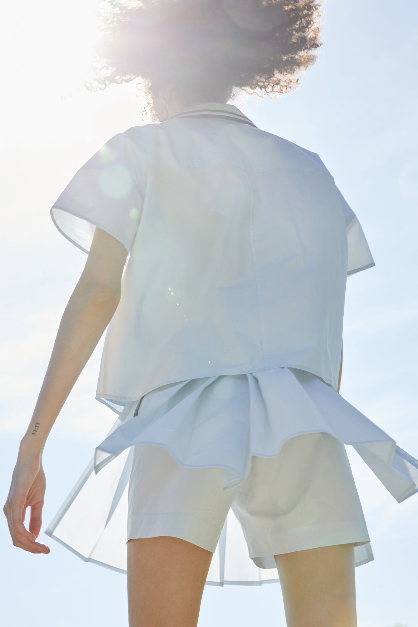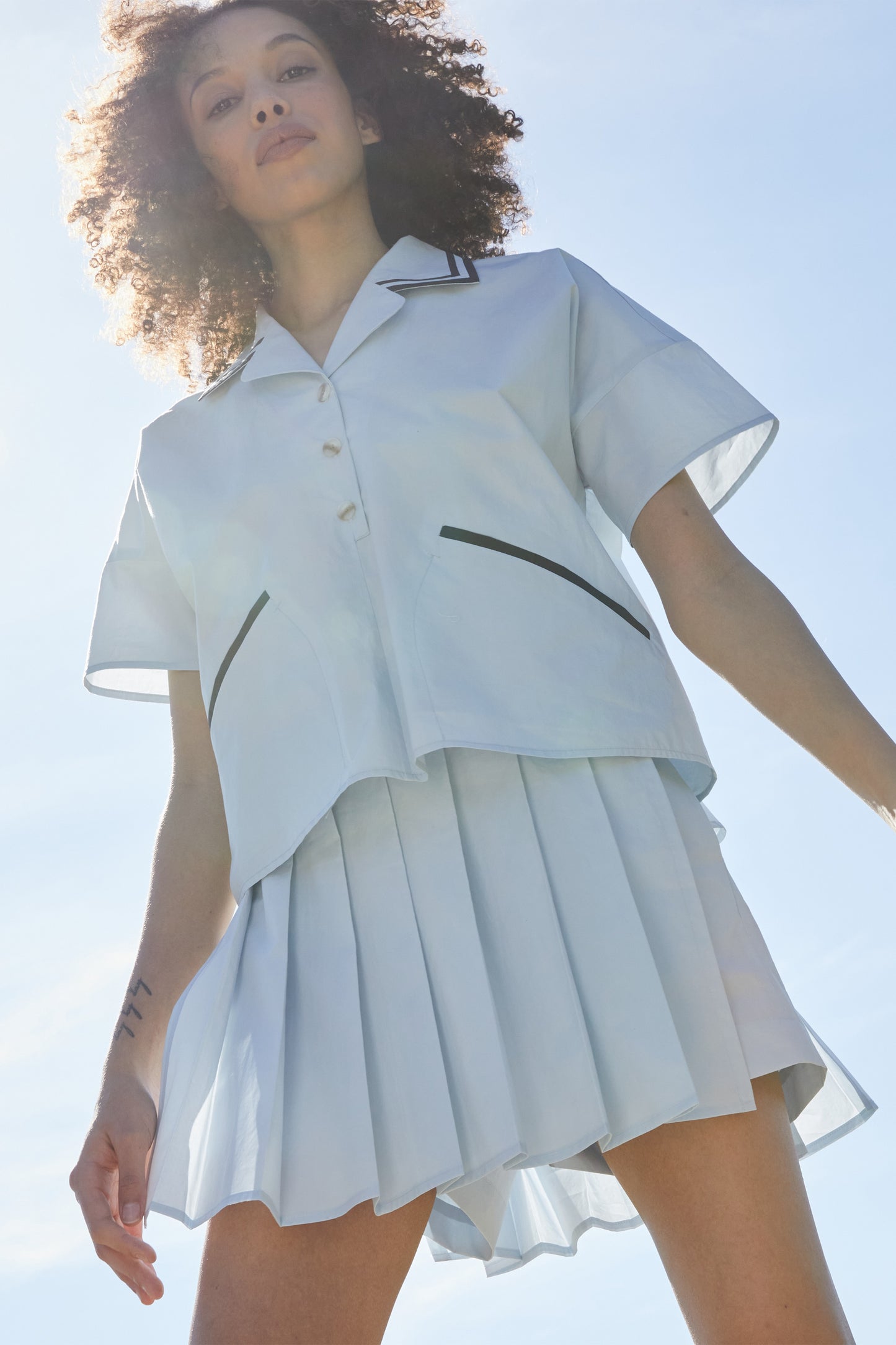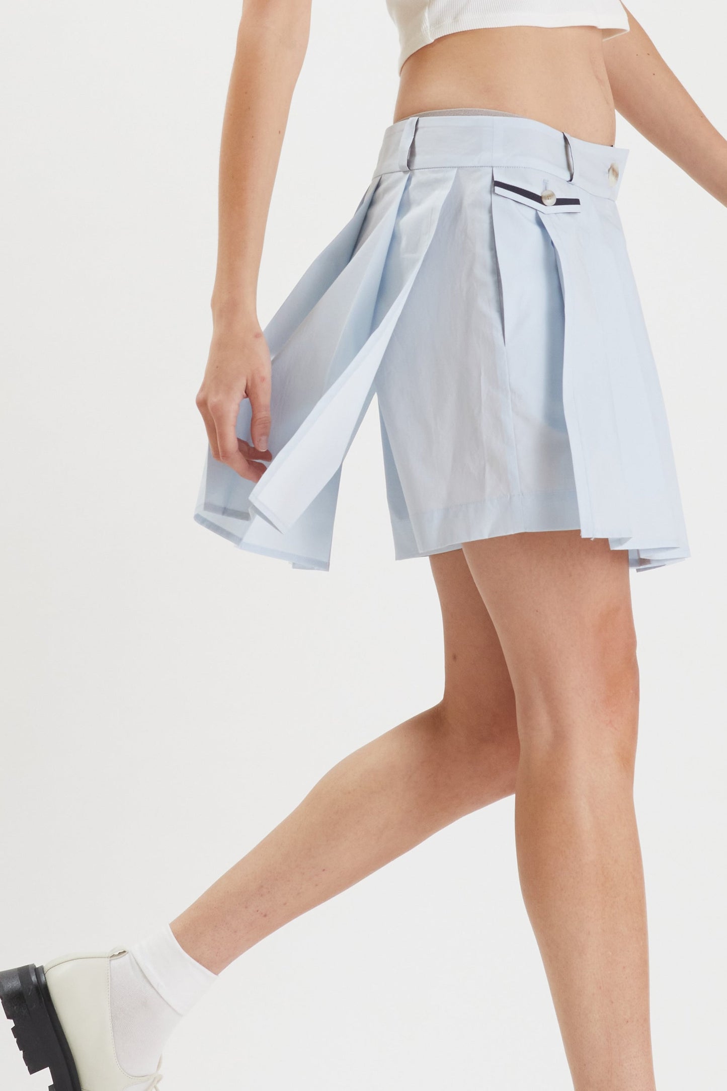 Our pleated kilted short in a cloud cotton print will lift your spirits to the sky this summer.