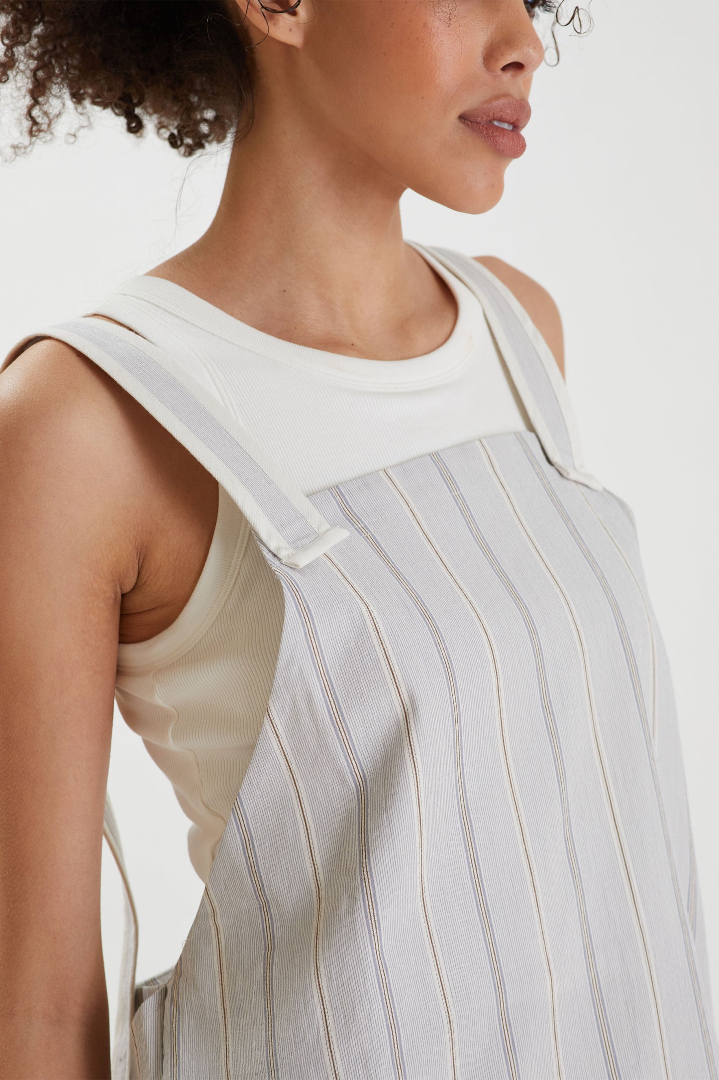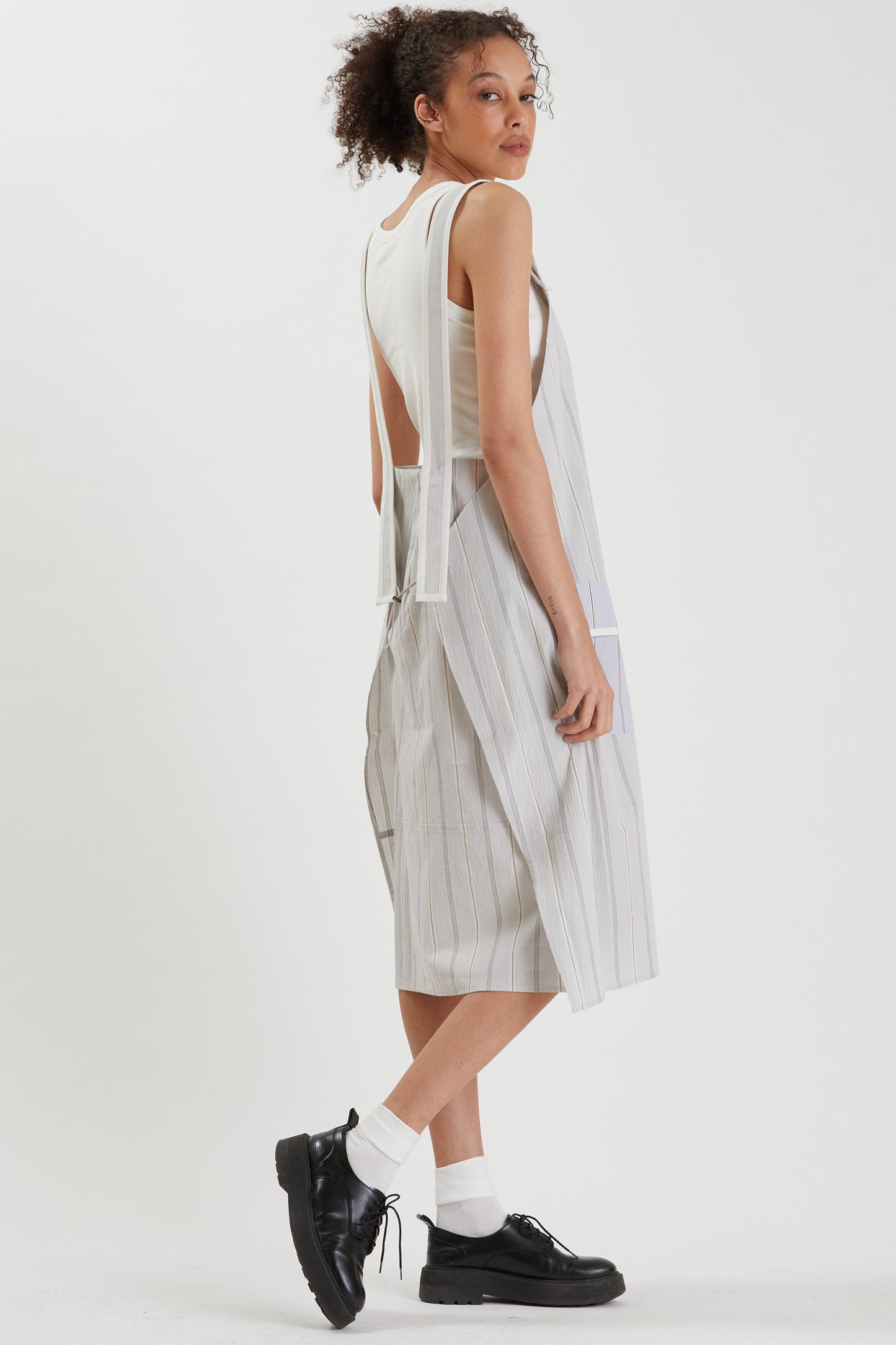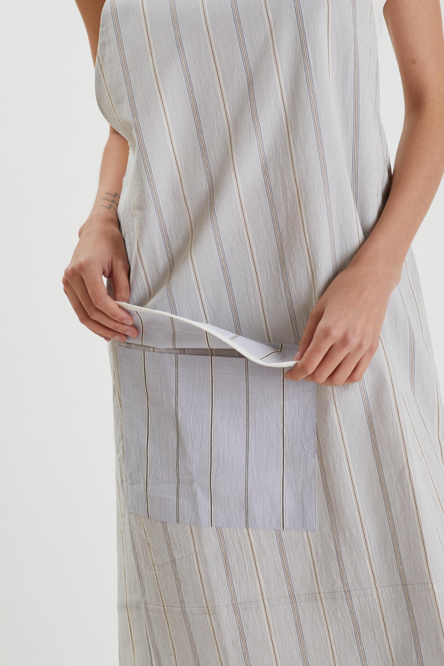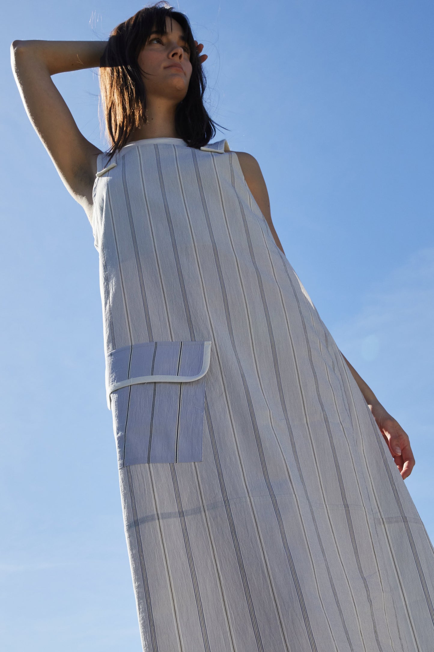 Our Apron Overall Dress is a captivating blend of style and functionality. With its maxi length silhouette and zipper closure at the back waist, this dress exudes effortless elegance. Crafted from cotton yarn dyed broadcloth with a subtle multi-color stripe, it offers an eye-catching and unique aesthetic. The front skirt wraps like an apron to the back, connecting with a two-way stopper for added versatility. Adjustable shoulder straps, secured with concealed buttons, ensure a comfortable fit for every body type. Adding a playful touch, an oversized, asymmetrical patch pocket in blue stripe fabric pops against the body, while contrast corduroy bindings at the shoulder straps and pocket flap provide subtle yet distinctive detailing. Casual and cool, our Apron Overall Dress is a cool look for summer.