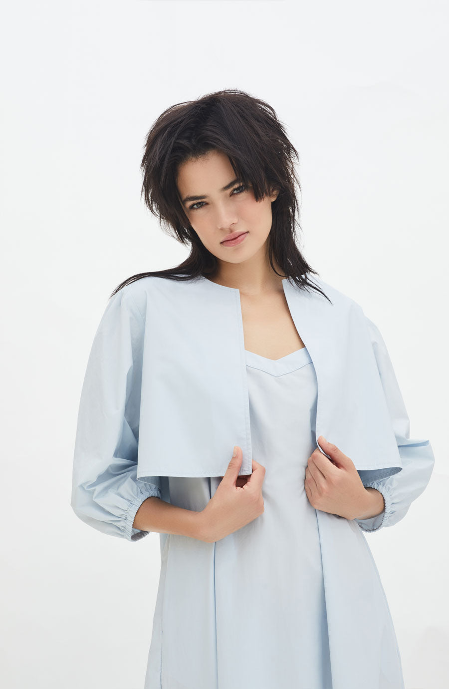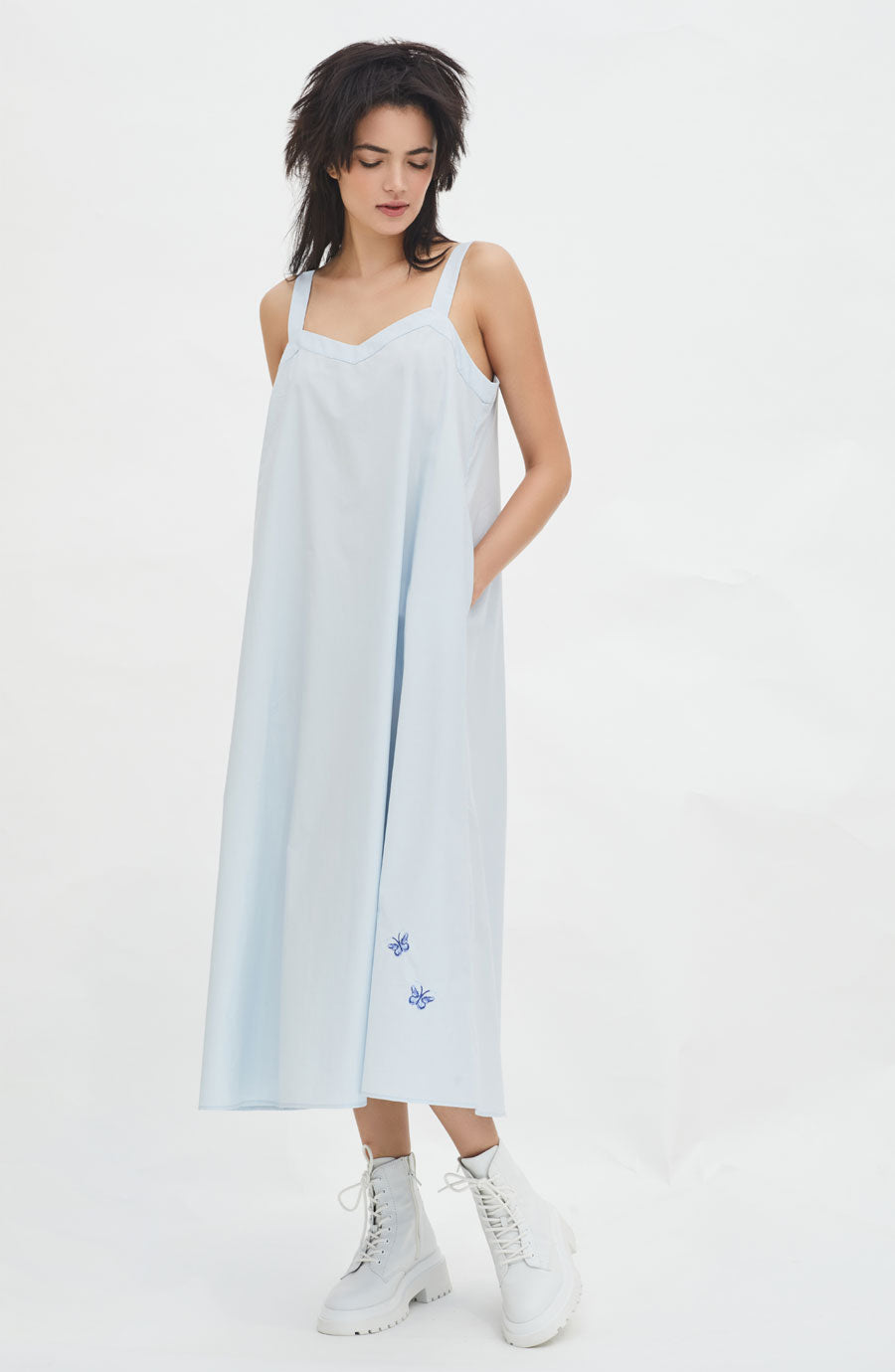 This charming powder blue slip dress has a slight A line shape with pleat detailing and pockets at the seam.