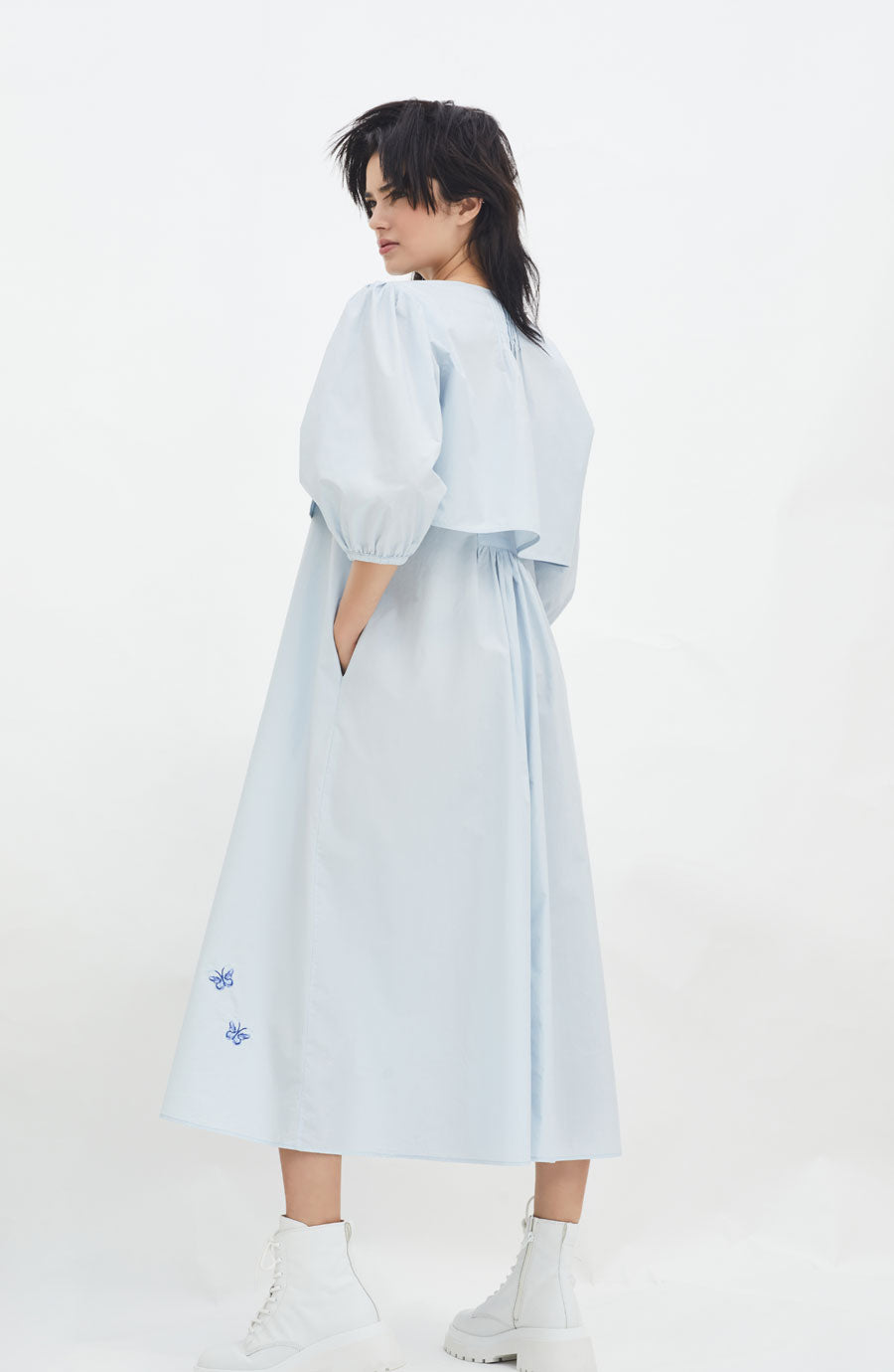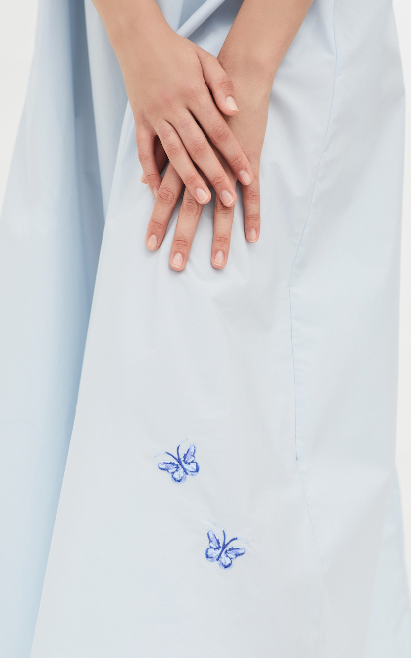 The Japanese paper cotton fabric is beautiful to the touch and the two small embroidered butterflies above the hem are discreet and make this an exceptional dress in the Chrysalis Collection.