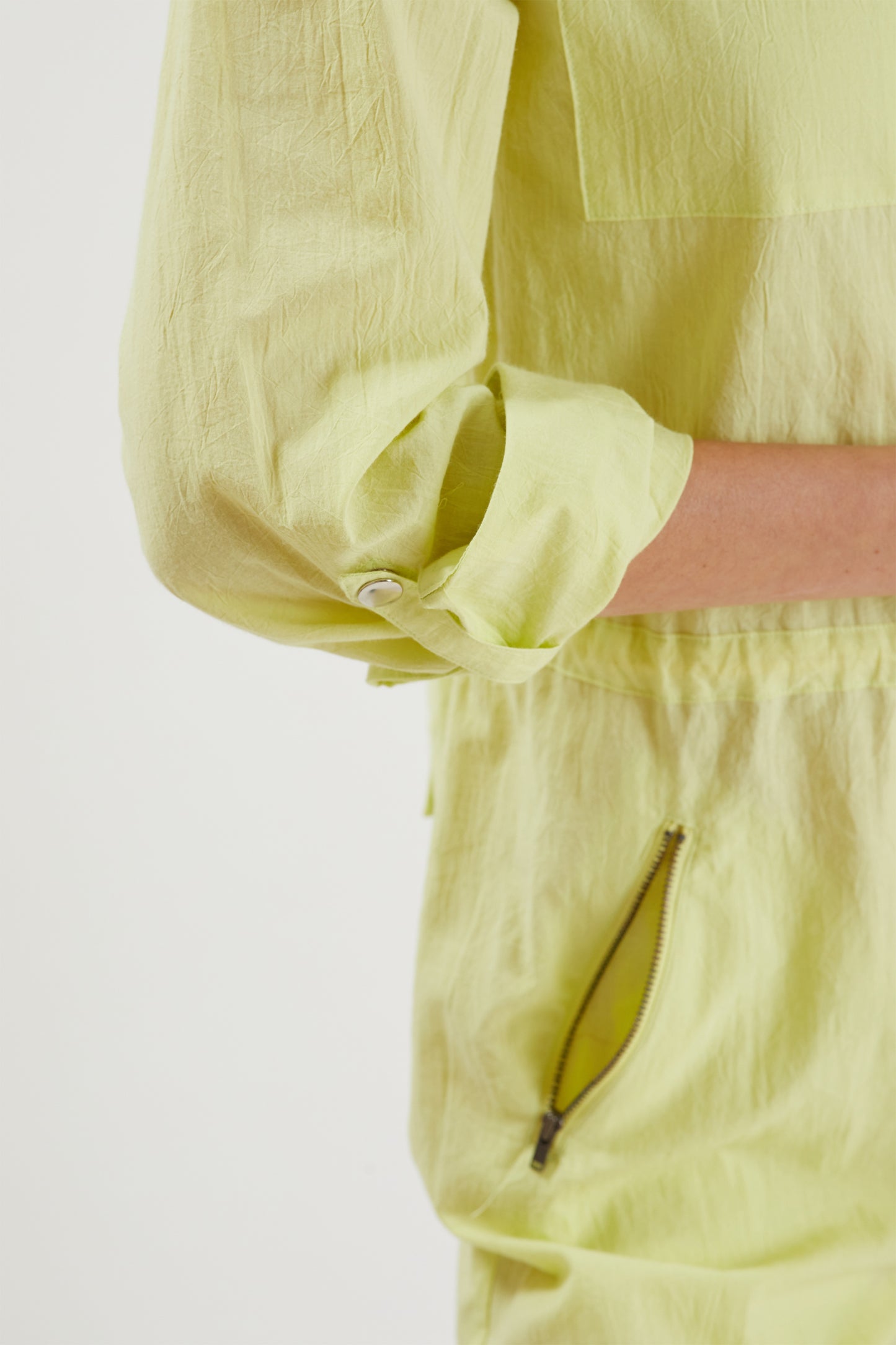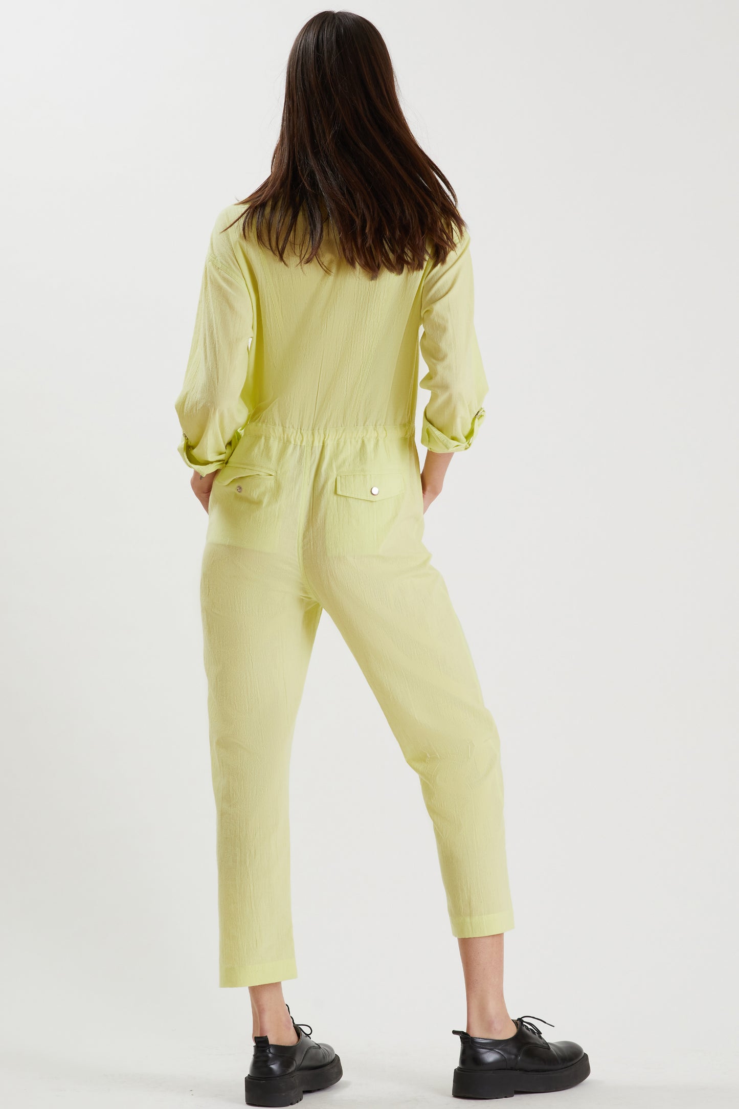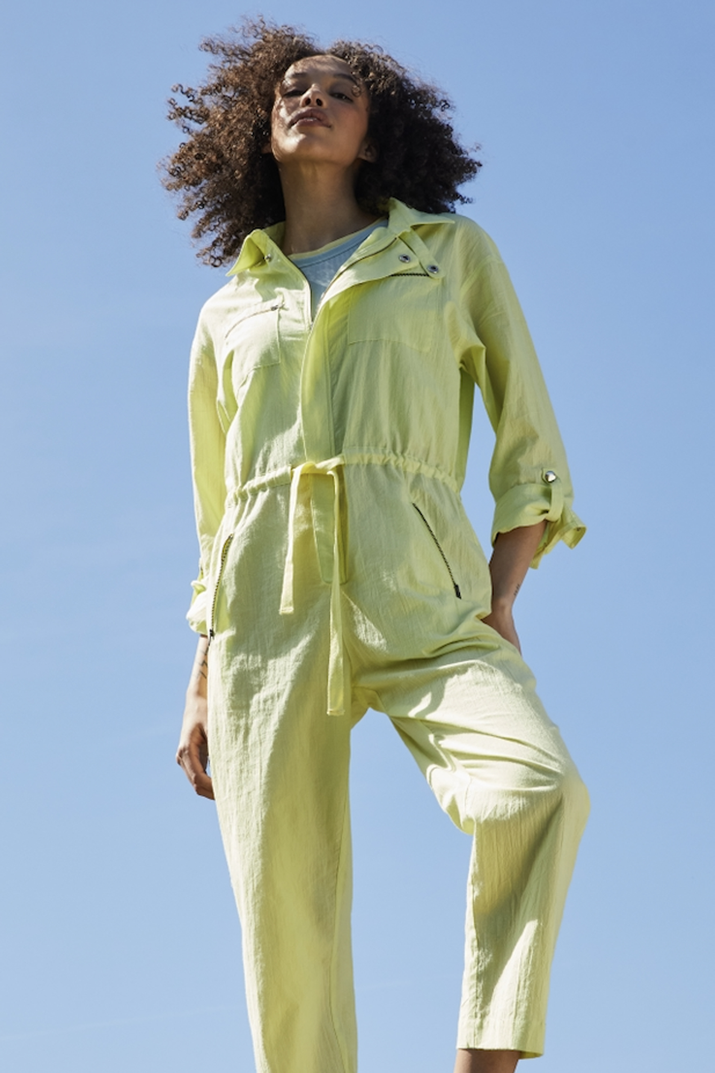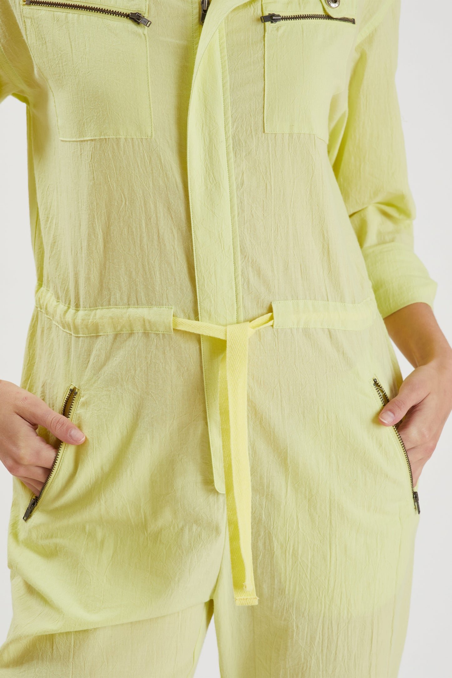 Feel bright and sunny in our new cotton jumpsuit — a sophisticated look that is designed for everyday wear, but certainly will not be found everywhere! And, as they say, it’s all in the details — a classic shirt collar featuring a tab detail, adjustable snaps allow ease of rolling up sleeves to take the heat off when necessary, and a chest patch zip pocket, all add a touch of modern utility. The waist tunnel with adjustable drawcord allows for a customizable fit, accentuating the figure with ease. Two front and back zippered pockets provide further details and convenient storage if needed! The center front placket, adorned with a snap closure and zipper, ensures a secure and polished finish. This jumpsuit effortlessly combines comfort and style to become a must have wardrobe staple.