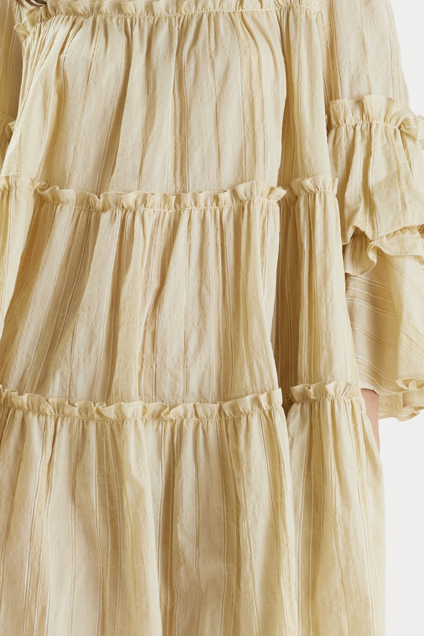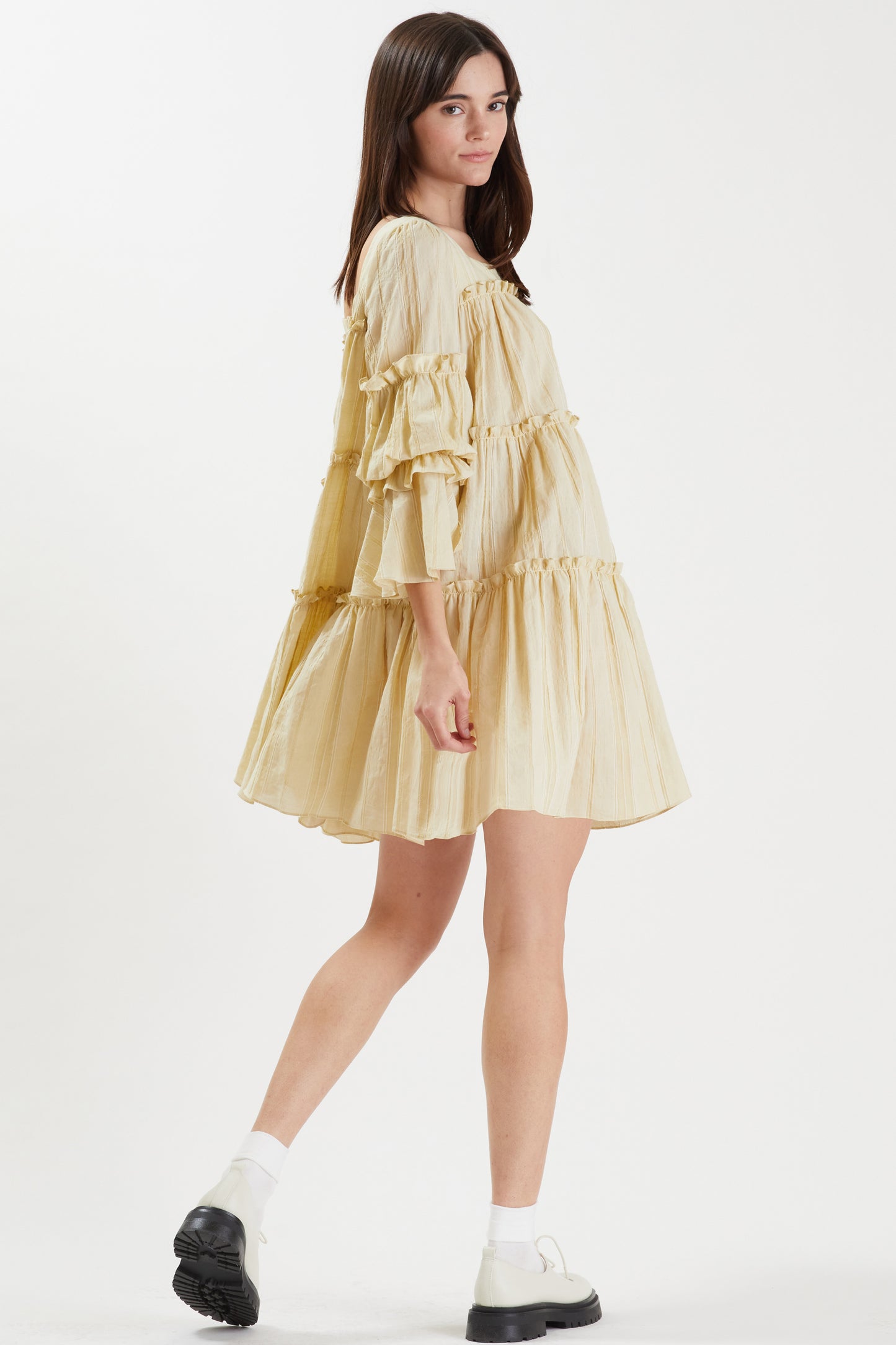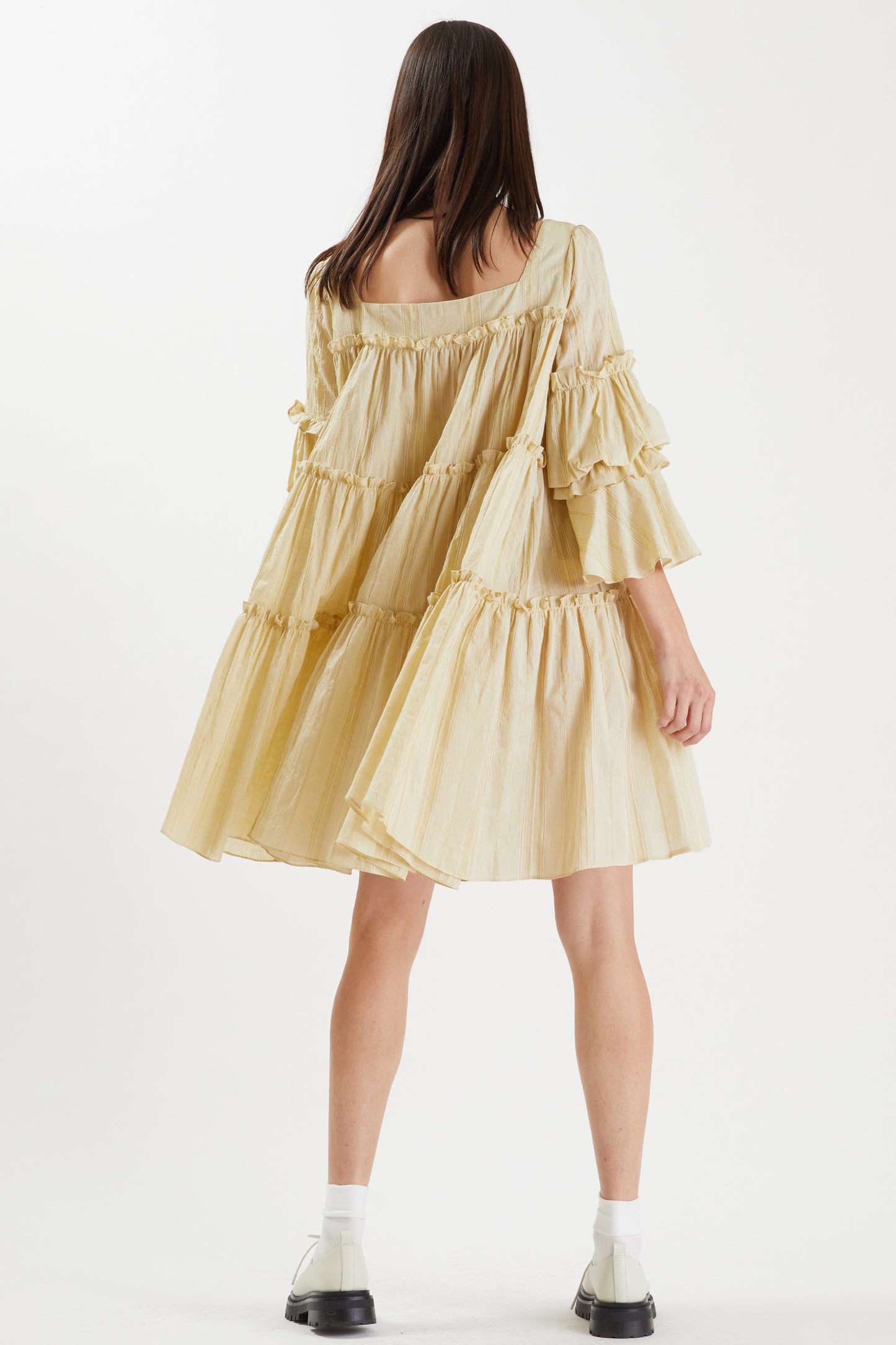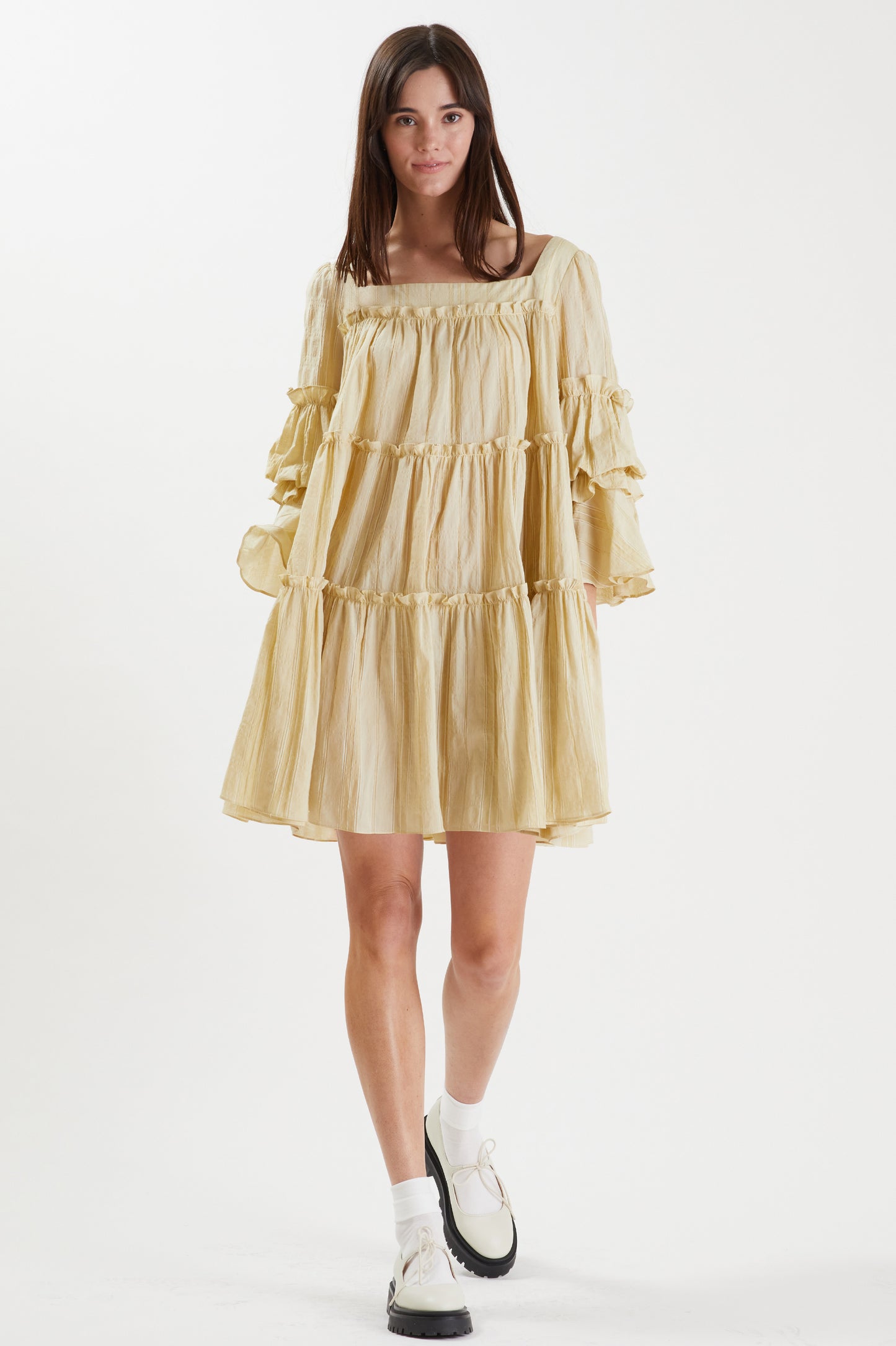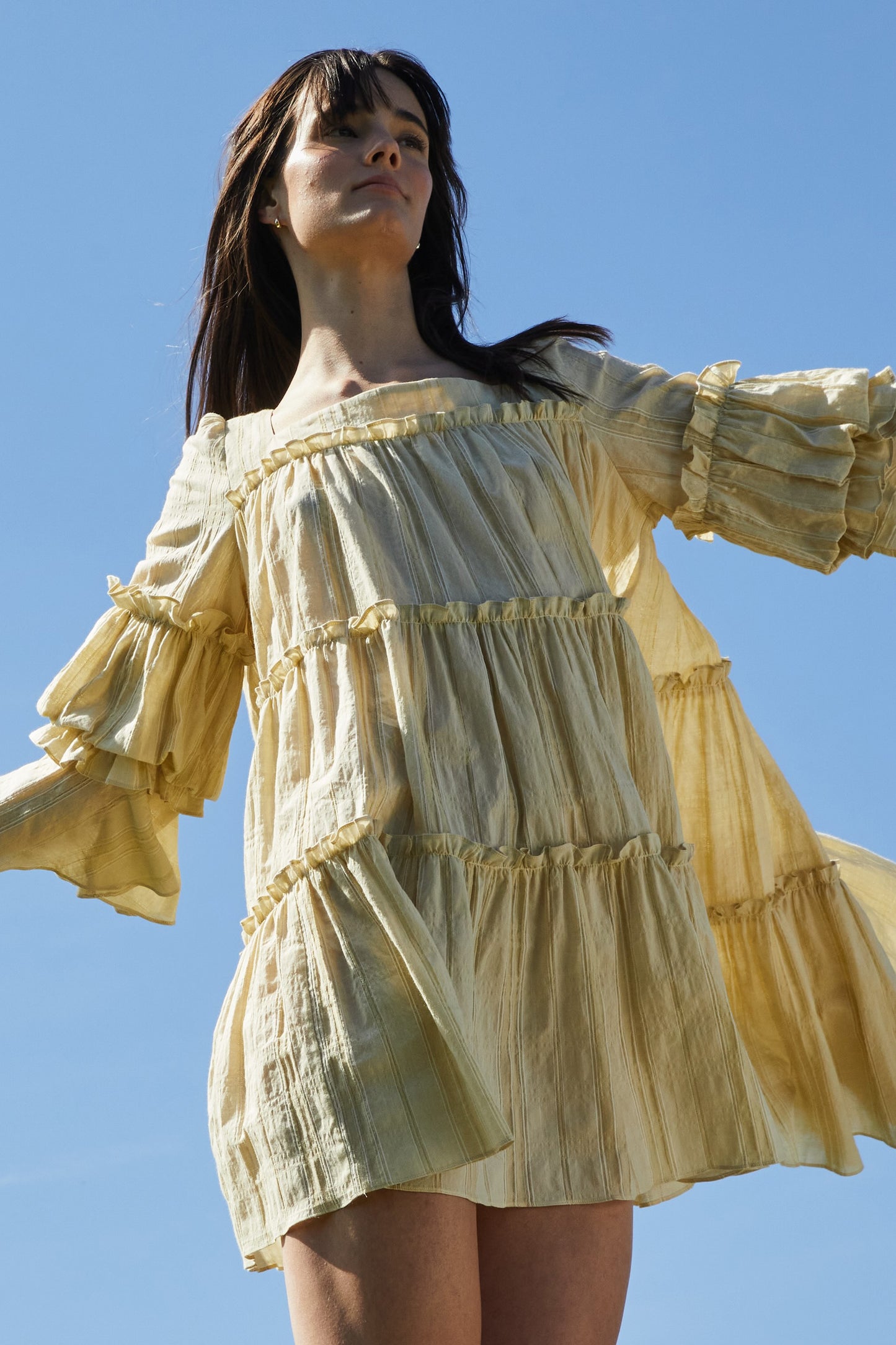 Our hottest mini dress is back in new colors for the summer season! This voluminously tiered dress exudes playful charm that makes you want to twirl like a star! The A-line silhouette, the ¾ length tiered sleeves and a hemline that falls gracefully above the knee all ensure a flattering fit for all body types. Complete with a classic squared neckline, this dress can be dressed up or down depending on your mood.