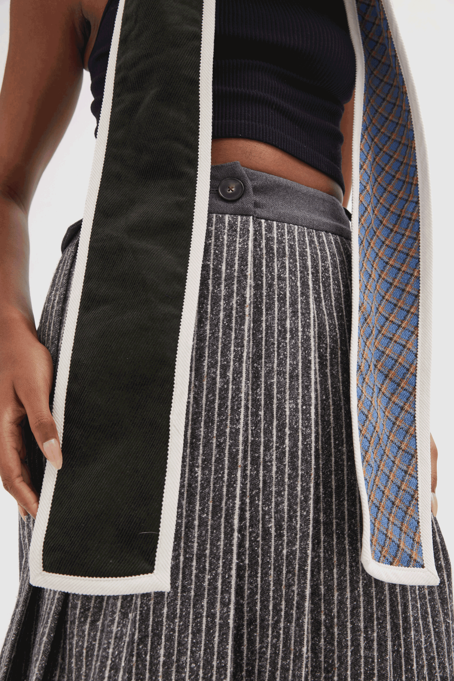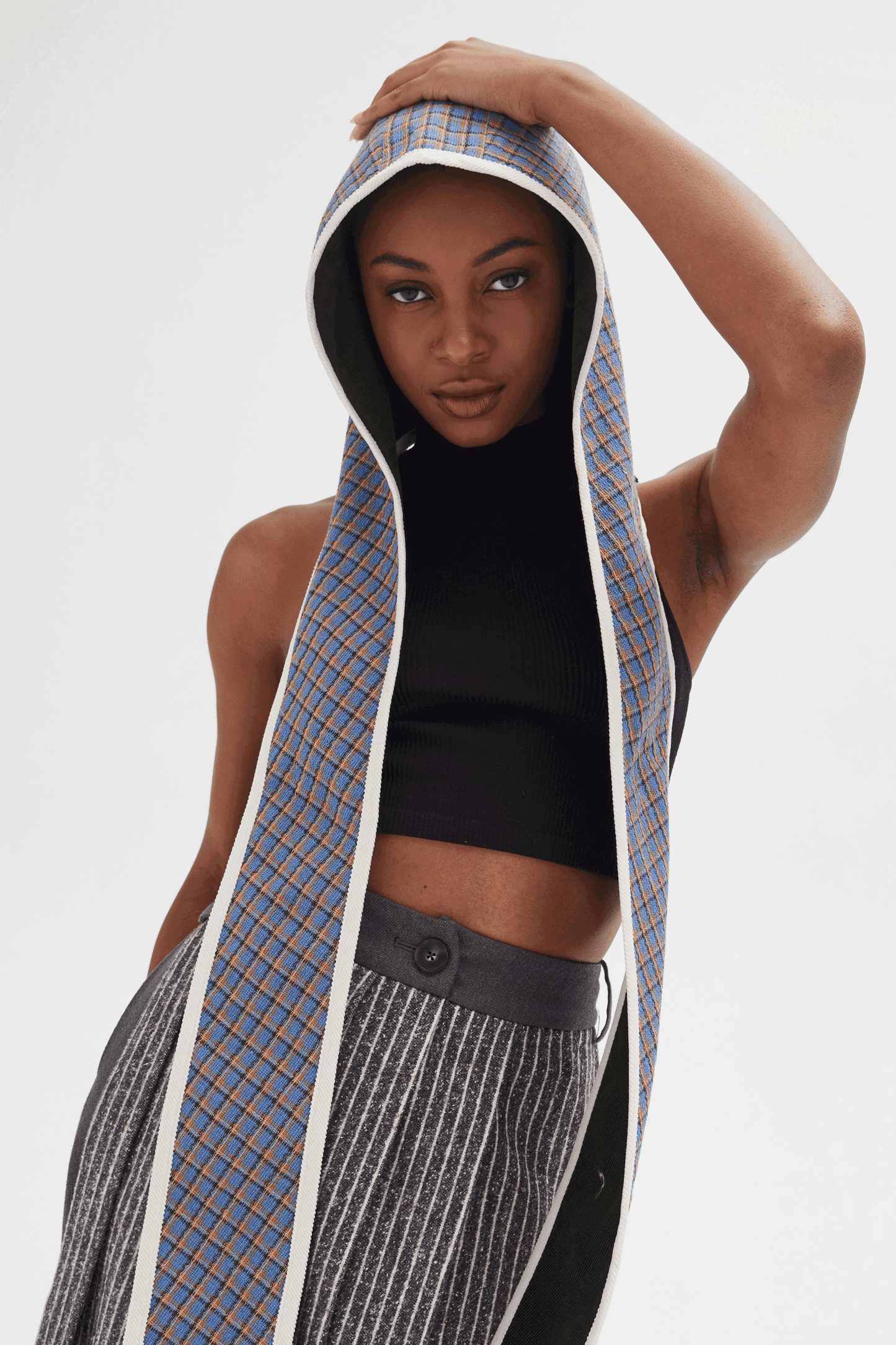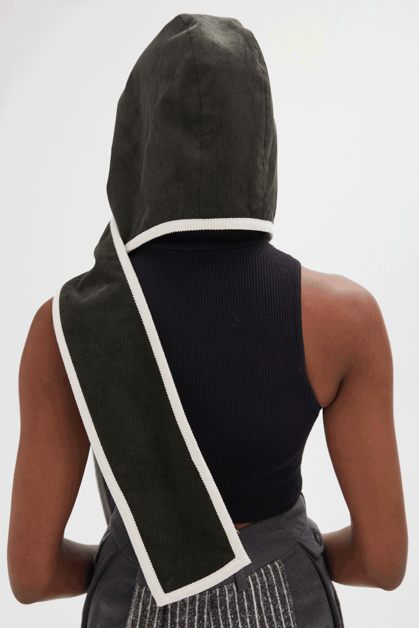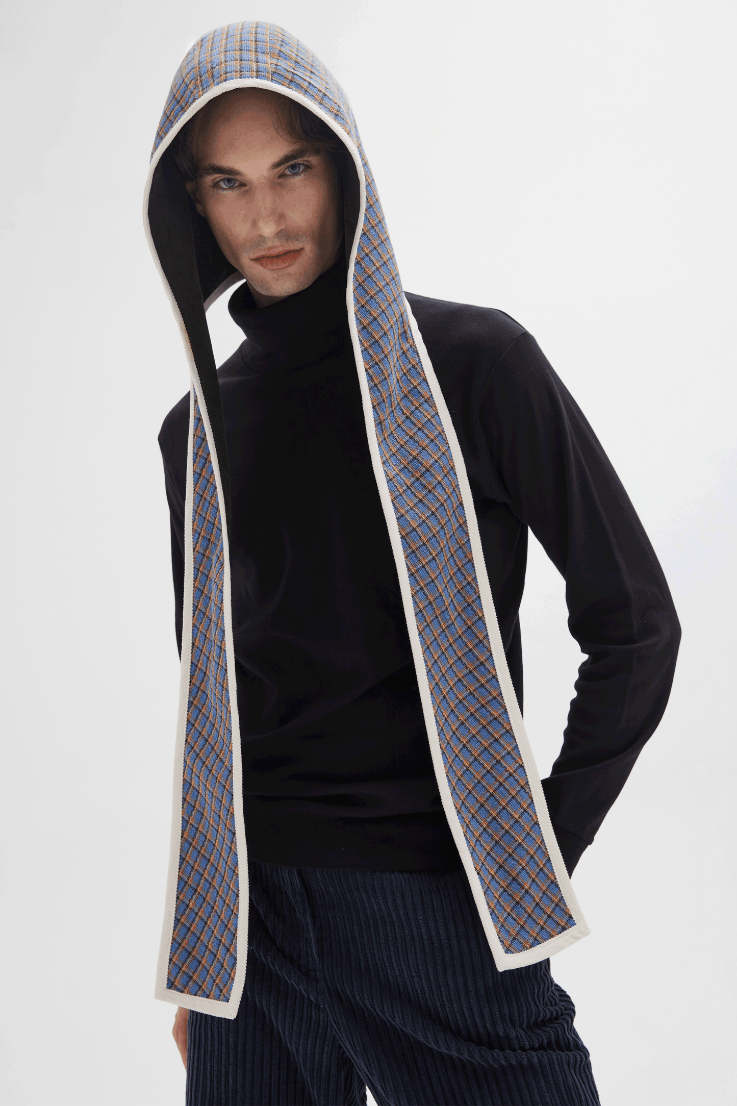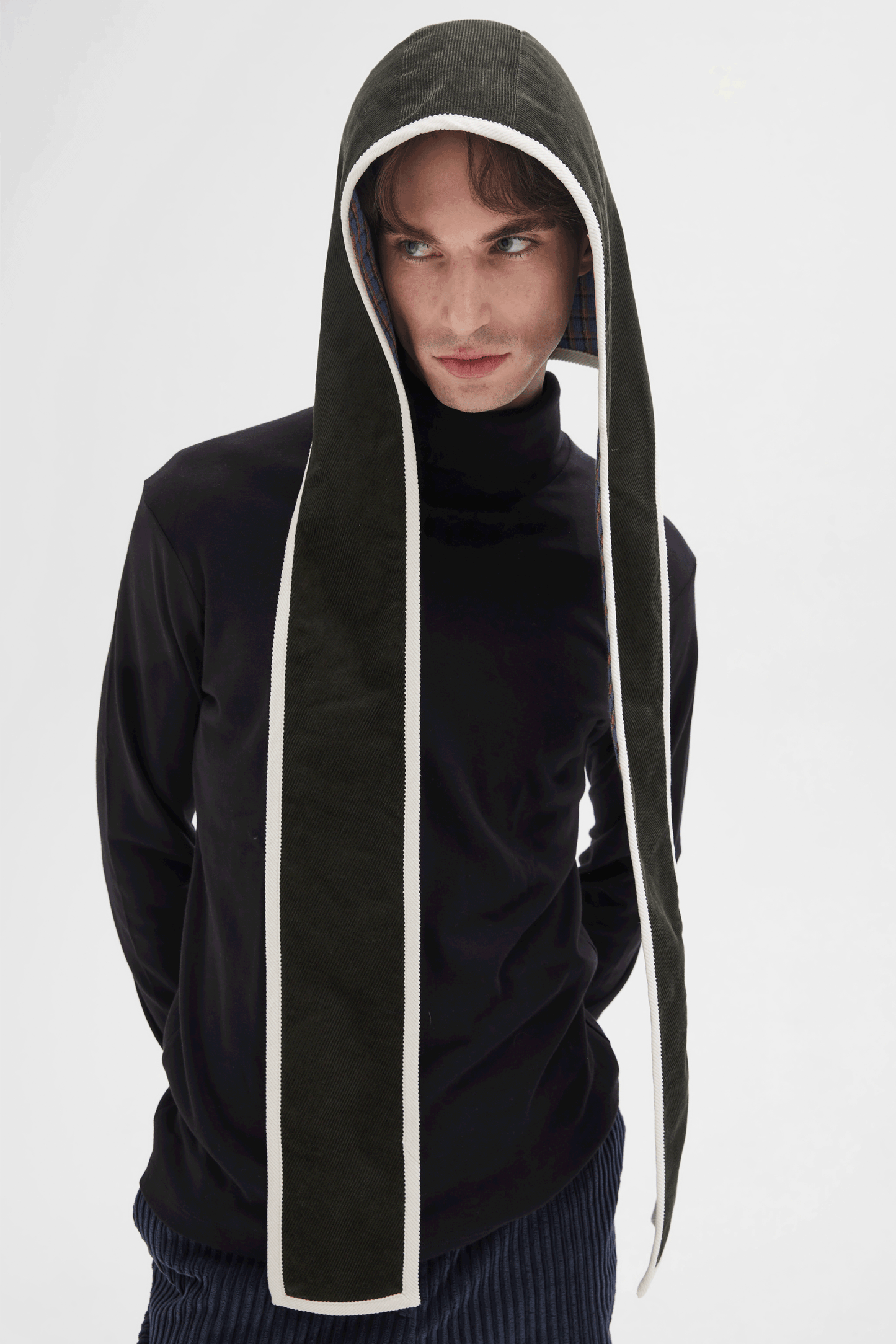 It’s the talk of the town, a 2nd time around. Our new hoody scarf will keep you warm and on trend this season. The scarf is connected to a hood – and our hood is connected to a scarf. And if you get bored with that, just reverse it to the other side - we’re giving you two looks in one! And, in this unique version, we’ve combined our dark green corduroy with white binding on one side and our blue checked cotton print on the other, reversible side. It’s all these details that make us distinctive as we try to create new and unusual styles for everyone to enjoy. There’s no limit to what you can do with this signature piece.
