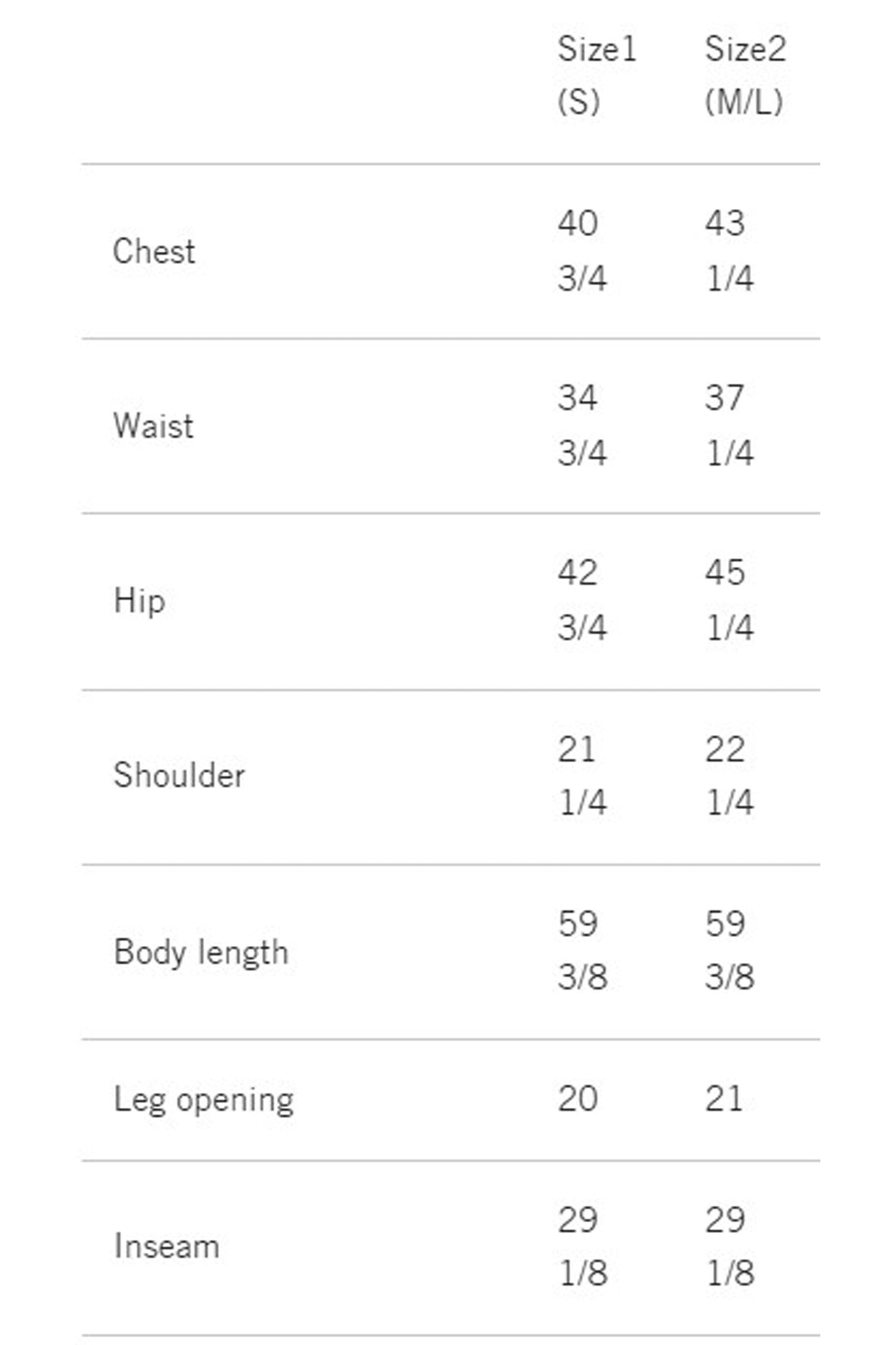 | Chest | 40 3/4 | 43 1/4 |