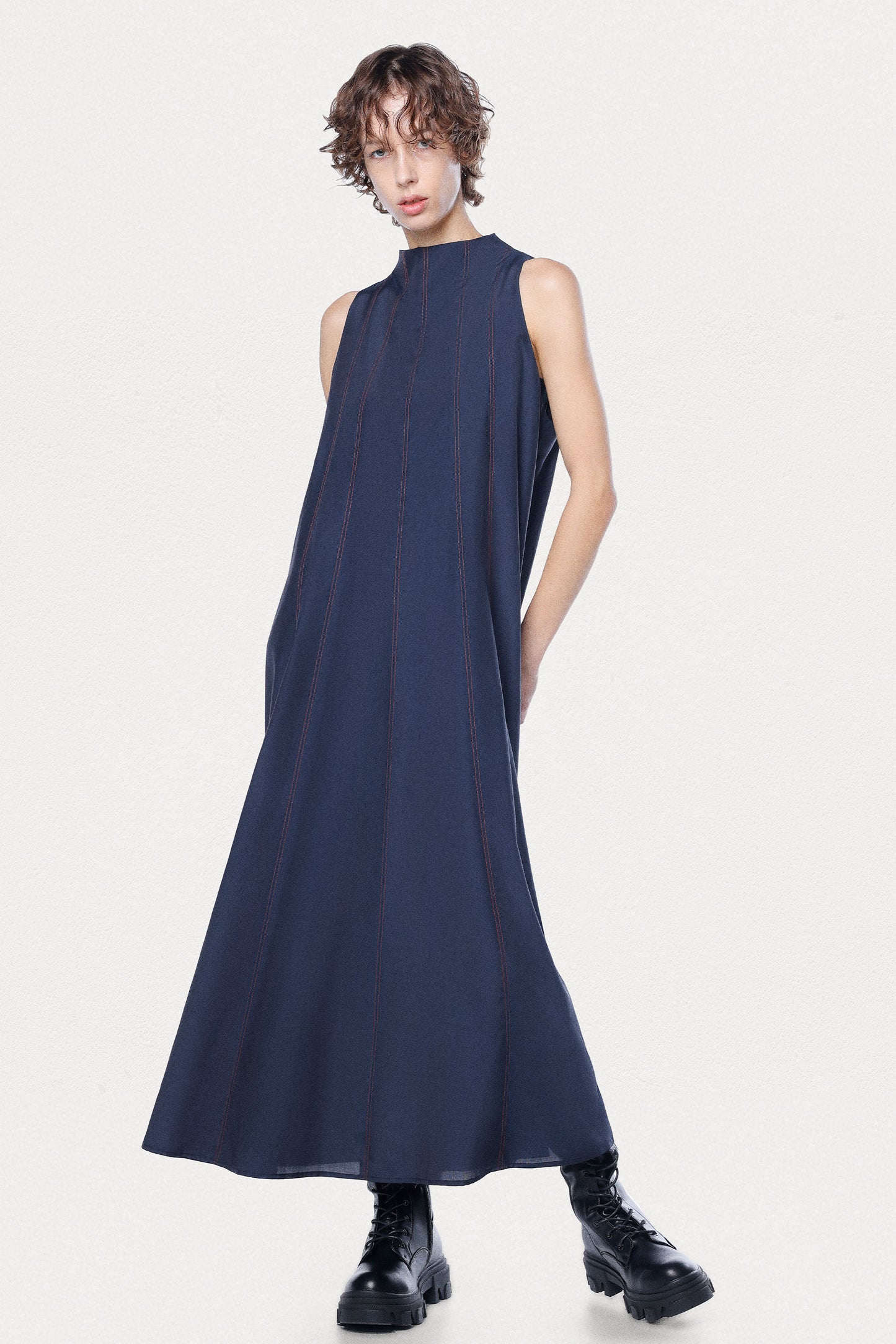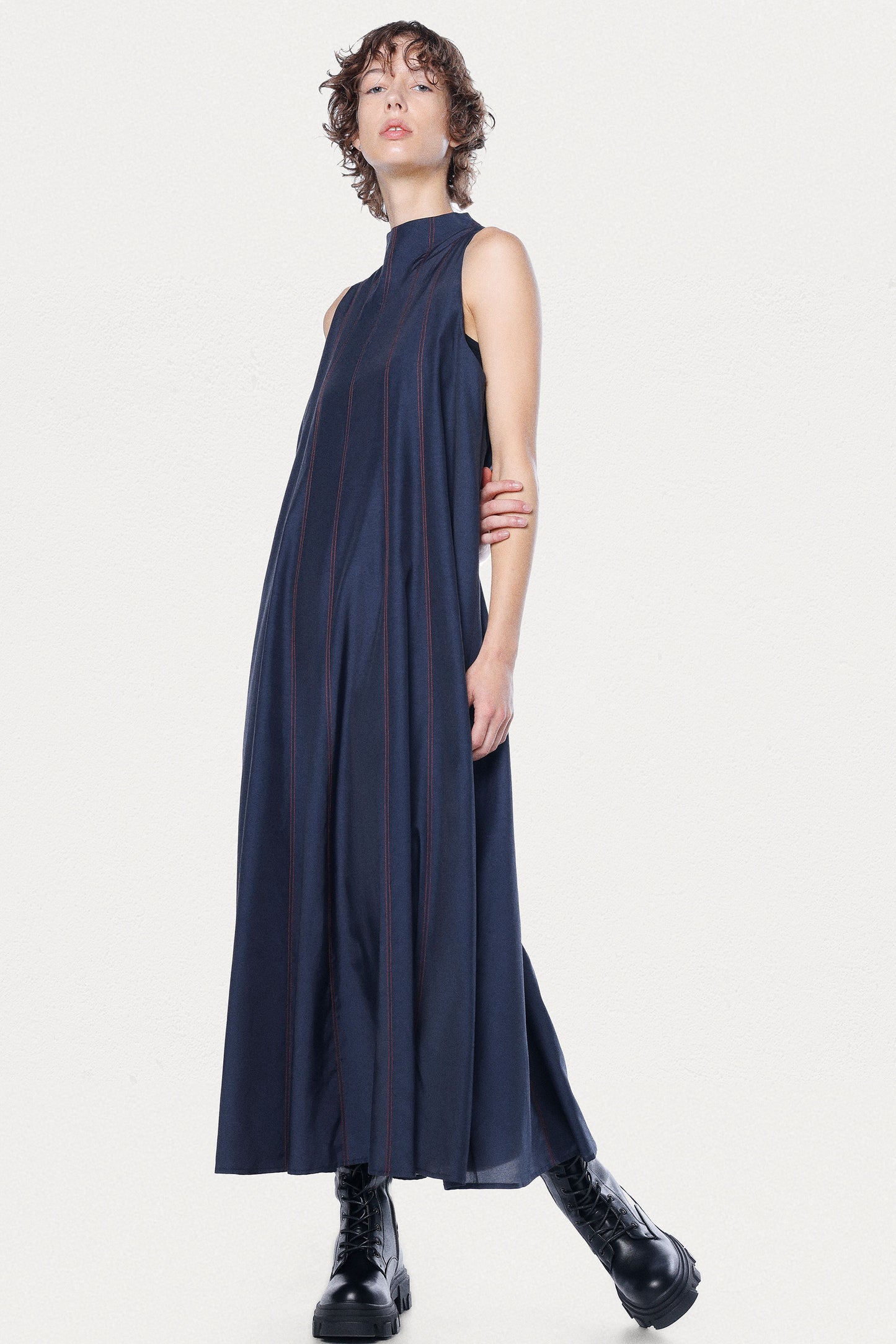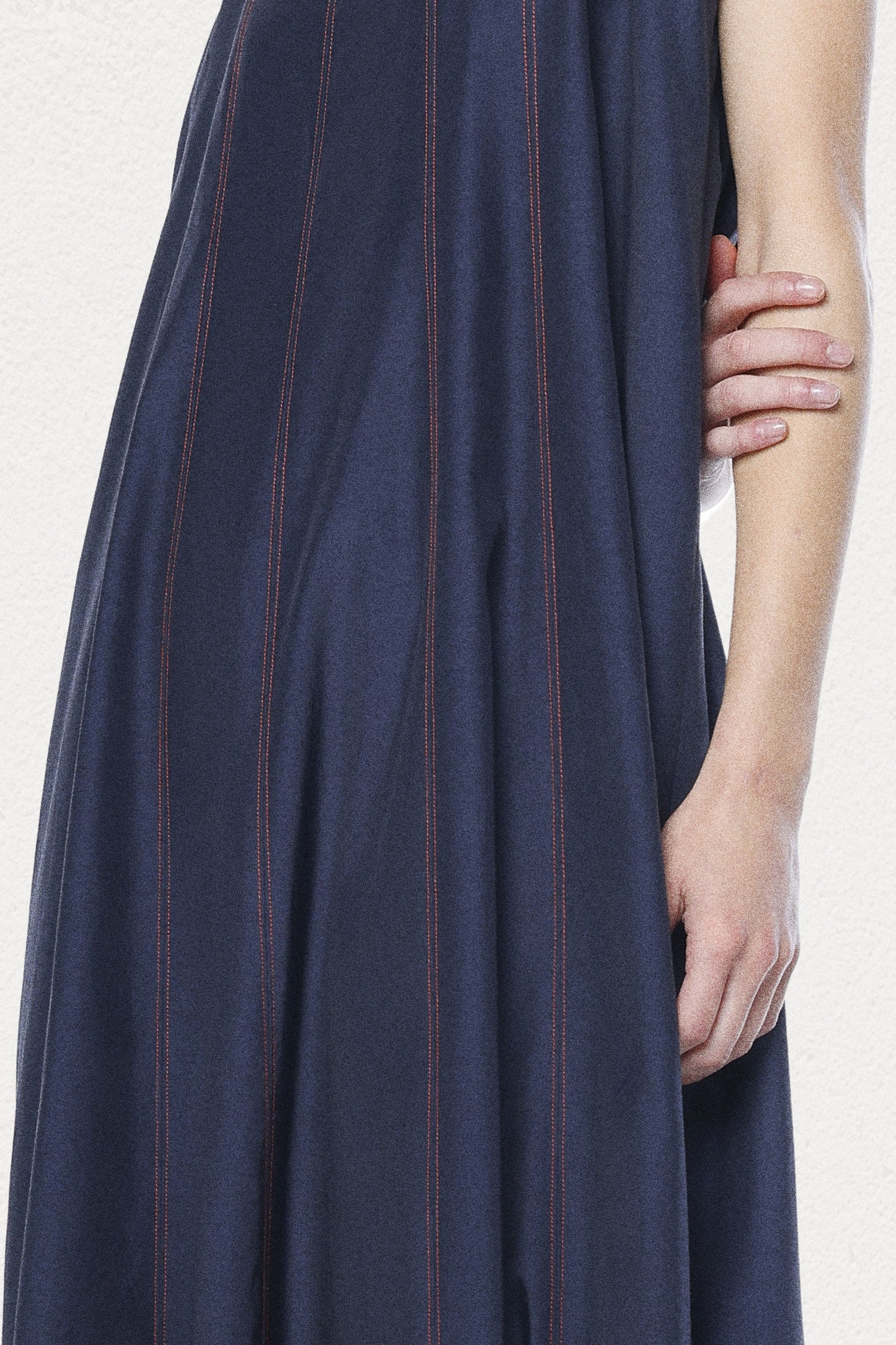 The Earth Dress is a breathtaking maxi-length dress crafted from a premium cupro-silk blend and offers an ultra-lightweight feel and a rich, textured finish. Designed with elegant vertical panels to enhance the silhouette, this dress features contrasting red topstitching in vertical lines for a surprise pop of color, making it the perfect choice for any special event. The flowing A-line shape and lightweight fabric create effortless movement, while the chic mock neck closes at the back with refined mother-of-pearl buttons for an exquisite finishing touch.