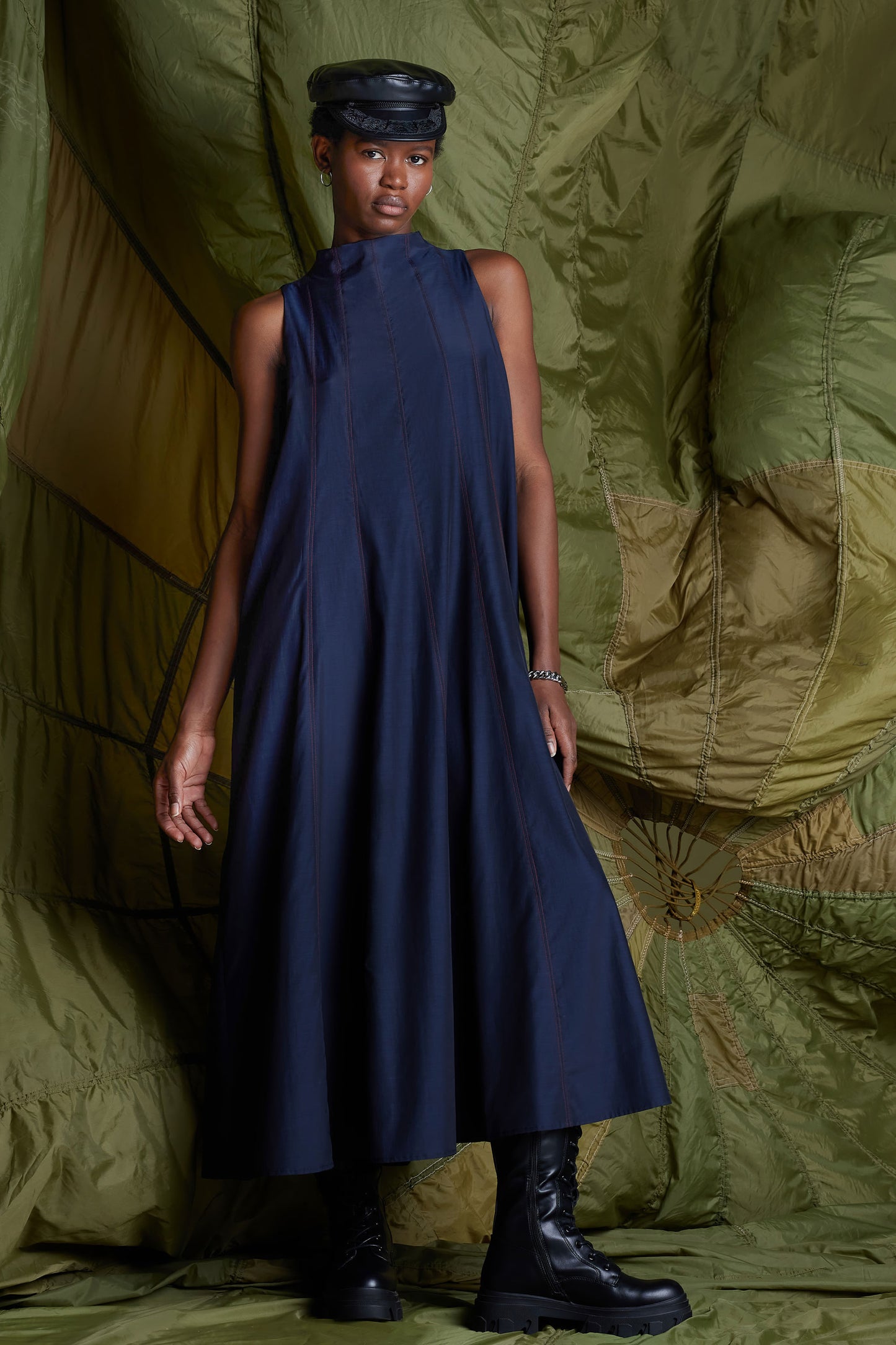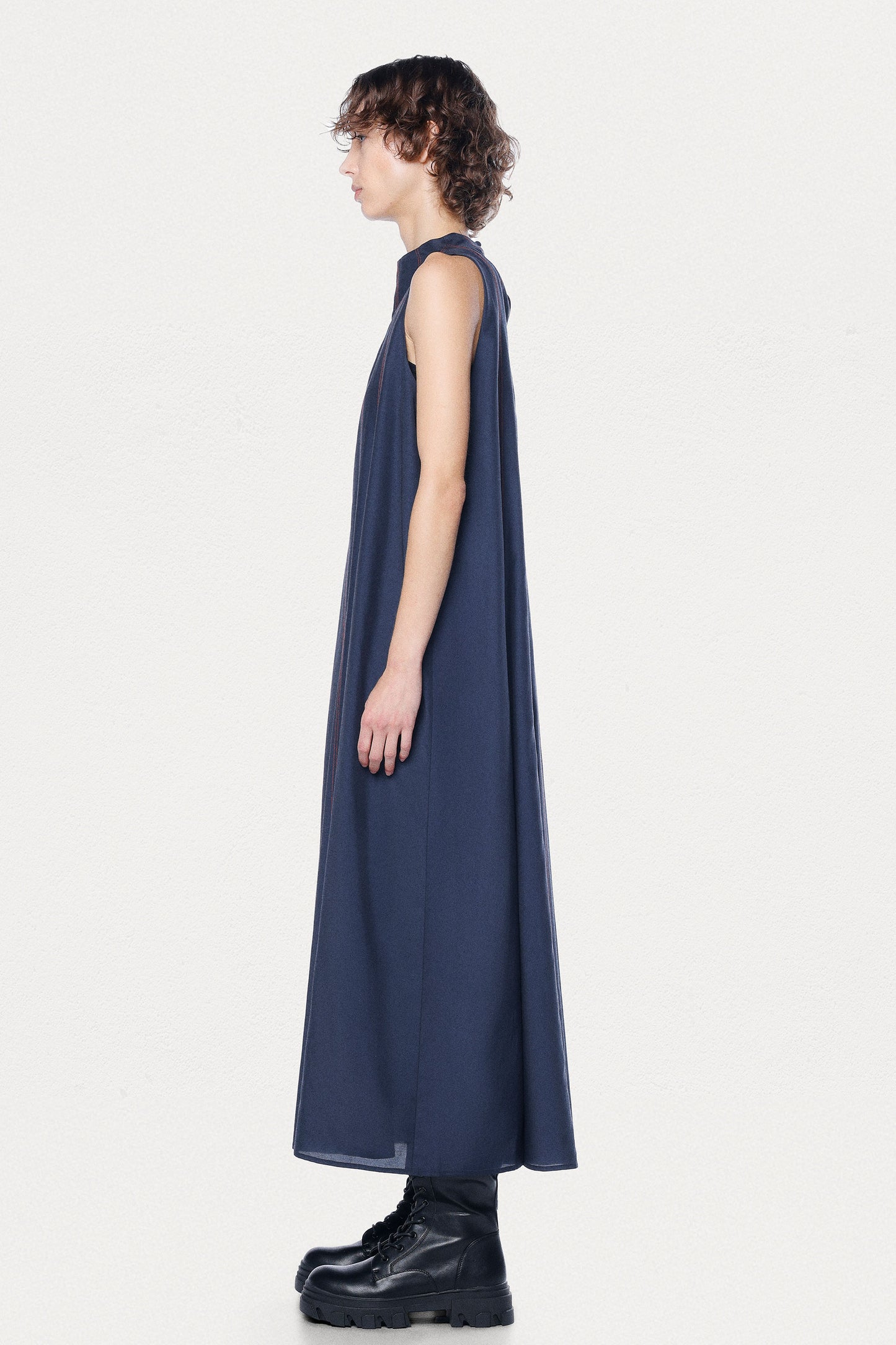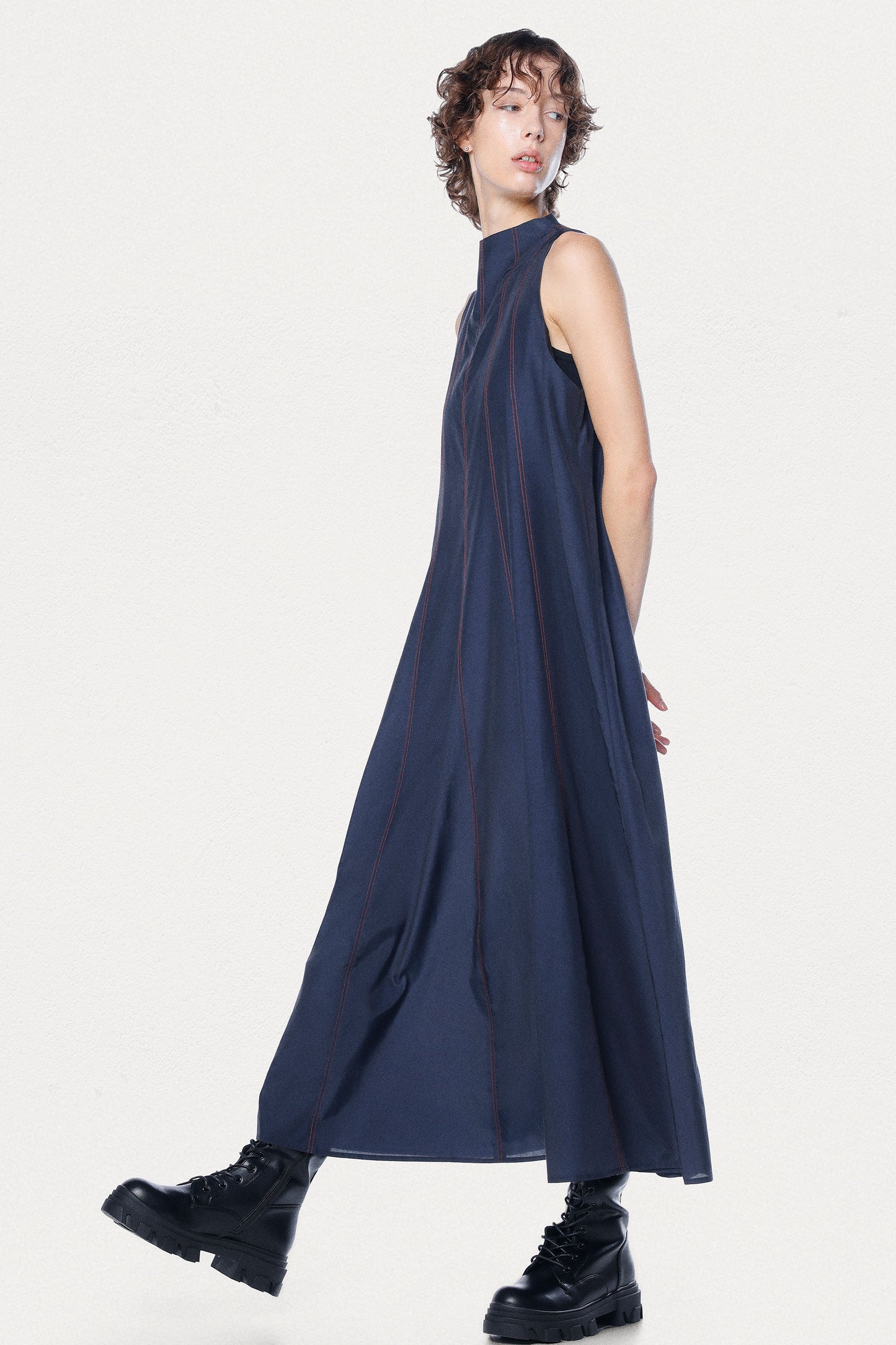 The Earth Dress is a breathtaking maxi-length dress crafted from a premium cupro-silk blend and offers an ultra-lightweight feel and a rich, textured finish. Designed with elegant vertical panels to enhance the silhouette, this dress features contrasting red topstitching in vertical lines for a surprise pop of color, making it the perfect choice for any special event. The flowing A-line shape and lightweight fabric create effortless movement, while the chic mock neck closes at the back with refined mother-of-pearl buttons for an exquisite finishing touch.