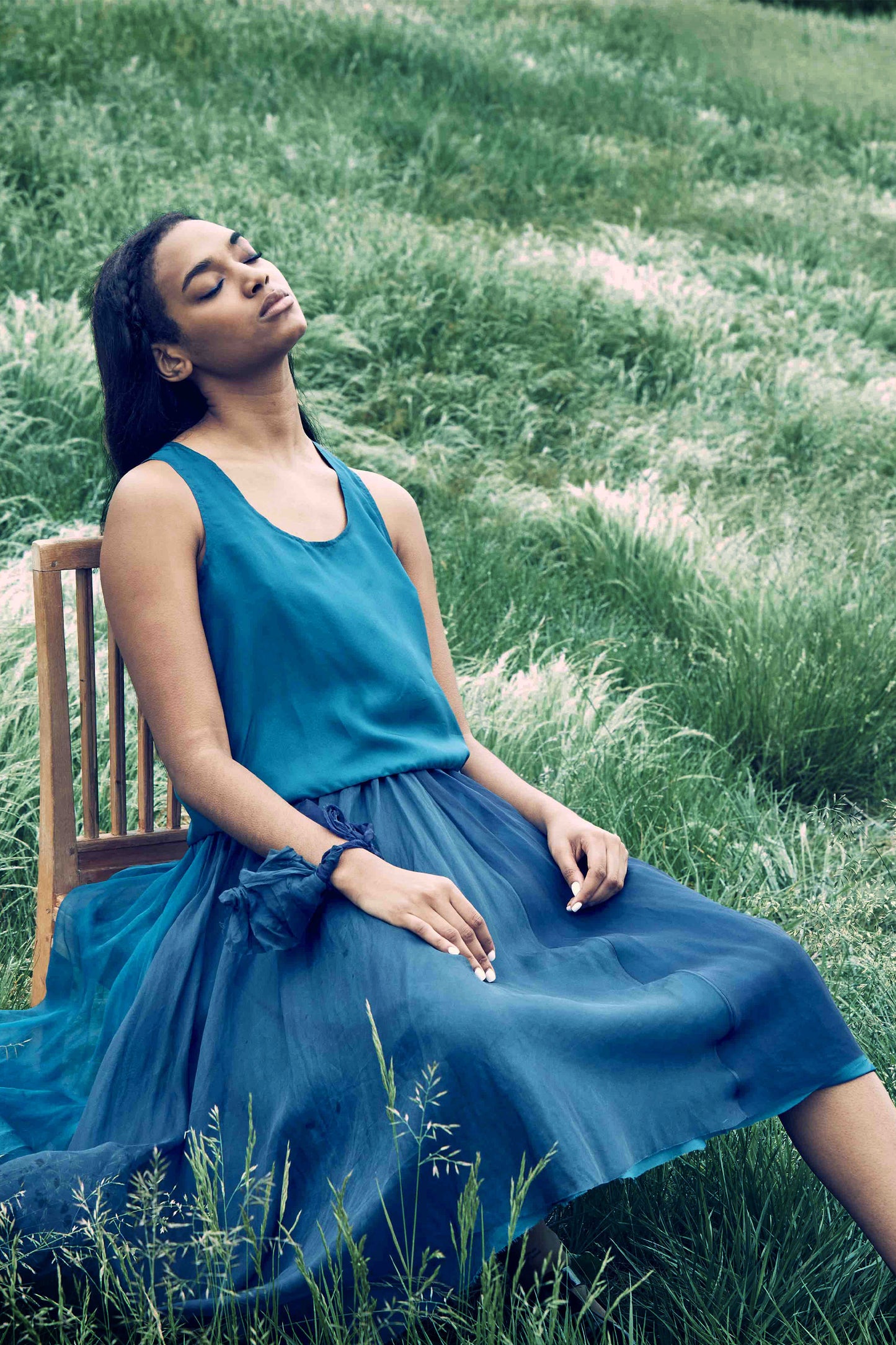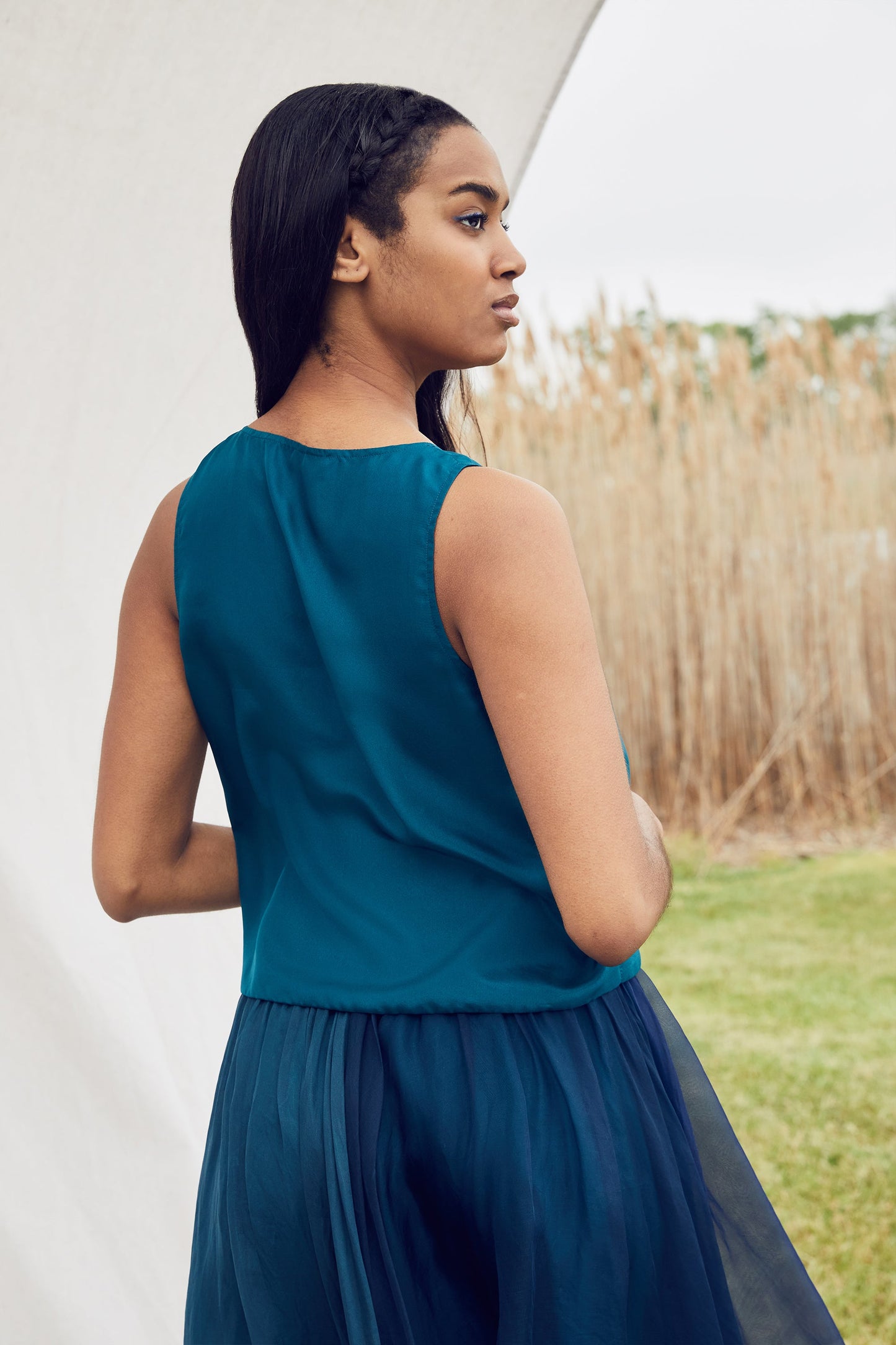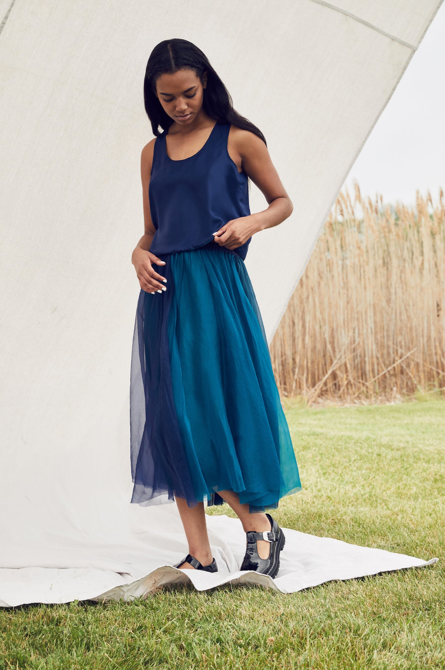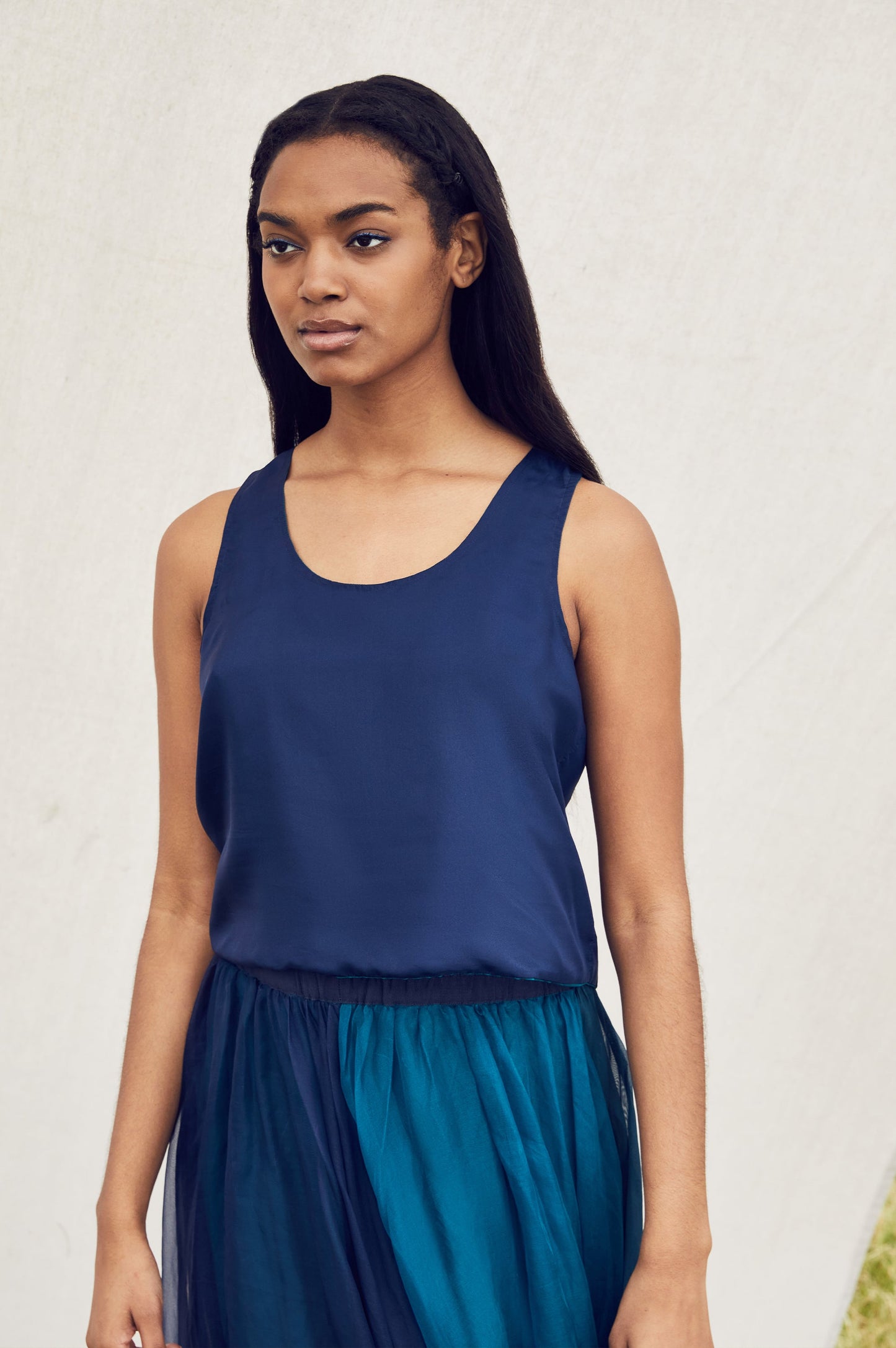 Our reversible habotai silk tank top gives you double the fun. Teal on one side and blue on the other lets you choose your mood. The tank top is designed to work with the Bluebelle skirt to give you a complete look; or, wear it as a separate with our Le Jardin shorts.