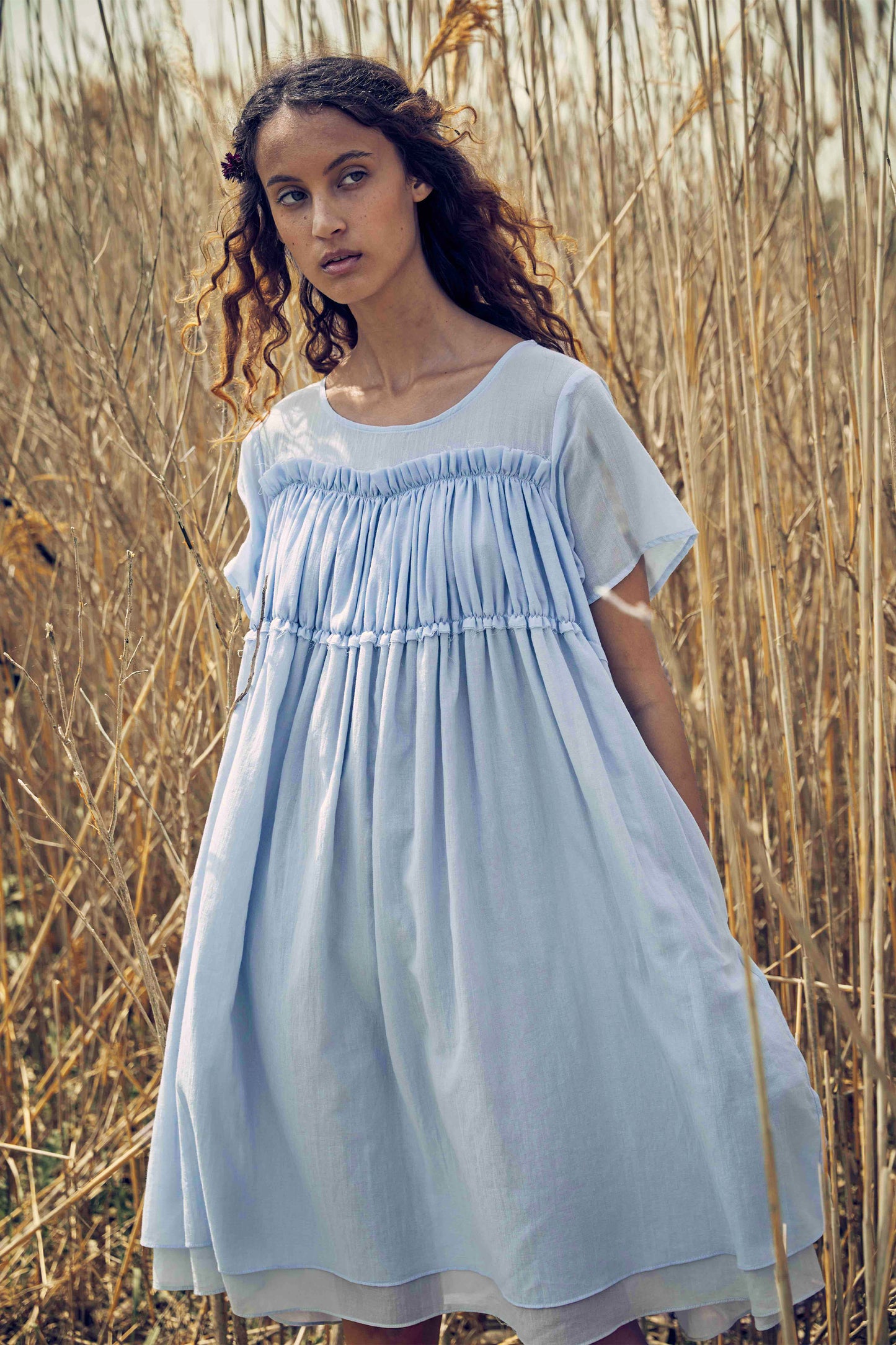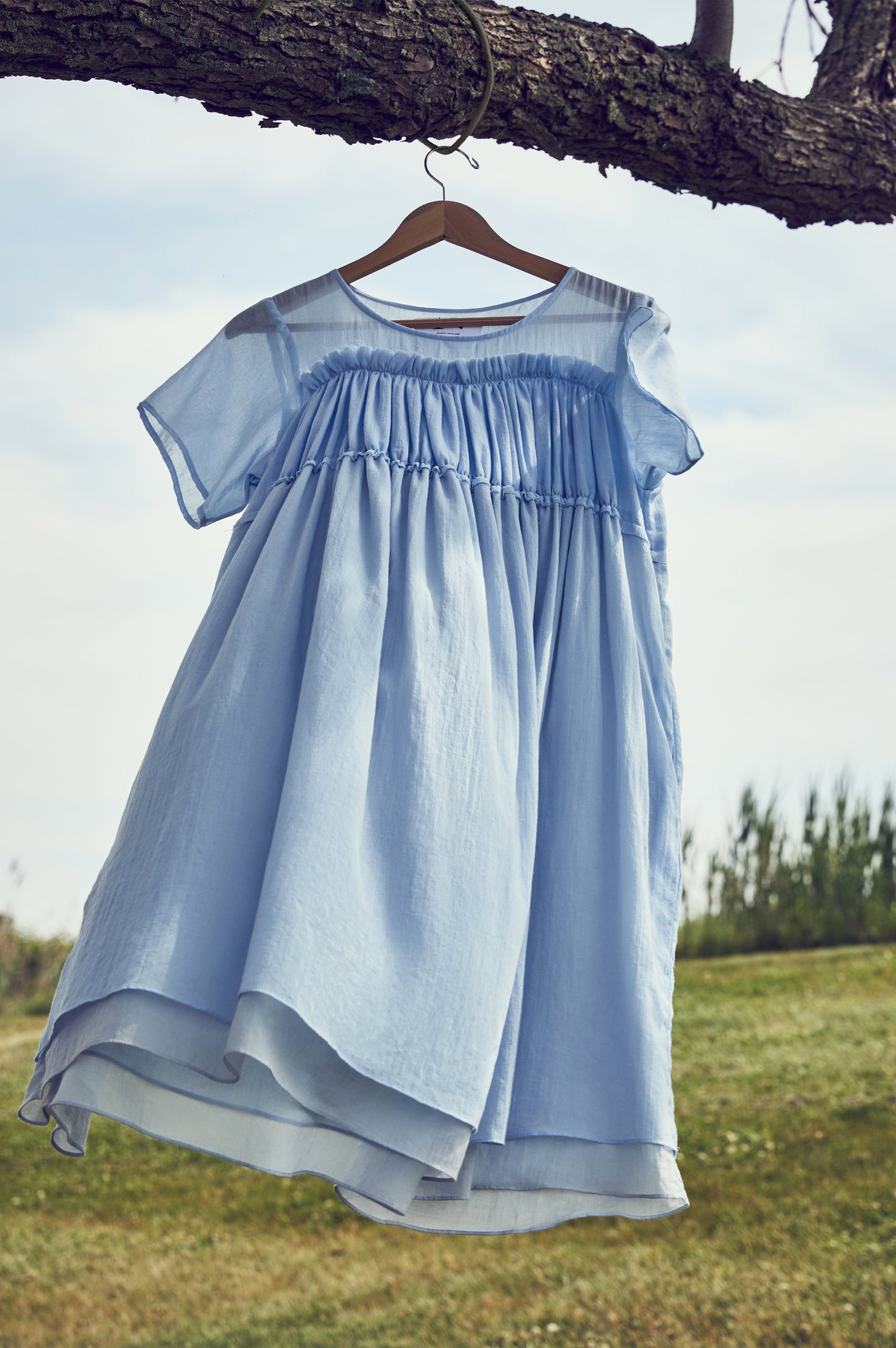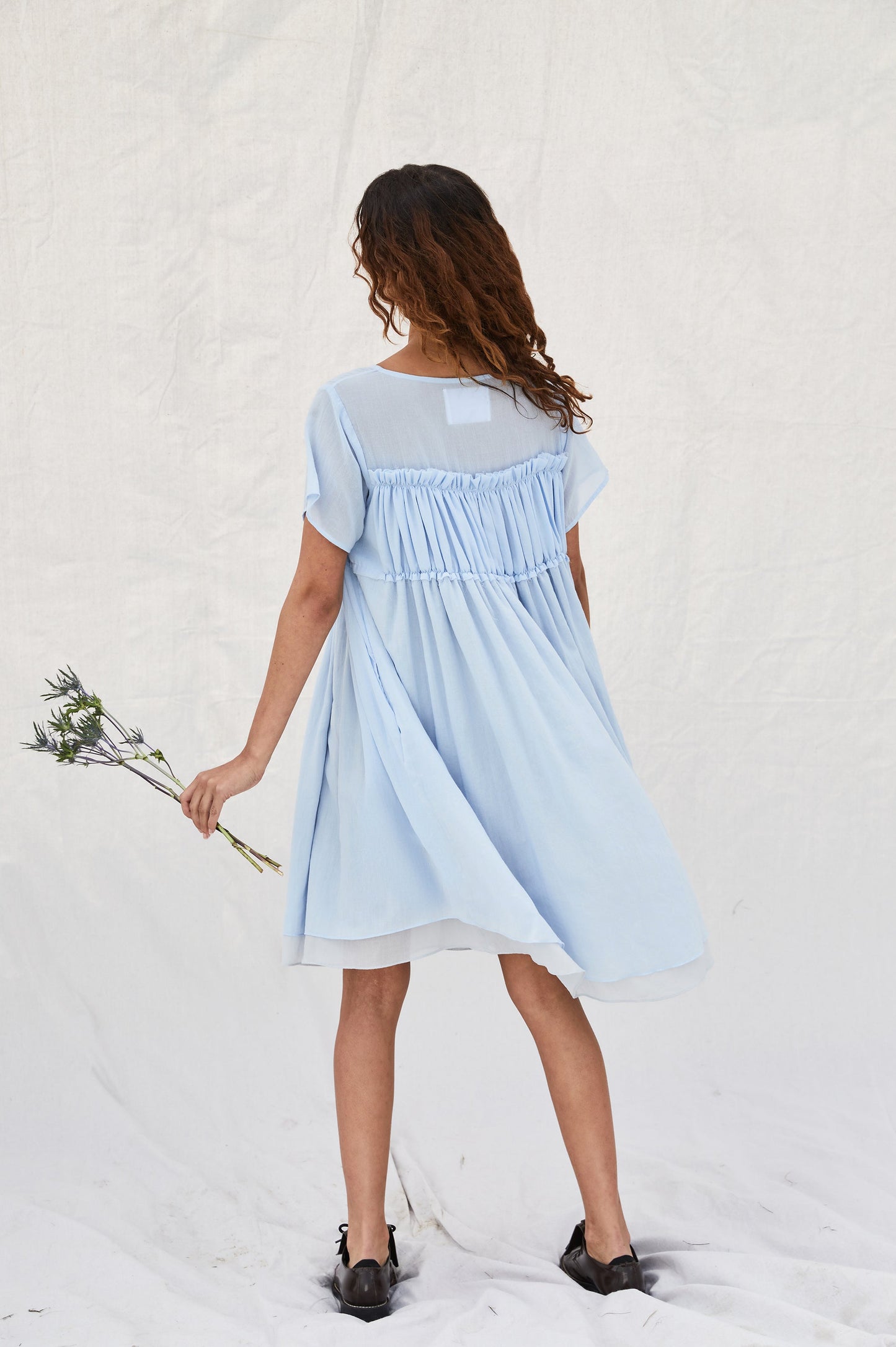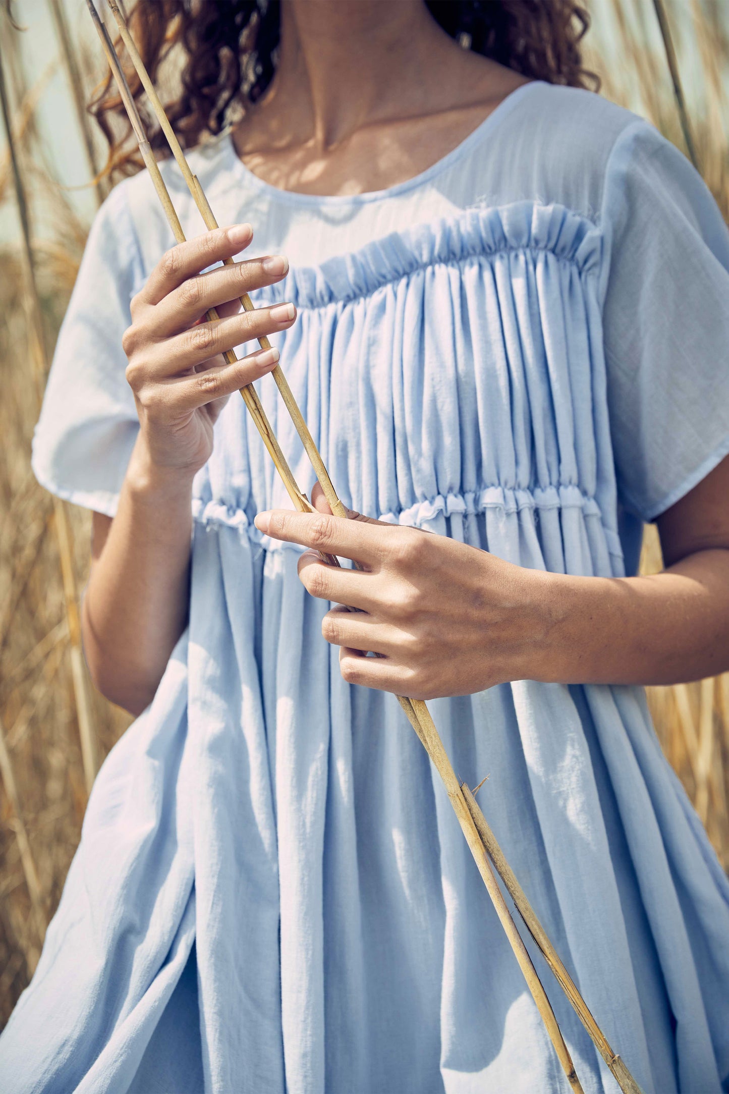 Summer time in a dress – our gorgeous blue cotton chiffon dress is spirited and adds some glam to your wardrobe. The fluting below the neckline and pockets add unique details; and, a surprise second layer of gray cotton chiffon at the hemline takes this 2-toned dress to the next level.