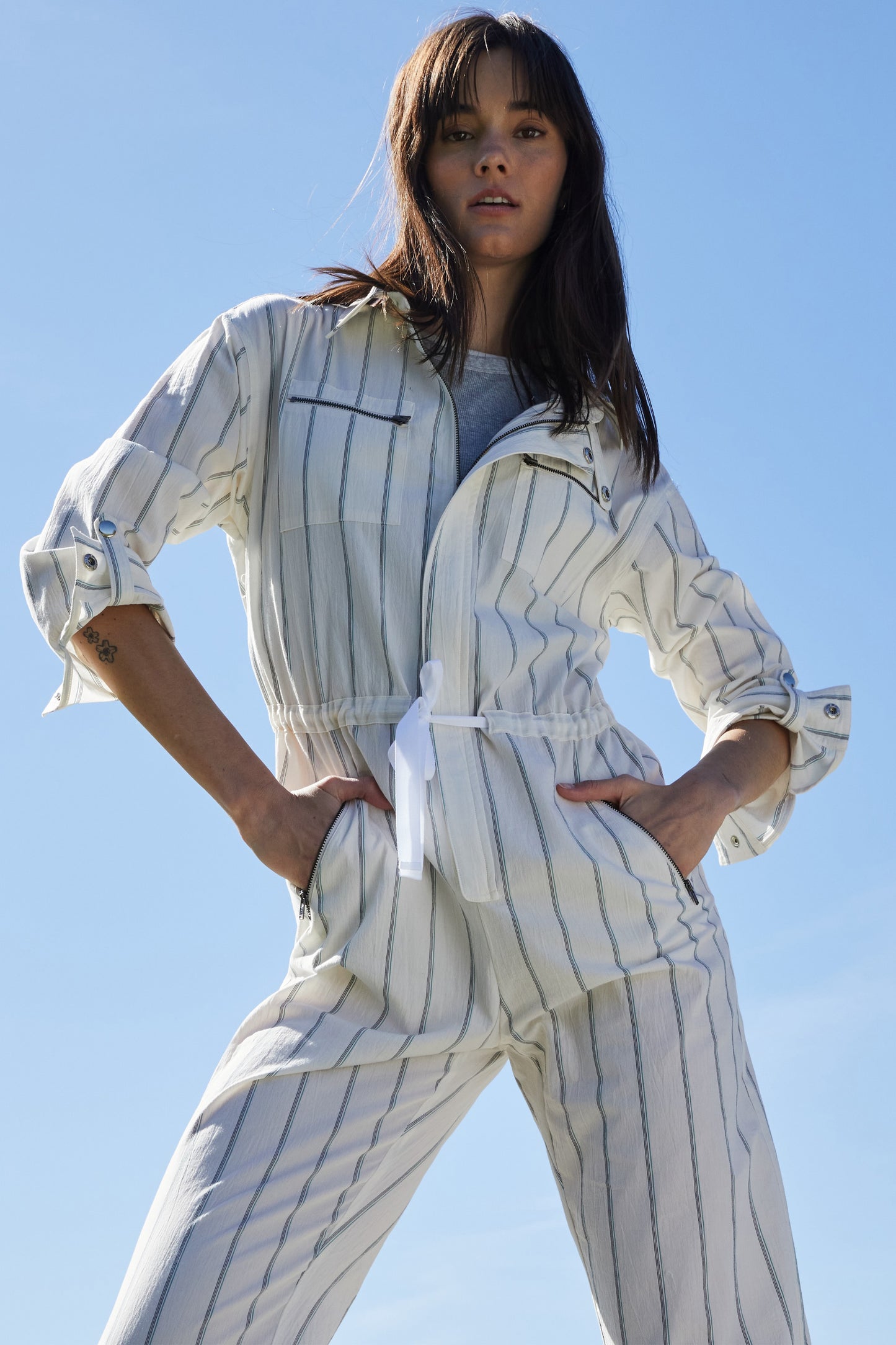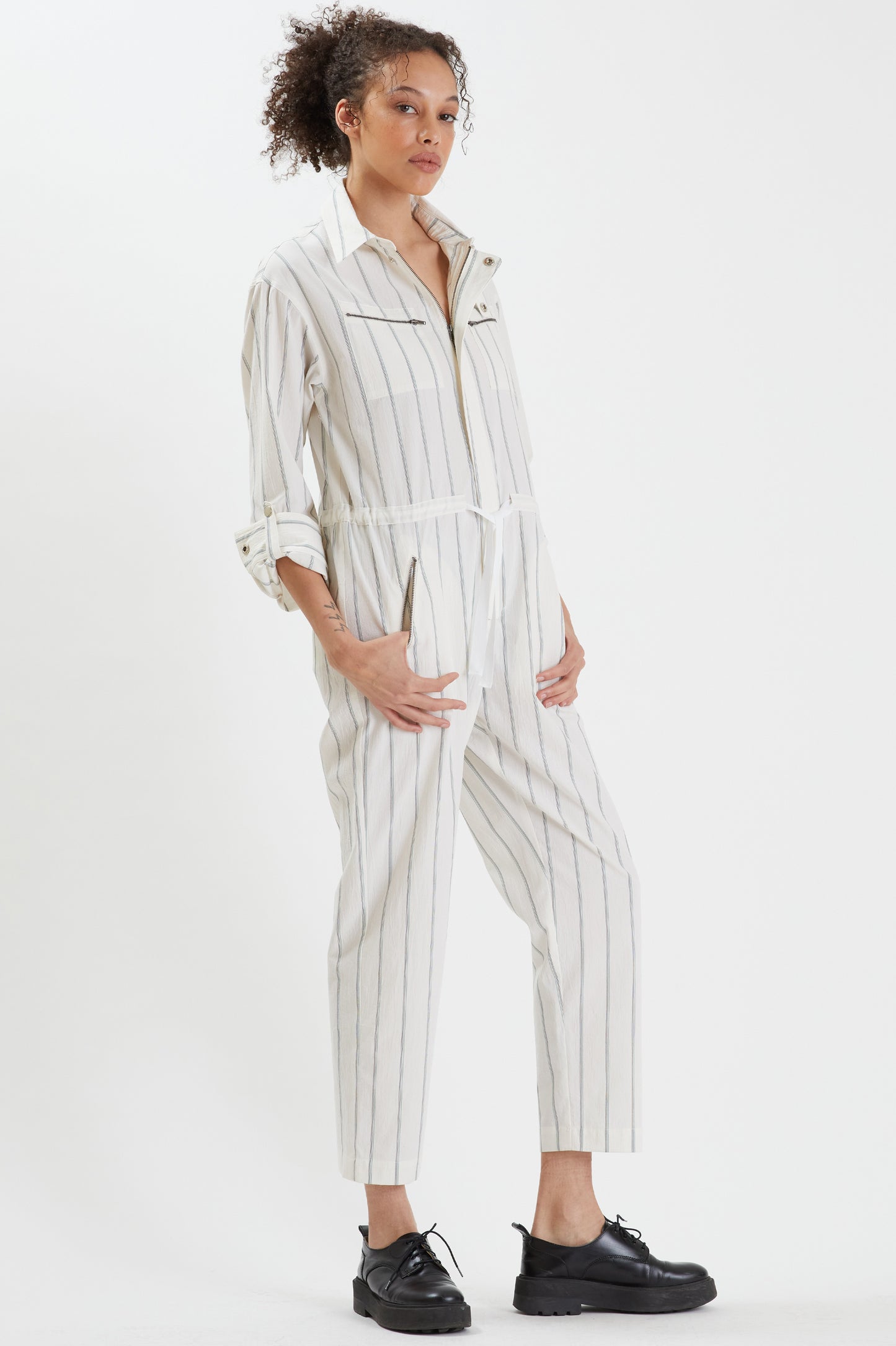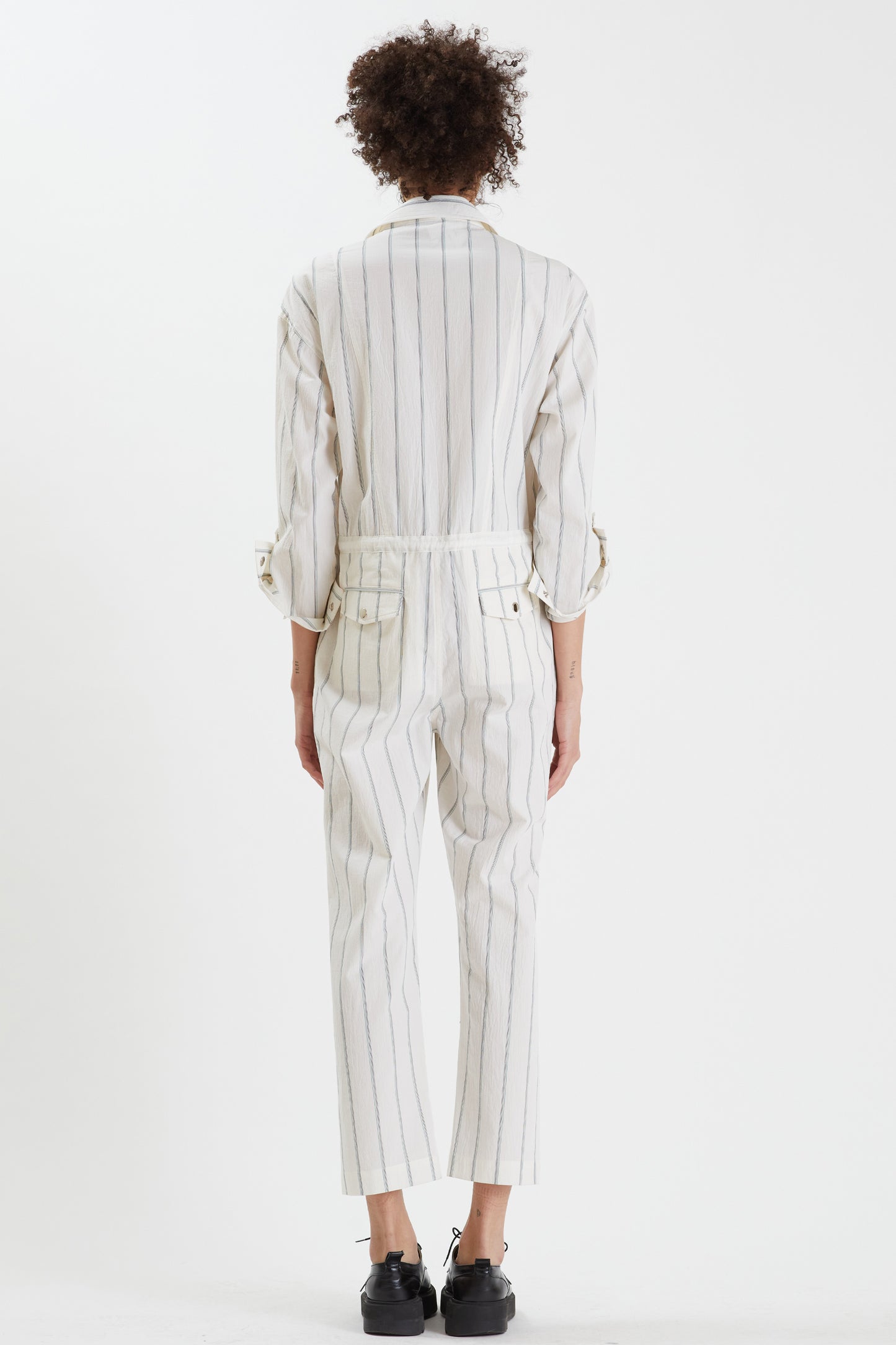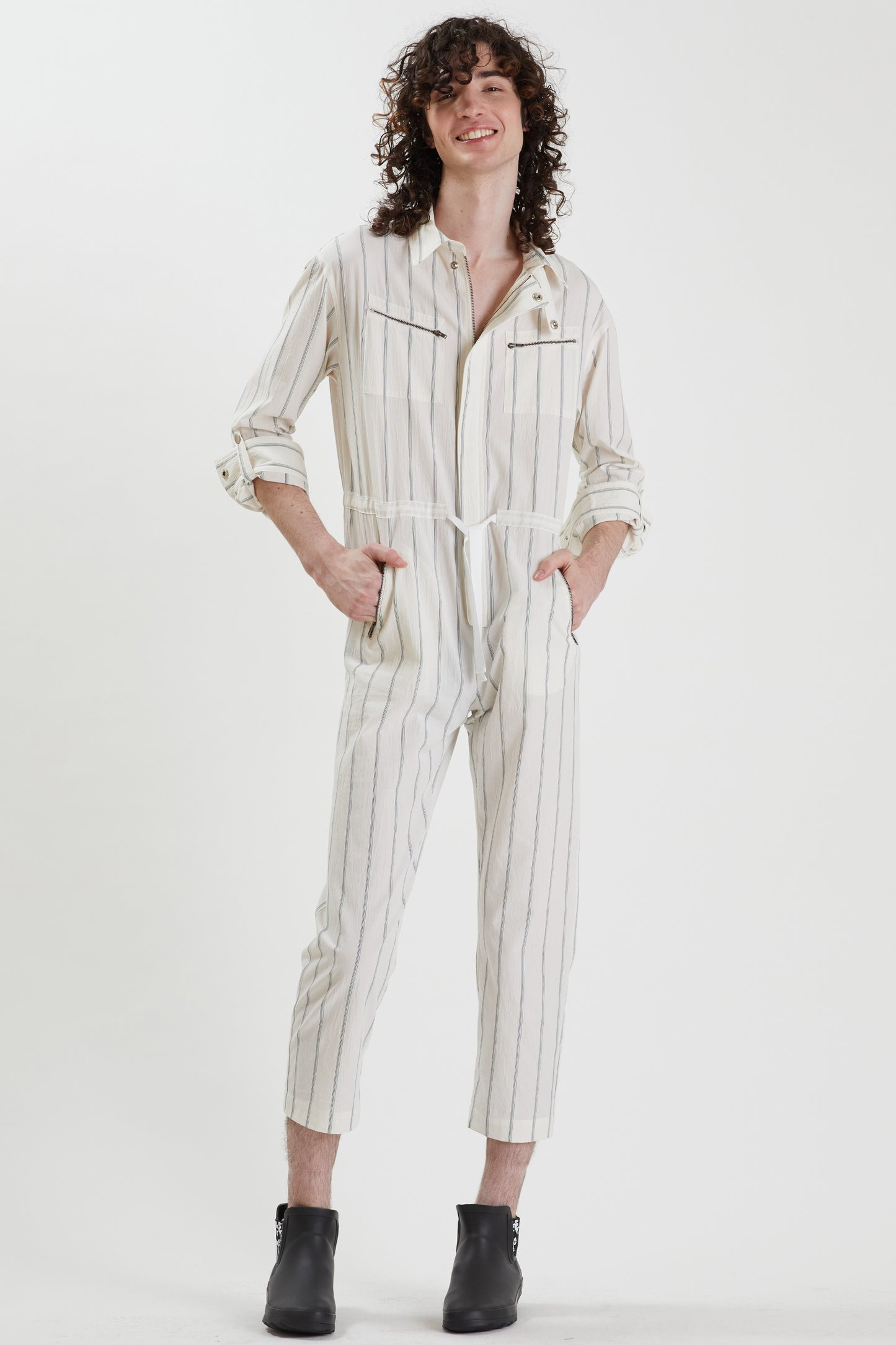 jumpsuit is a stylish and functional garment designed for everyday wear that may be for every day, but certainly will not be found everywhere! And, as they say, it’s all in the details — a classic shirt collar featuring a tab detail, adjustable snaps that allow ease of rolling up sleeves to take the heat off when necessary, and a chest patch zip pocket, all add a touch of modern utility. The waist tunnel with an adjustable drawcord allows for a customizable fit, accentuating the figure with ease. Two front and back zippered pockets provide further details and convenient storage if needed! The center front placket, adorned with a snap closure and zipper, ensures a secure and polished finish. Crafted from premium cotton, this jumpsuit effortlessly combines comfort and style to become a must-have wardrobe staple.