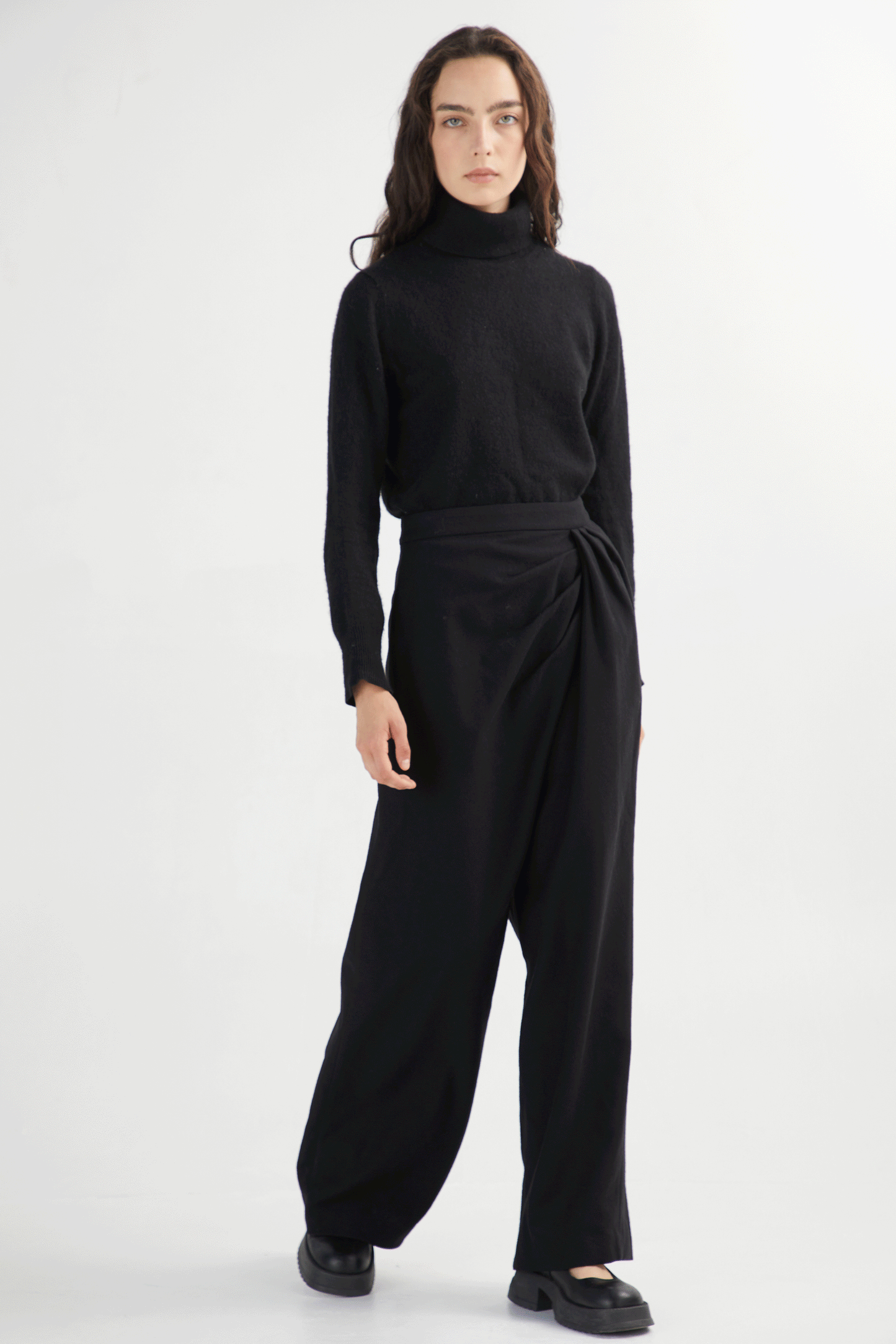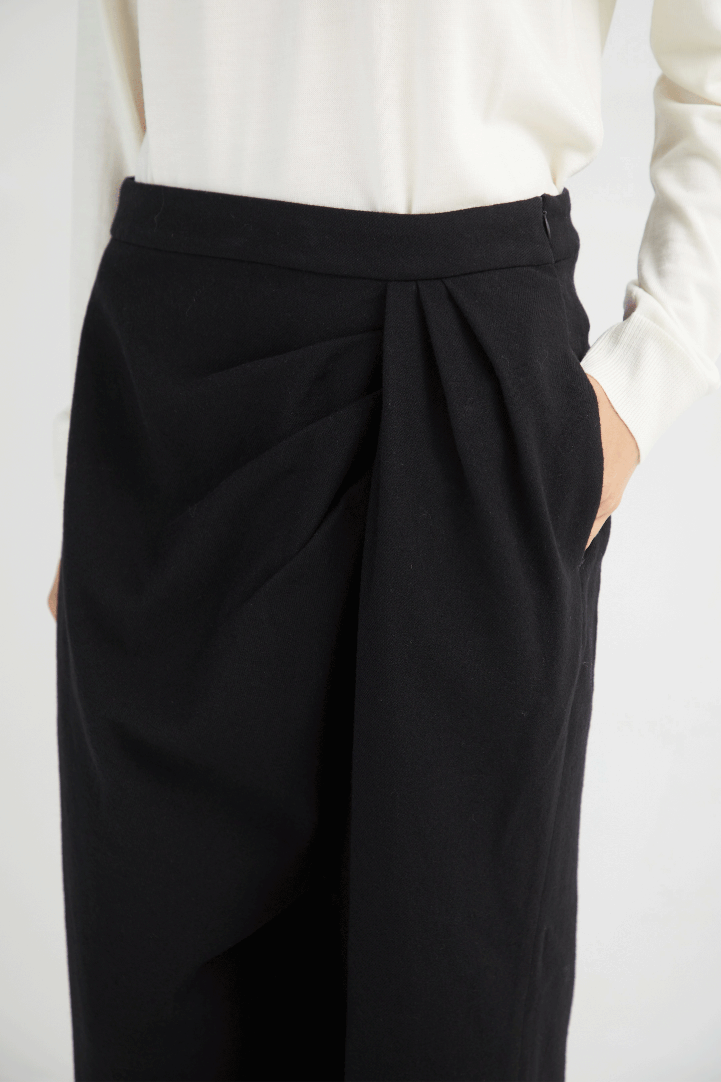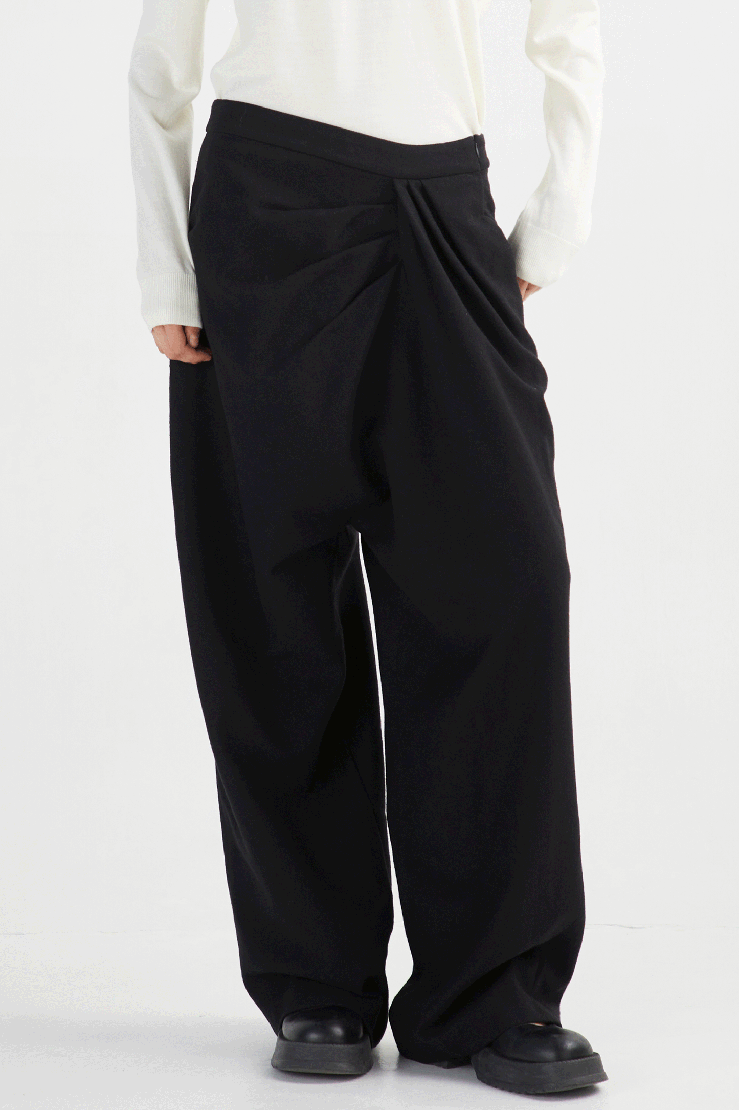 These Nish Niche trousers are a hidden gem, offering a refined take on tailoring with a loose, architectural silhouette inspired by Japanese design. The highlight is the masterful draping at the waistband which features asymmetric pleats that are a quietly bold and sculptural detail. Designed for versatility, these sophisticated and comfortable trousers pair beautifully with minimal tops for an effortlessly chic look. Practical elements like concealed side pockets, a discreet back zipper, and jetted back pockets ensure a clean finish. The slightly exaggerated length adds to the cool, slouchy attitude, making an understated statement for those who appreciate elegant details.