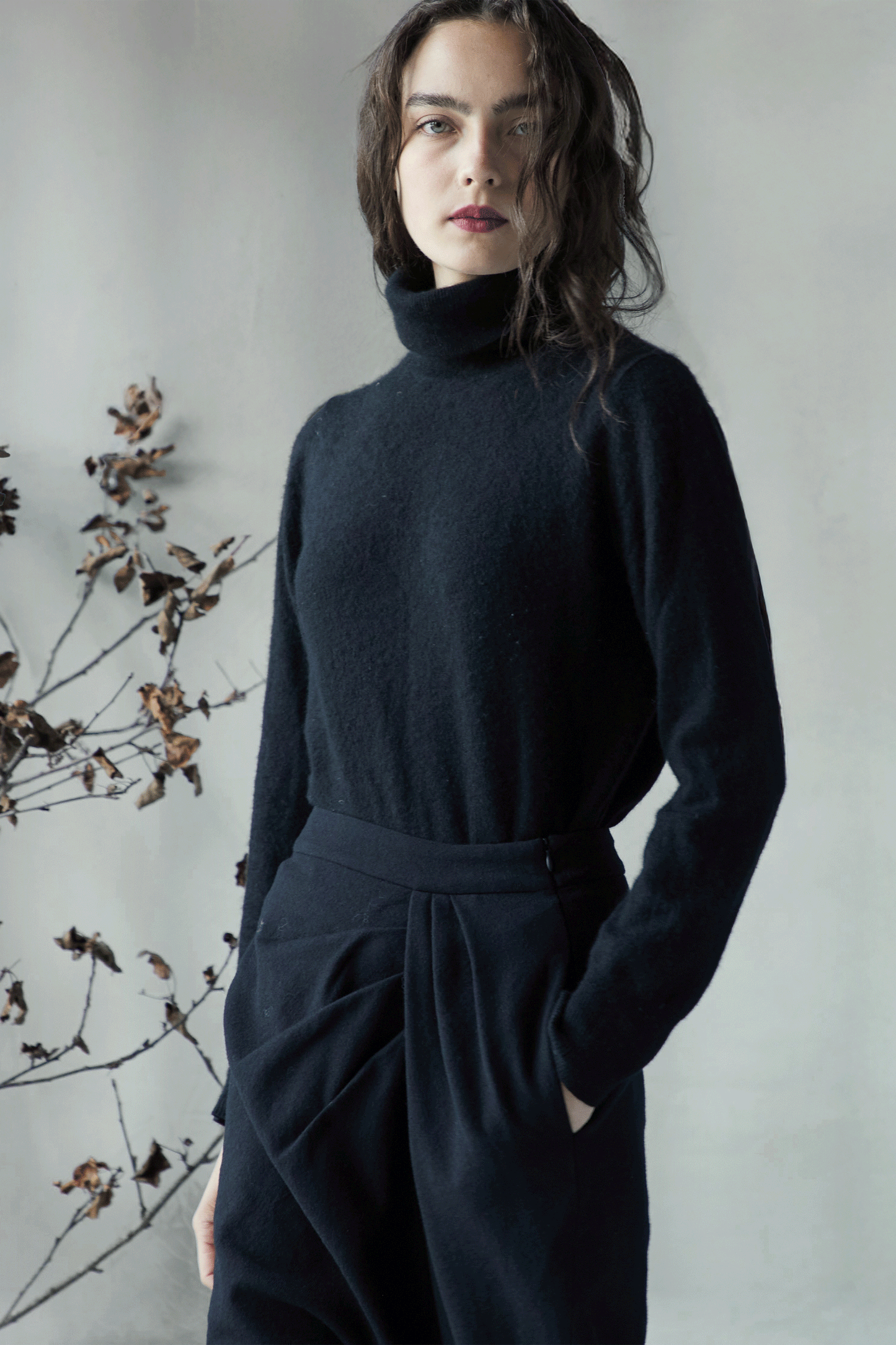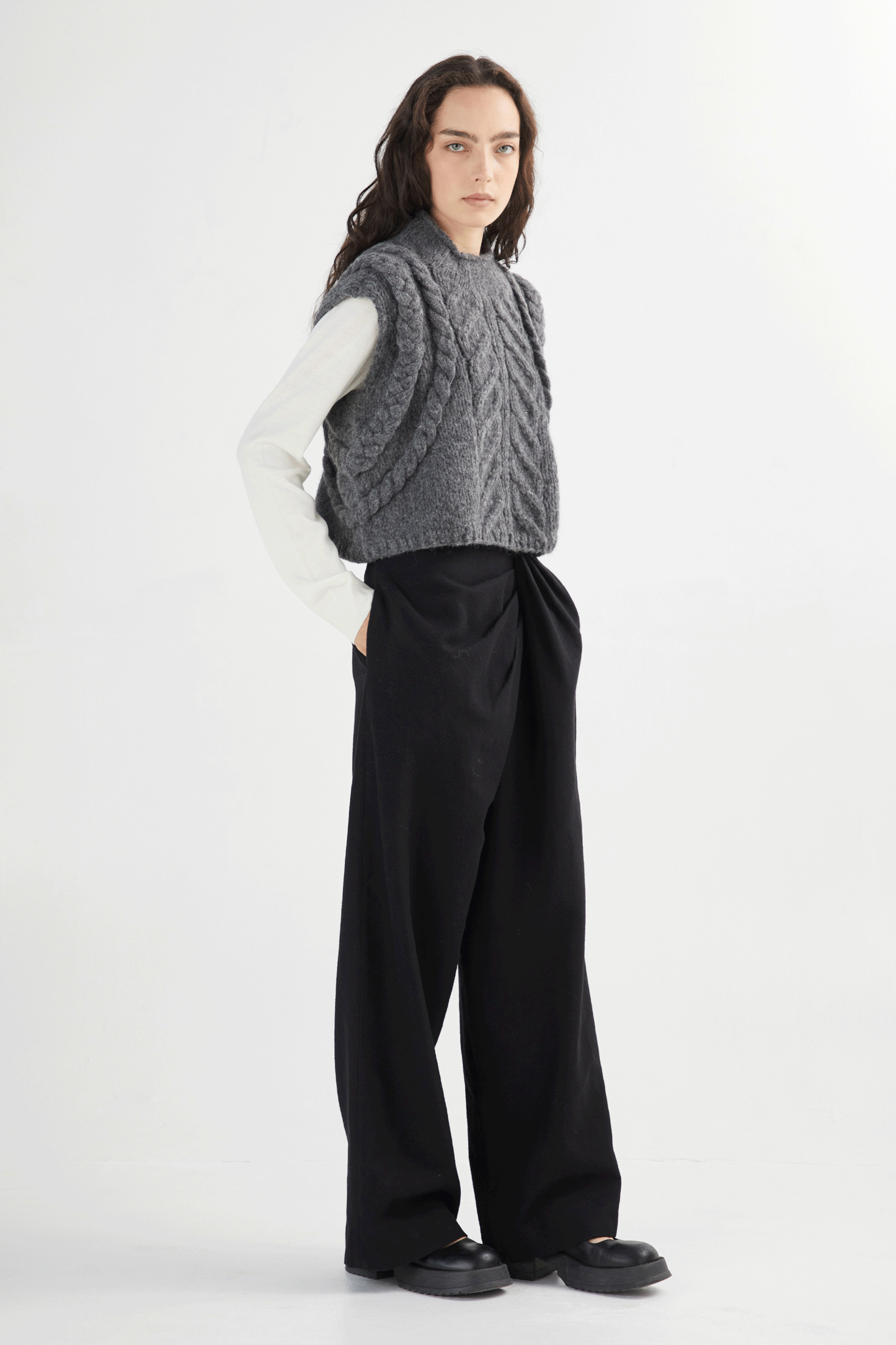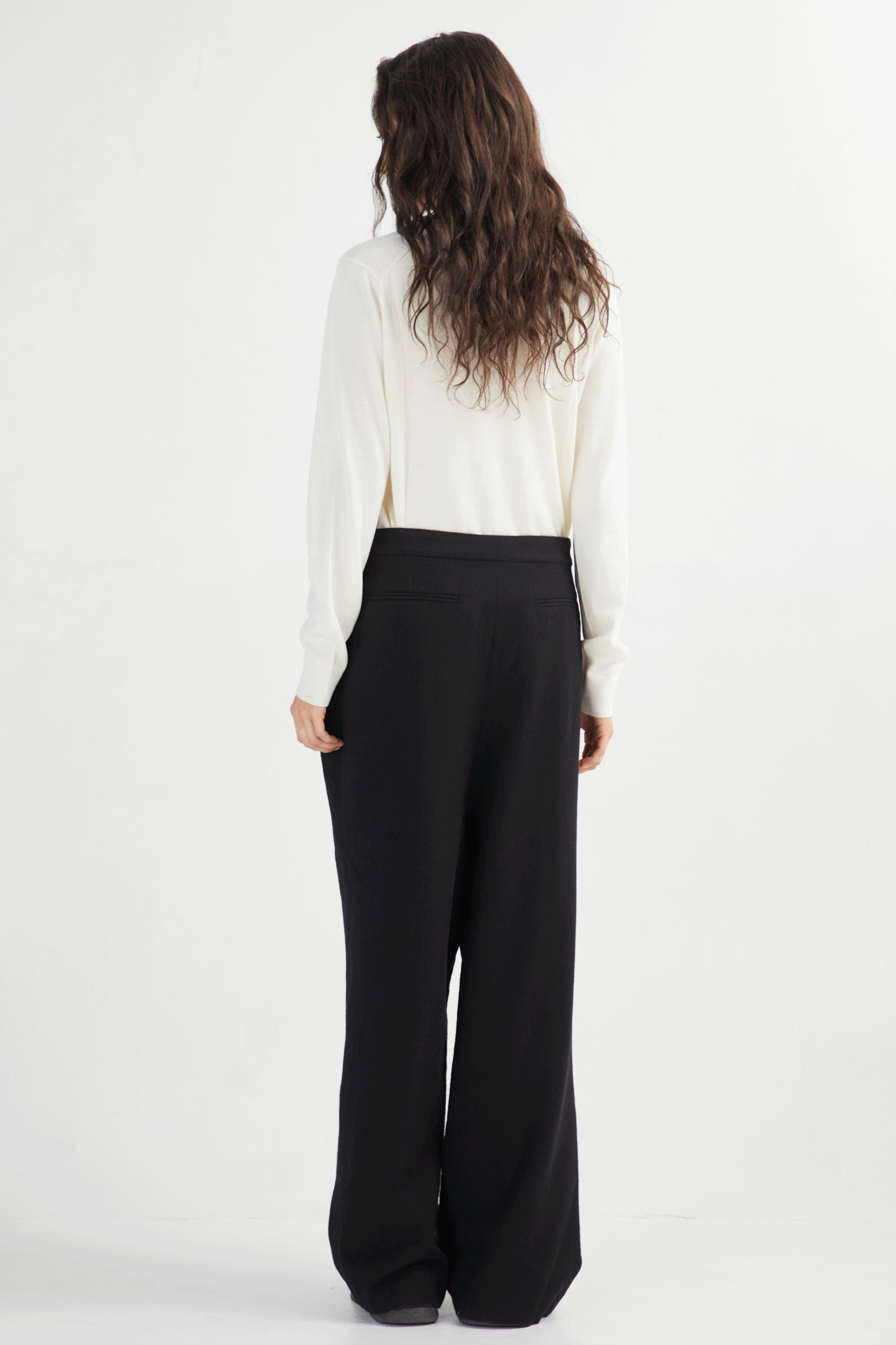 These Nish Niche trousers are a hidden gem, offering a refined take on tailoring with a loose, architectural silhouette inspired by Japanese design. The highlight is the masterful draping at the waistband which features asymmetric pleats that are a quietly bold and sculptural detail. Designed for versatility, these sophisticated and comfortable trousers pair beautifully with minimal tops for an effortlessly chic look. Practical elements like concealed side pockets, a discreet back zipper, and jetted back pockets ensure a clean finish. The slightly exaggerated length adds to the cool, slouchy attitude, making an understated statement for those who appreciate elegant details.