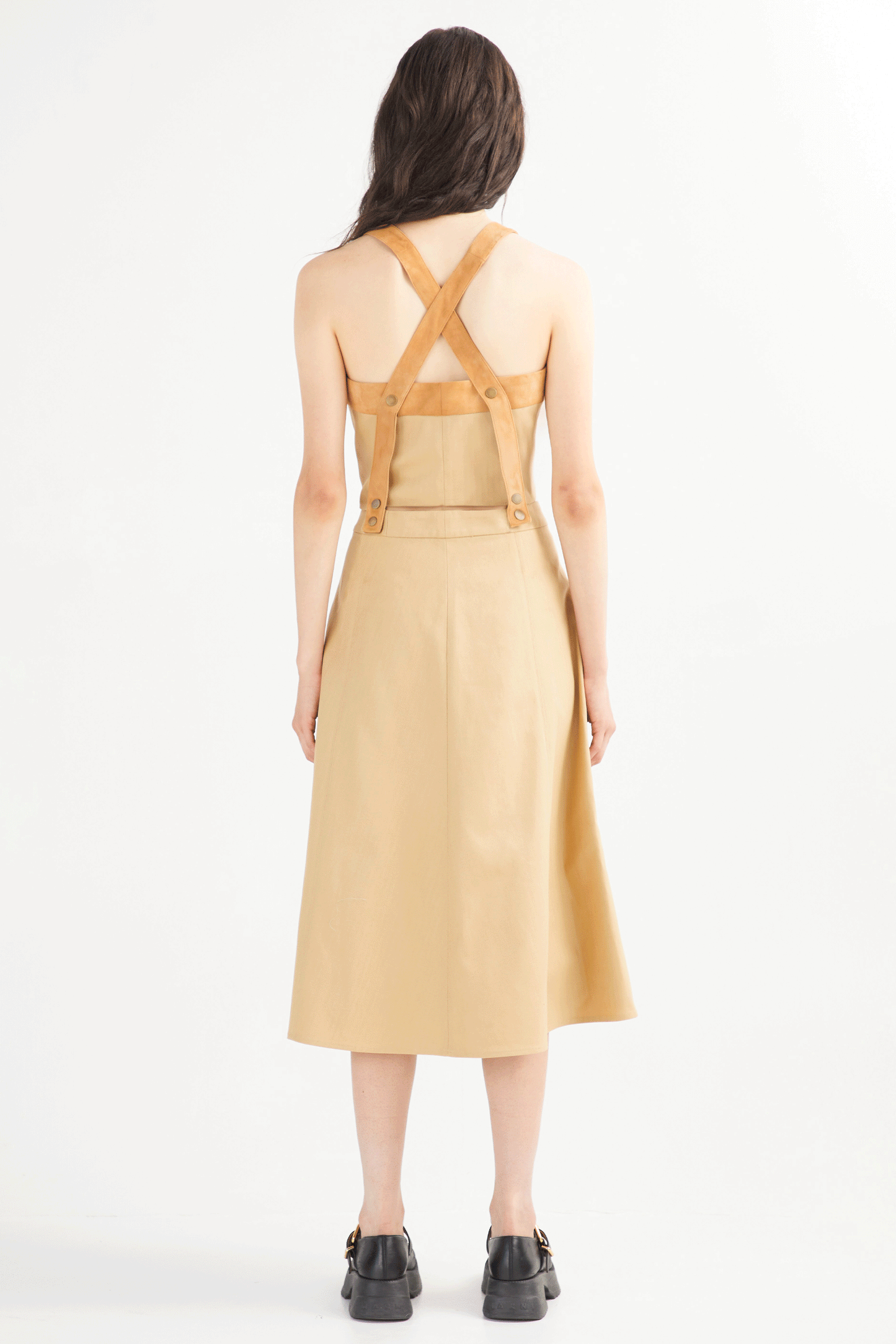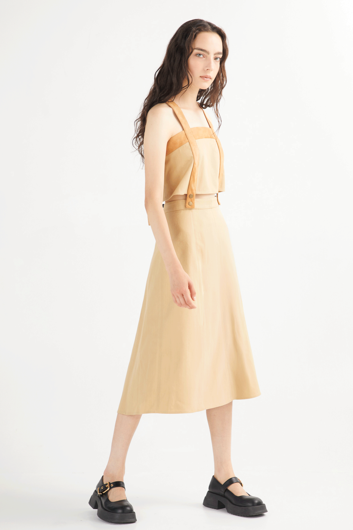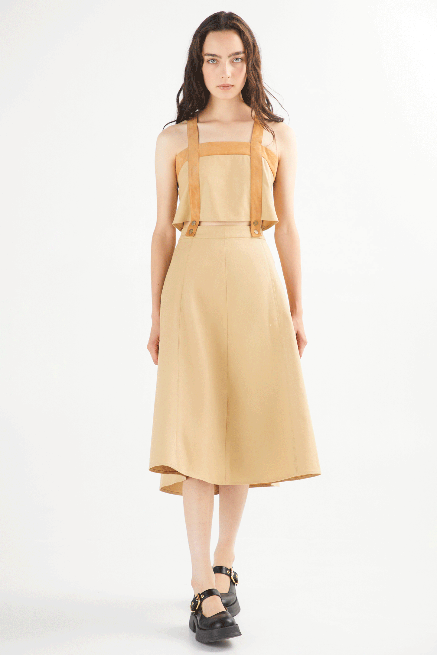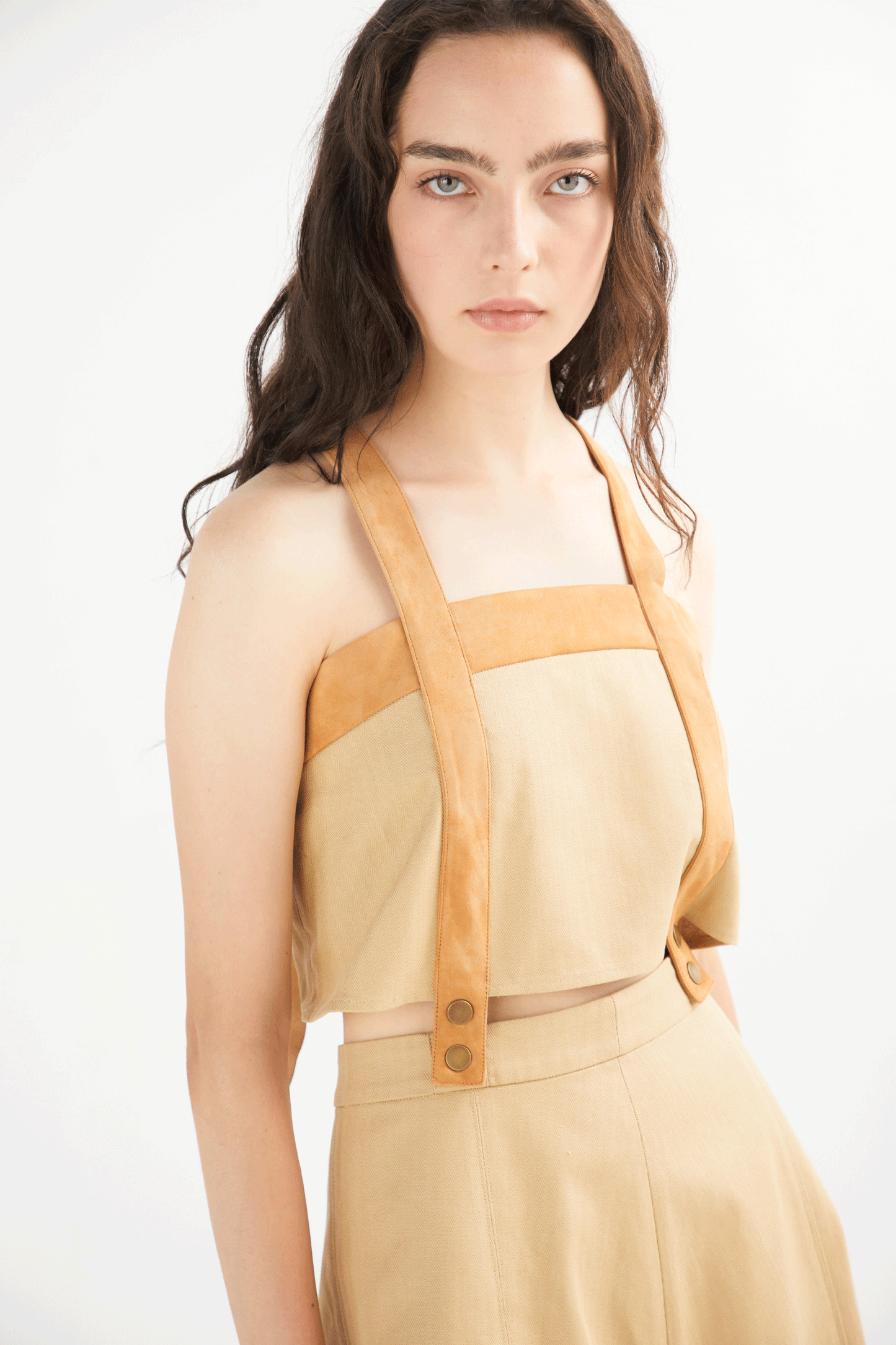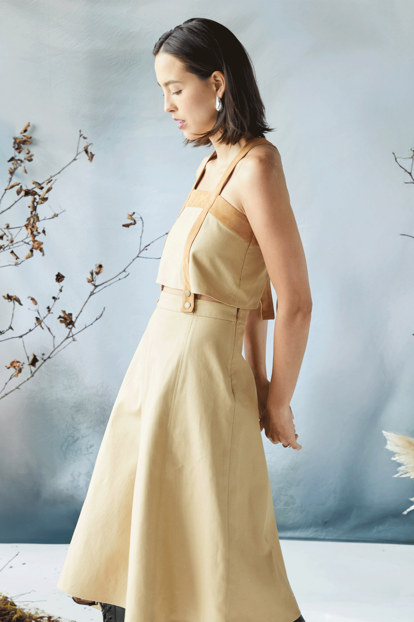 This signature look for the collection is a stunner. The delicately constructed two-piece ensemble embodies the brand’s philosophy of playful yet thoughtful design. The sharp, geometric cut of the top features a signature square neckline with baby lambskin suede straps. The top’s suede straps have two metal snaps in the front and the back which fasten at the skirt’s waistband, allowing you to choose the length you prefer The straps at the back of the top criss-cross adding another surprise design detail. The accompanying A-line skirt boasts a flared hem created by vertical panels for a flattering and elongated silhouette; and, the irresistible herringbone texture of the fabric adds a touch of richness and invites a closer look, proving that simple forms and rich textures are the perfect combination. This versatile set can be worn together or separately, always with intention, reflecting Nish Niche’s commitment to creating sophisticated, timeless and unique pieces.