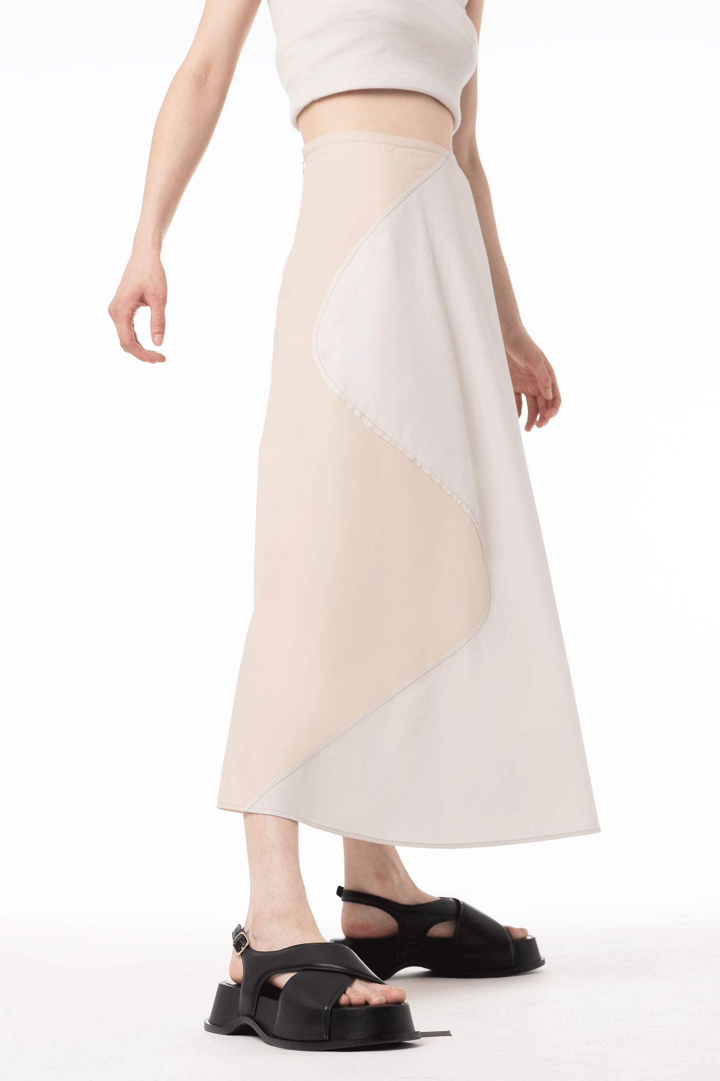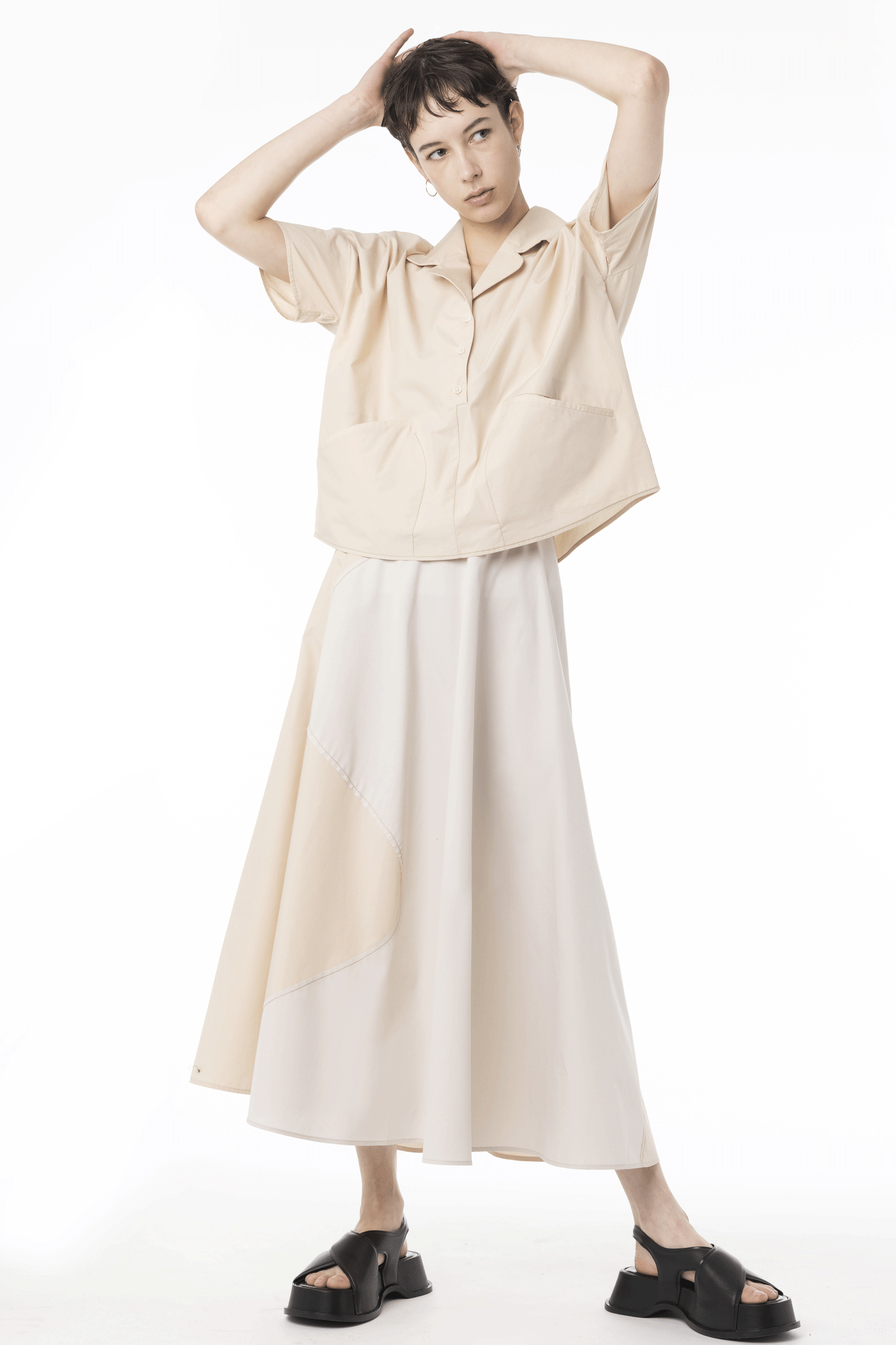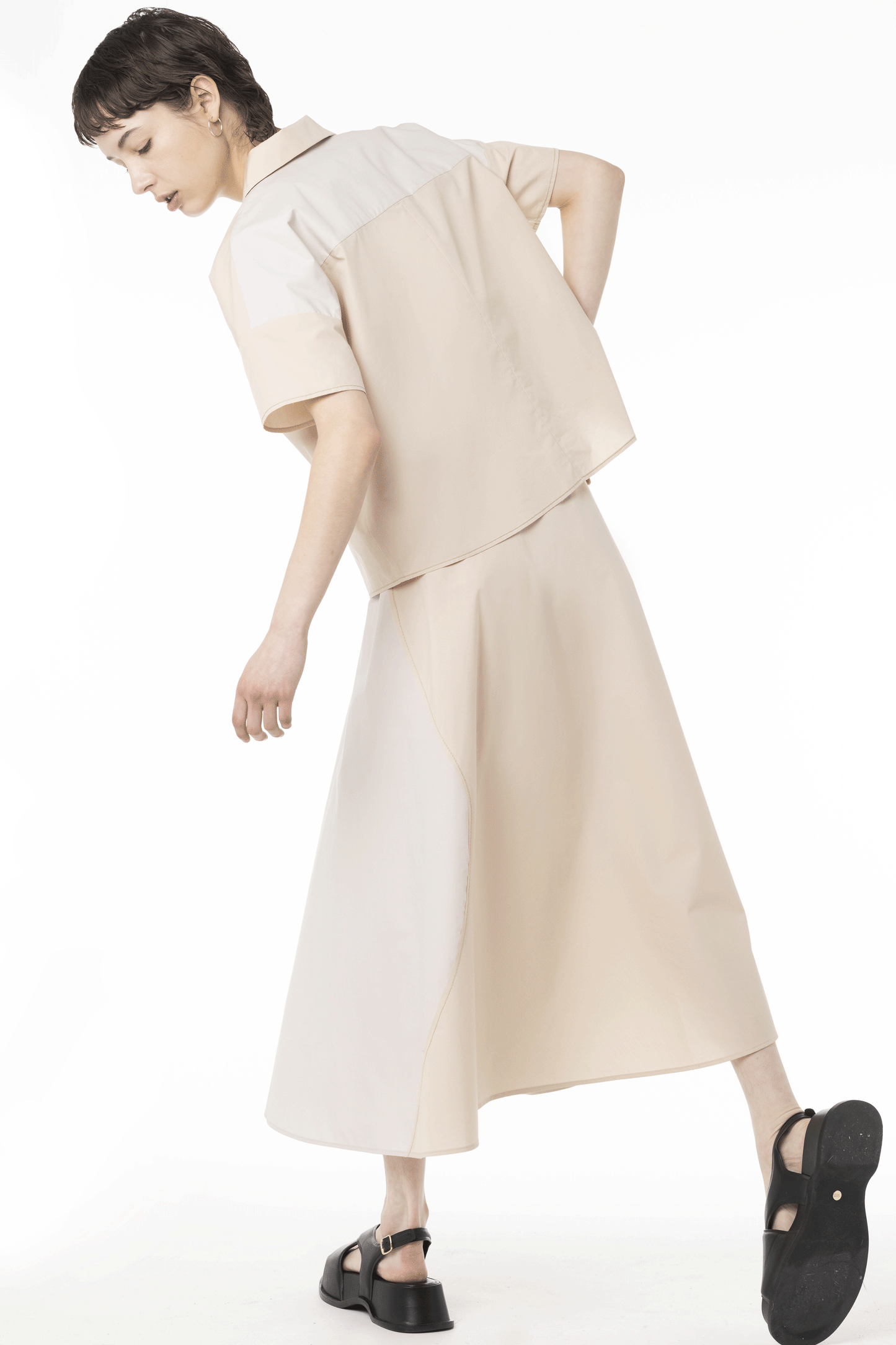 Crafted in our signature Japanese typewriter cotton, our Sand Dune Skirt conveys a sense of freedom and joy. A nipped-in waist and midi-length hemline are accentuated by wavy panels in tone-on-tone color blocking with a sage green top stitch. The skirt mimics the organic elements of the dunes.
