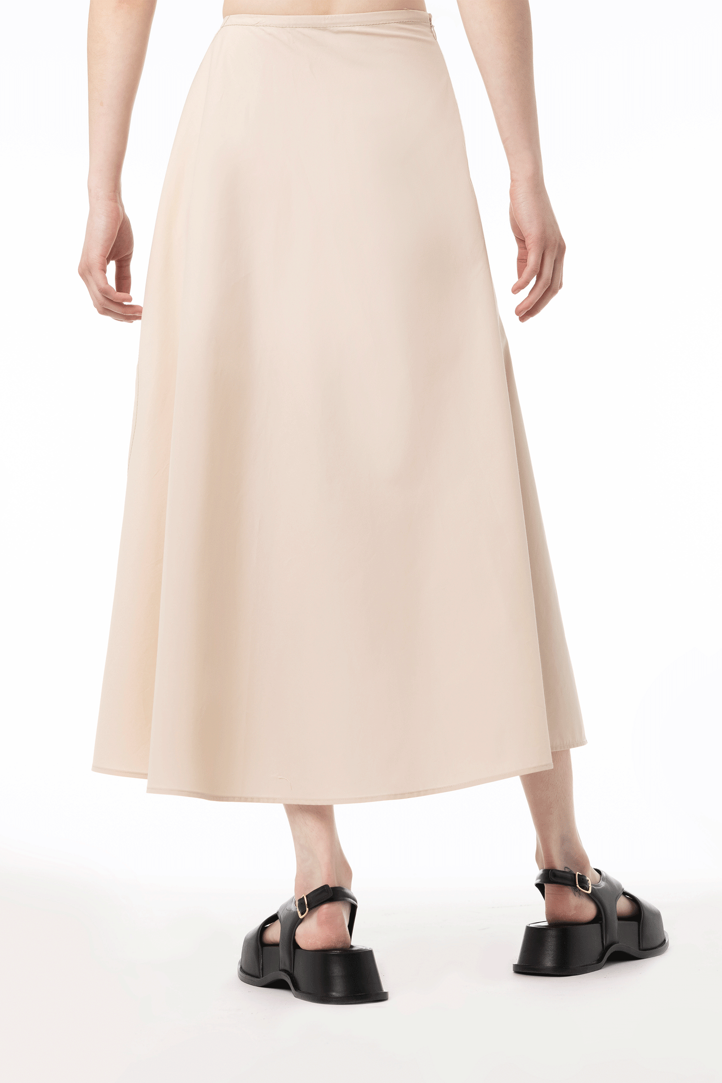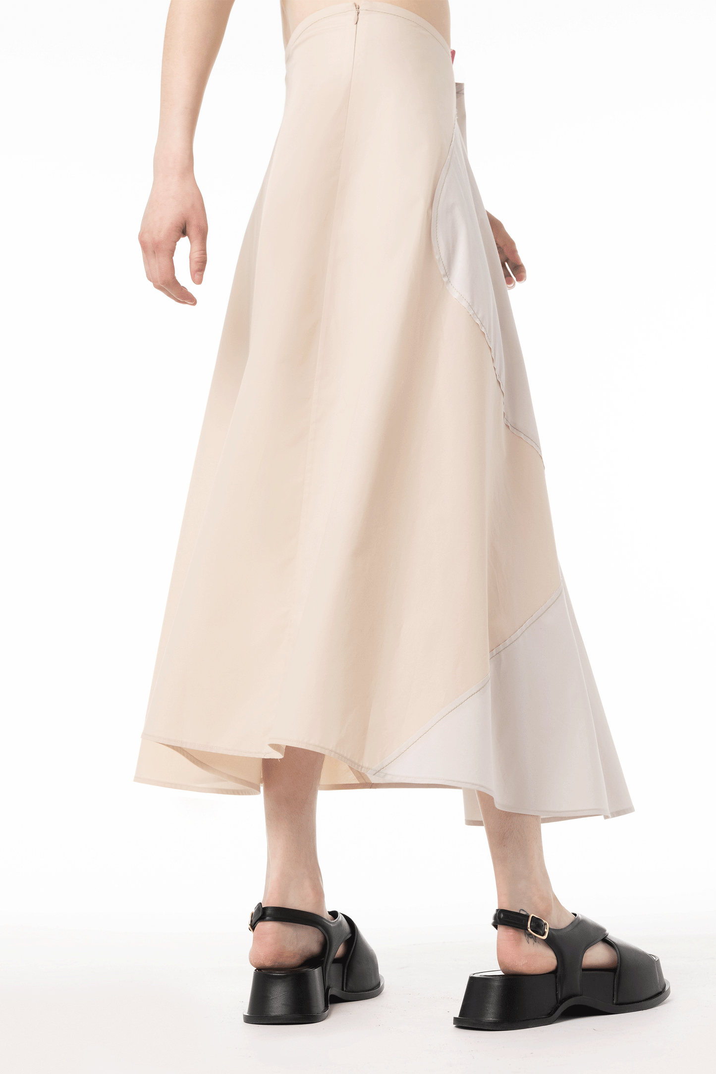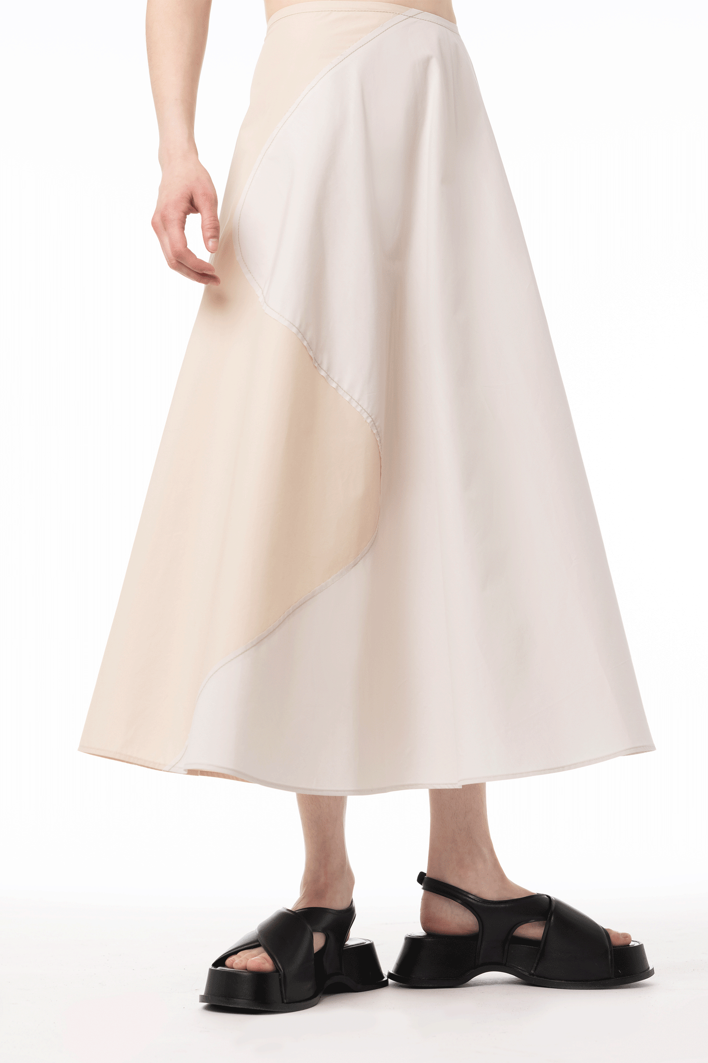 Crafted in our signature Japanese typewriter cotton, our Sand Dune Skirt conveys a sense of freedom and joy. A nipped-in waist and midi-length hemline are accentuated by wavy panels in tone-on-tone color blocking with a sage green top stitch. The skirt mimics the organic elements of the dunes.