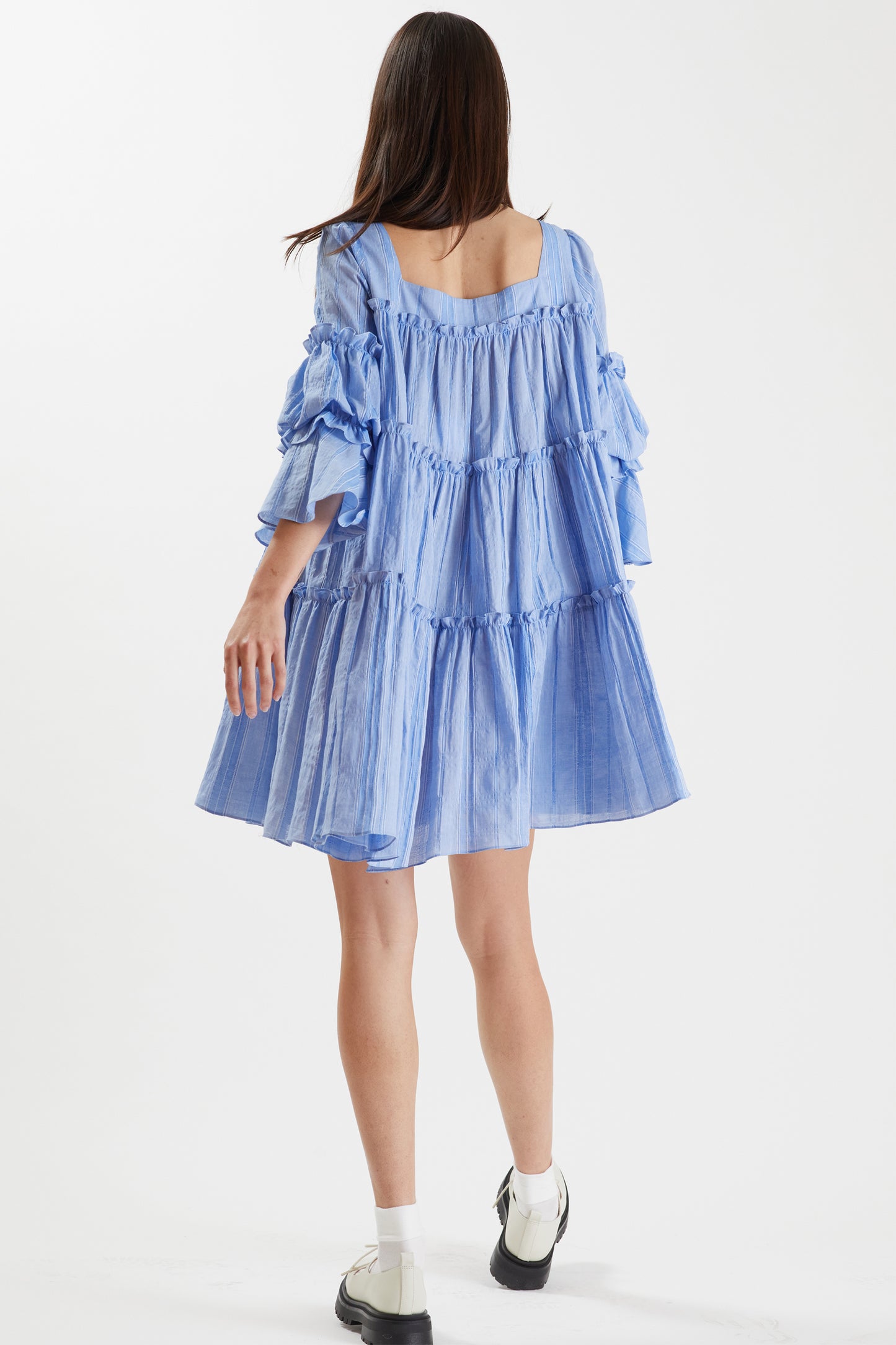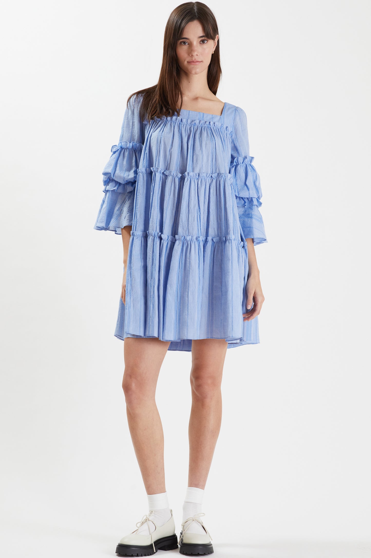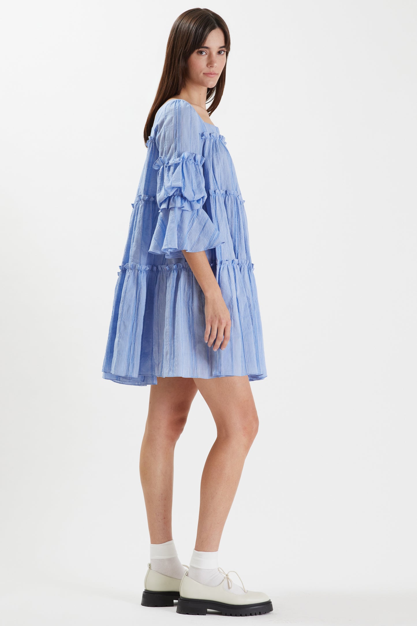 Our hottest mini dress is back in new colors for the summer season! This voluminously tiered dress exudes playful charm that makes you want to twirl like a star! The A-line silhouette, the ¾ length tiered sleeves and a hemline that falls gracefully above the knee all ensure a flattering fit for all body types. Complete with a classic squared neckline, this dress can be dressed up or down depending on your mood.