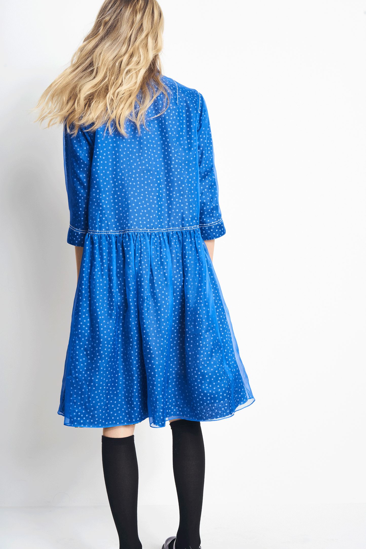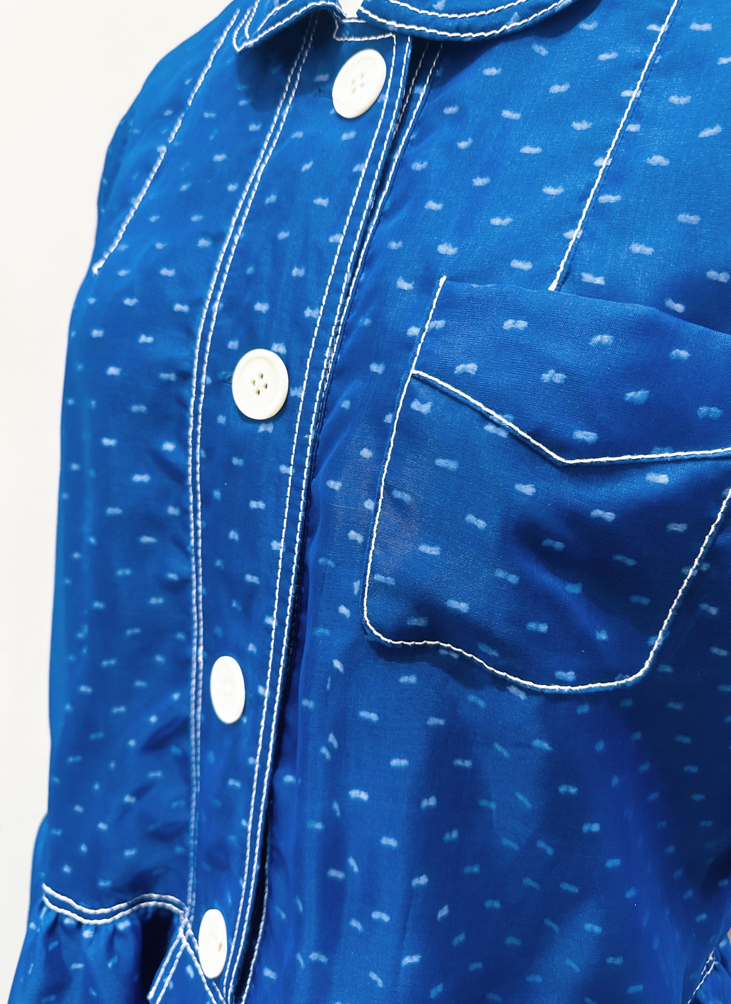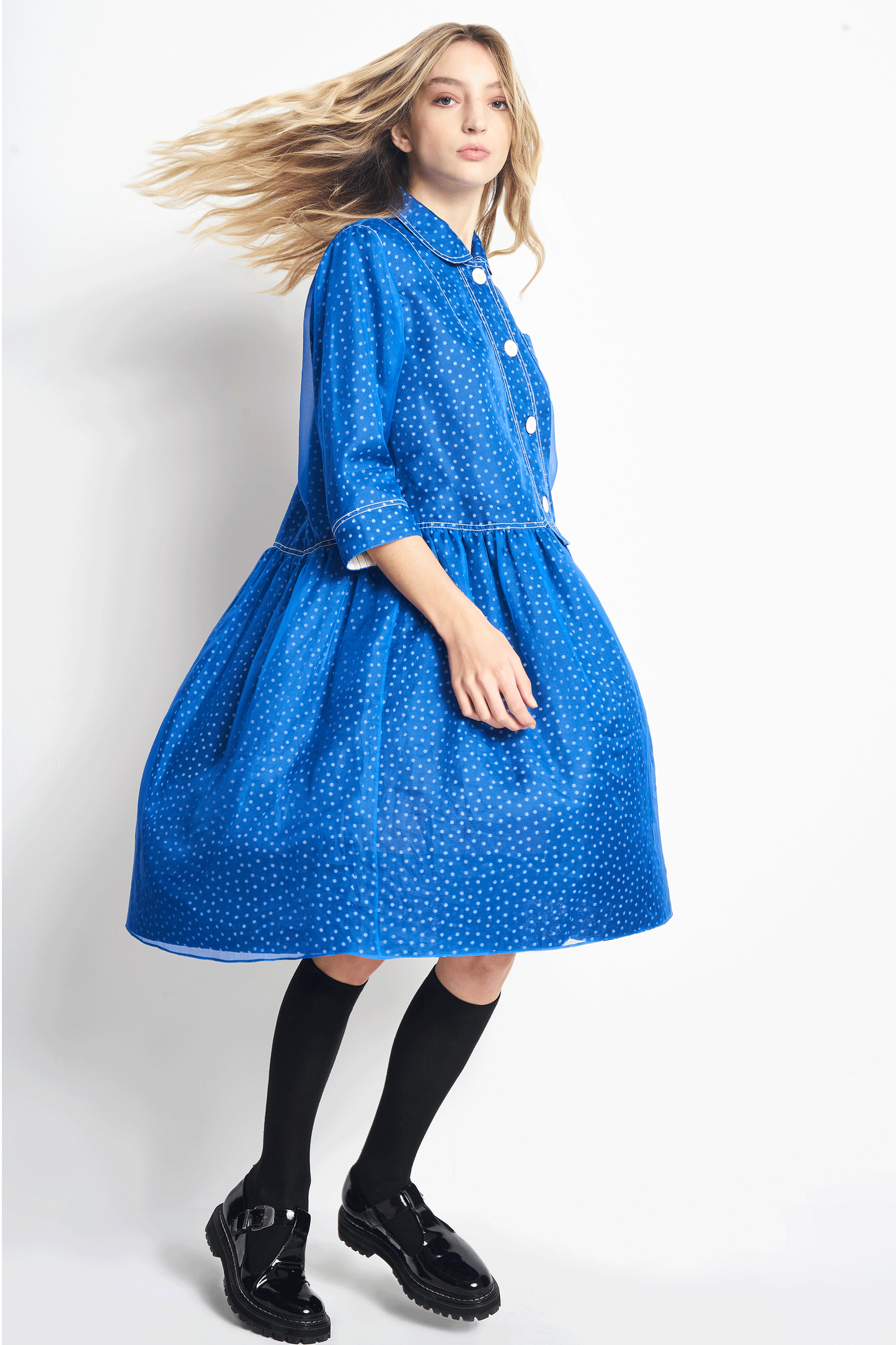 You will need to look twice at our double layered dress which combines a Swiss dot, dobby, jaquard cotton pattern below a gorgeous silk organza overlay. The Peter Pan collar shirt dress is filled with special details including white, contrast top stitching, a chest pocket, and a wide placket with white buttons. The 3/4 sleeves has turn back cuffs. It all comes together in a flattering silhouette with a fitted shoulder and slight A-line hem. The combination is stunning and the overlay of silk creates a true tromp d’oeil effect. You are sure to dazzle in this one-of-a kind dress!