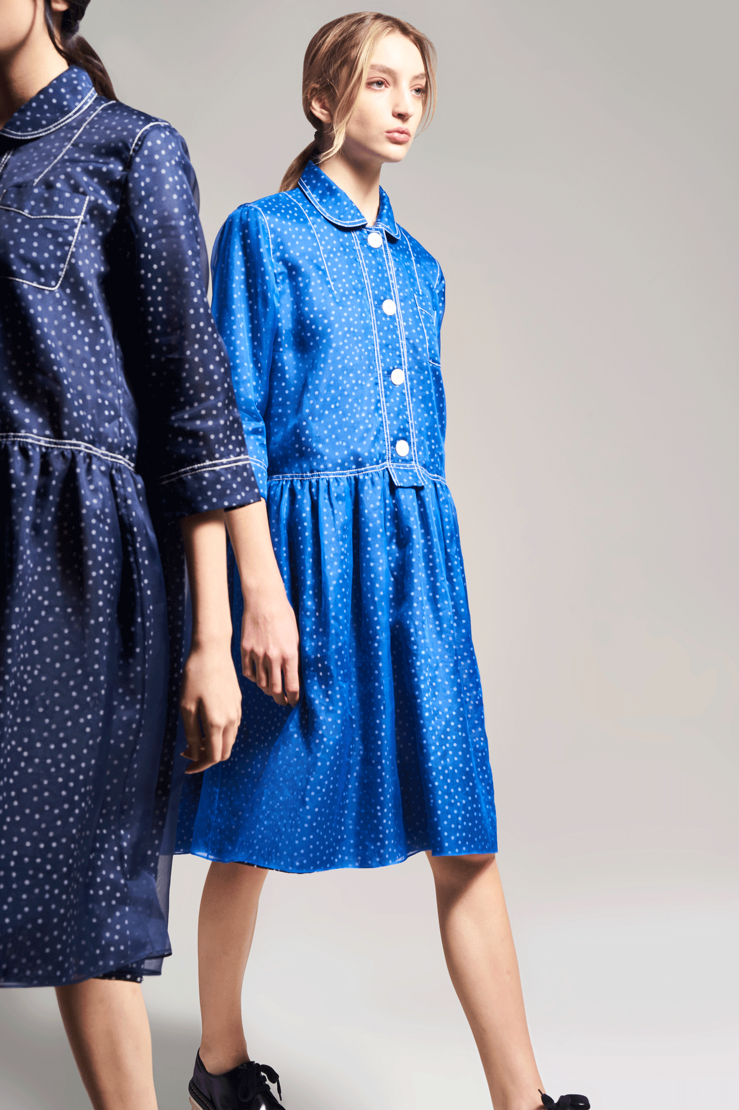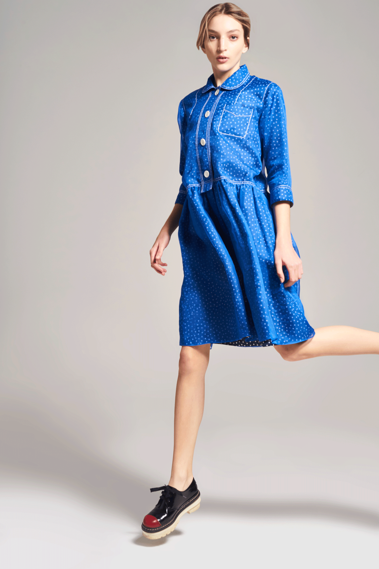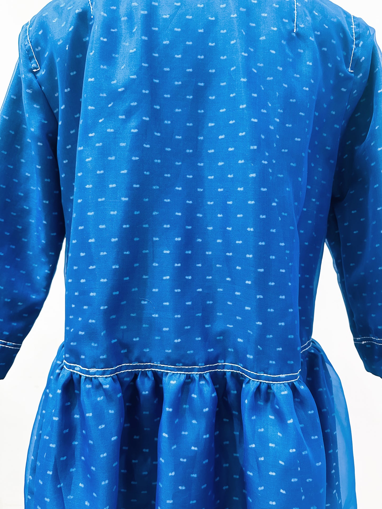 You will need to look twice at our double layered dress which combines a Swiss dot, dobby, jaquard cotton pattern below a gorgeous silk organza overlay. The Peter Pan collar shirt dress is filled with special details including white, contrast top stitching, a chest pocket, and a wide placket with white buttons. The 3/4 sleeves has turn back cuffs. It all comes together in a flattering silhouette with a fitted shoulder and slight A-line hem. The combination is stunning and the overlay of silk creates a true tromp d’oeil effect. You are sure to dazzle in this one-of-a kind dress!