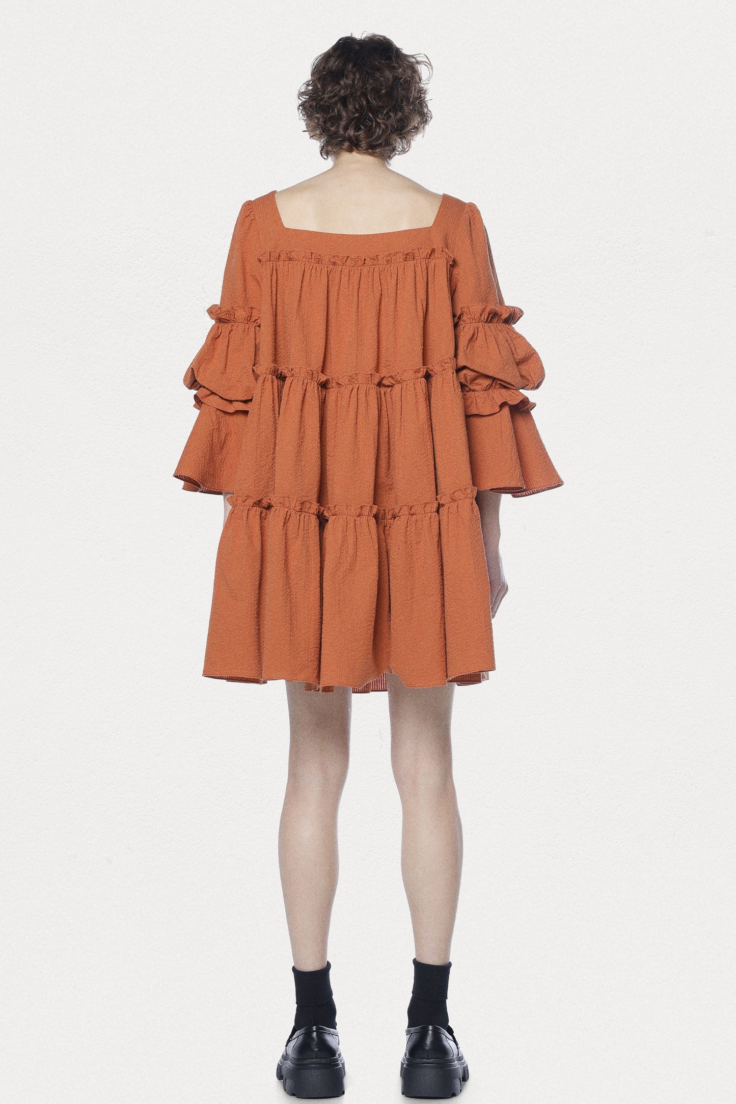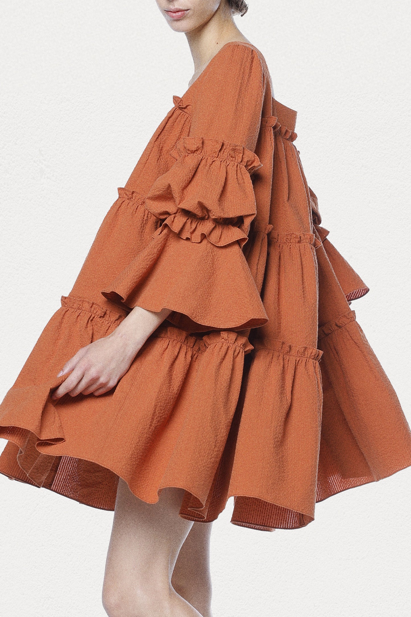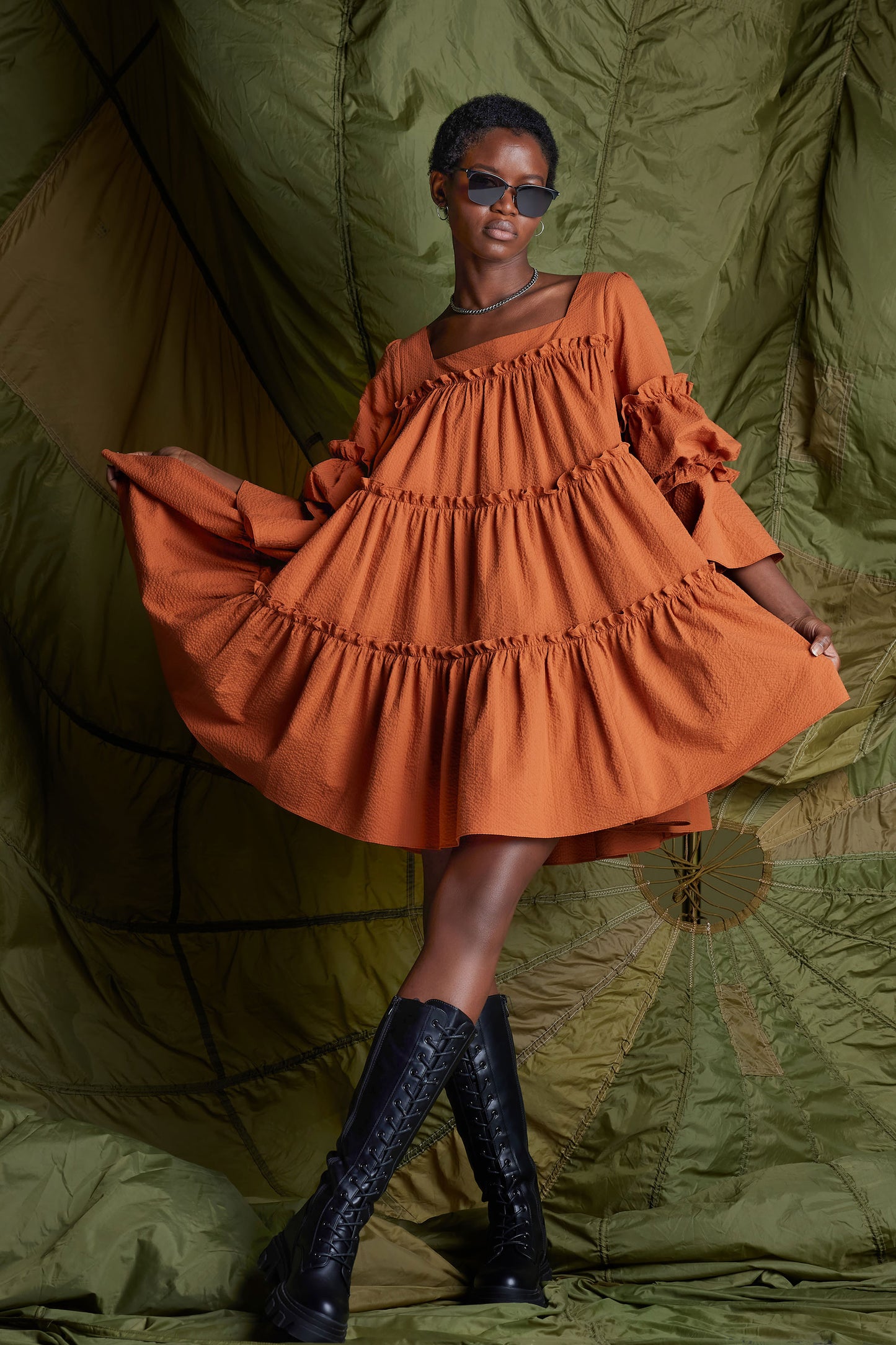 Our iconic Splash Dress, now available in stunning burnt orange is perfect for the change of season. Crafted from a subtle textured fabric, this dress exudes elegance while maintaining a playful, voluminously tiered design. Its flattering A-line silhouette, ¾ length tiered sleeves, and above-the-knee hemline offer a graceful fit for all body types. With a chic squared neckline, this versatile dress can be dressed up or down for any occasion.