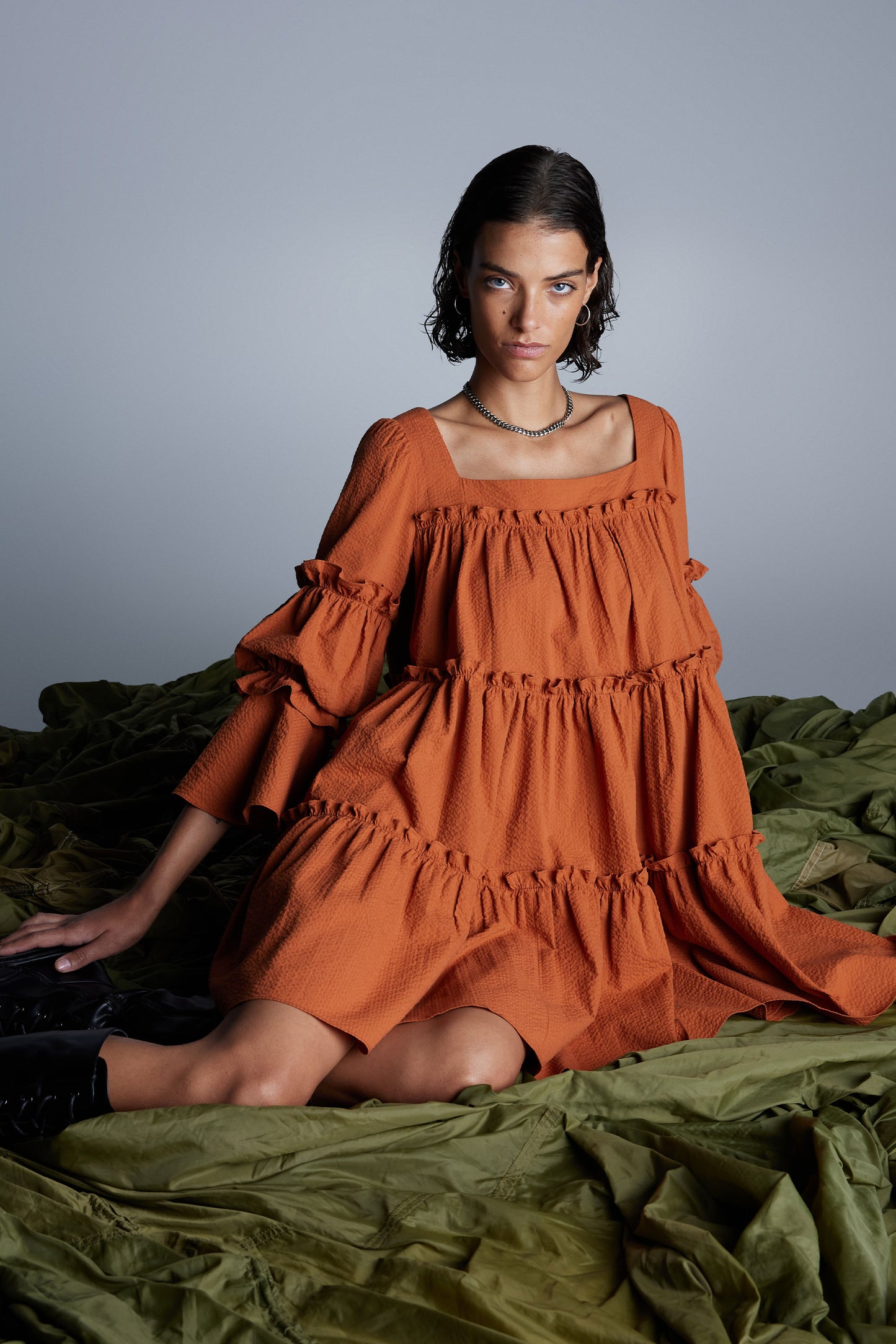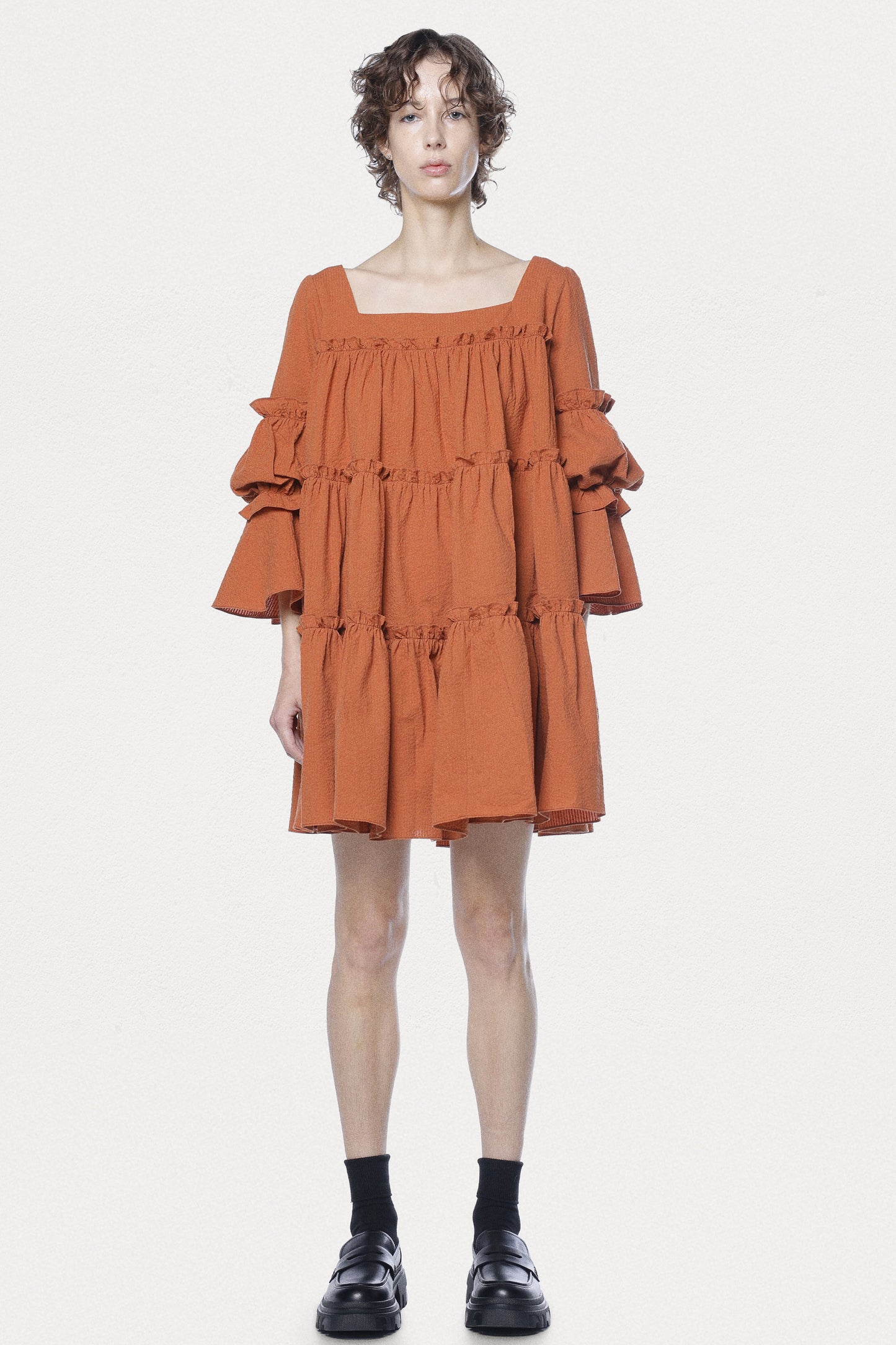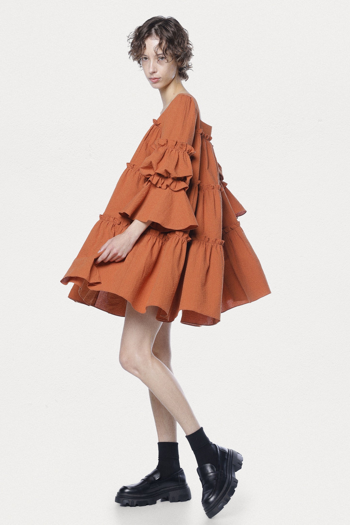 Our iconic Splash Dress, now available in stunning burnt orange is perfect for the change of season. Crafted from a subtle textured fabric, this dress exudes elegance while maintaining a playful, voluminously tiered design. Its flattering A-line silhouette, ¾ length tiered sleeves, and above-the-knee hemline offer a graceful fit for all body types. With a chic squared neckline, this versatile dress can be dressed up or down for any occasion.