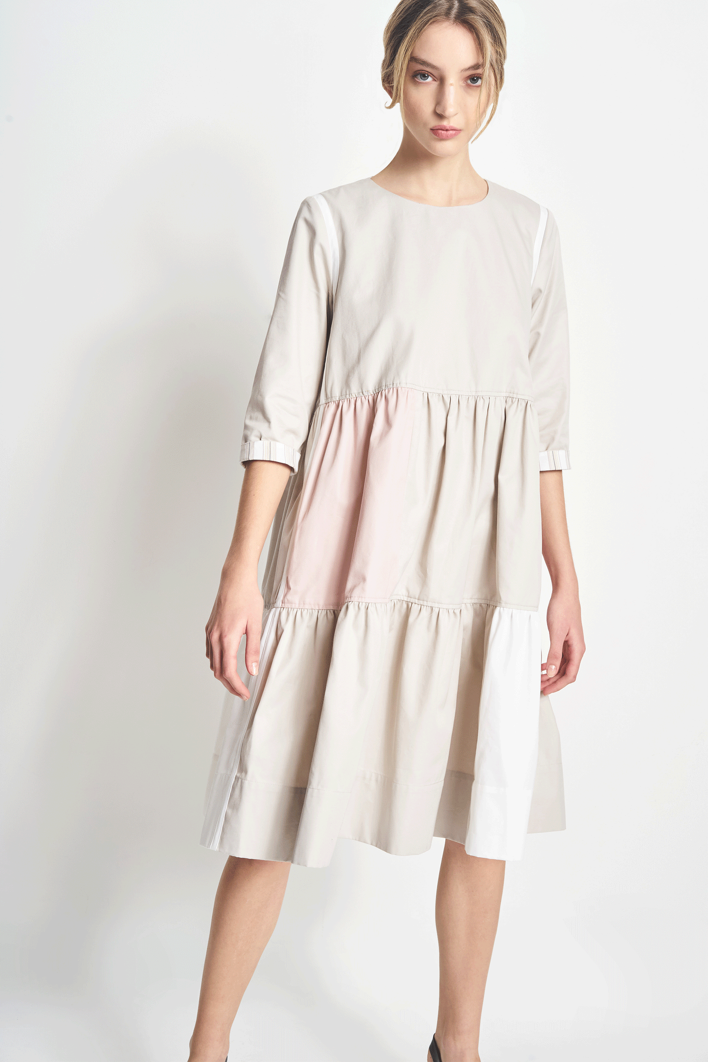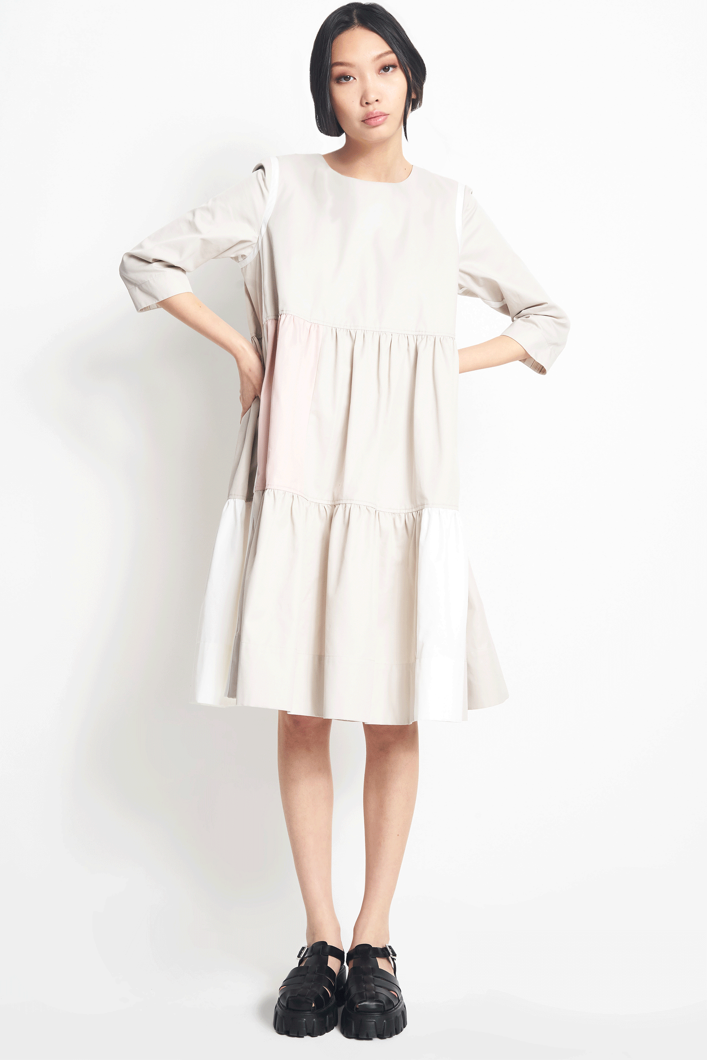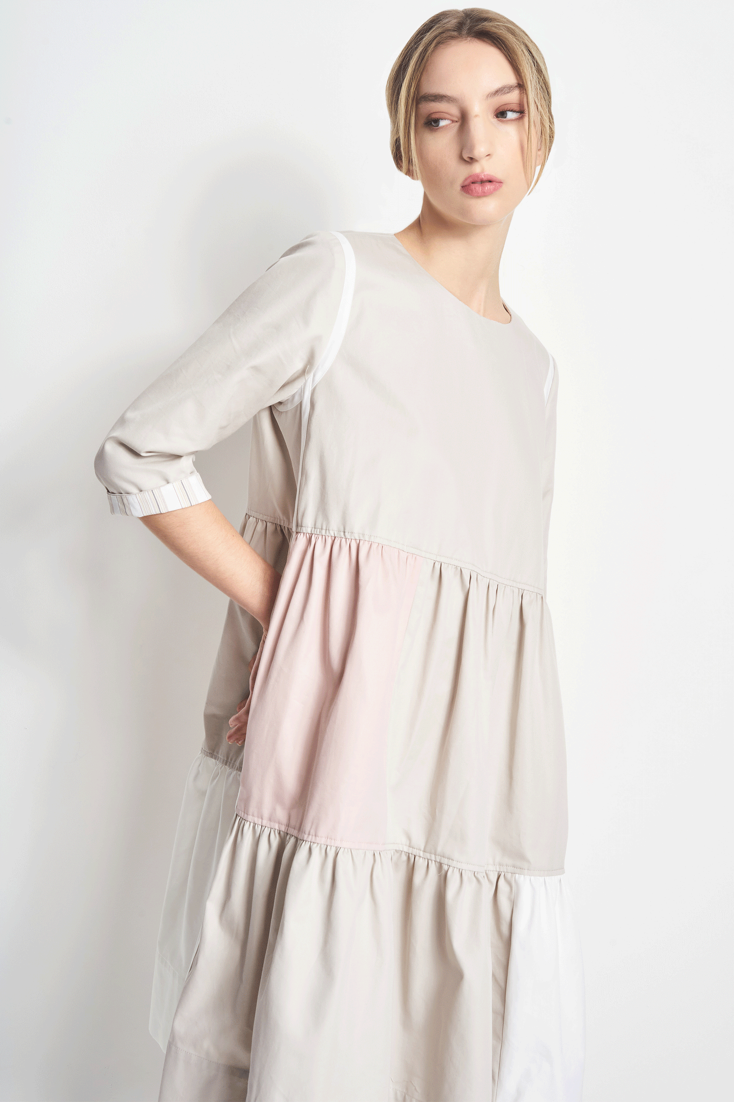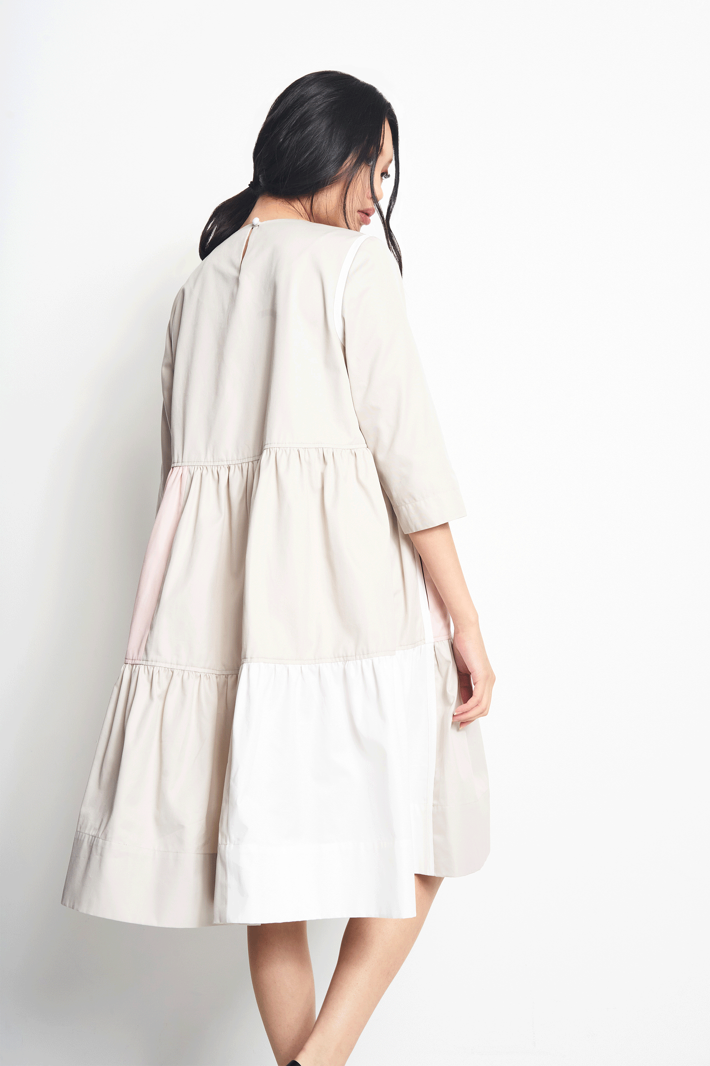 Our gorgeous cotton twill dress works any time of the year. We’ve switched up our color palette to a gorgeous taupe, pink and white so the overall effect is neutral with discreet pops of color. The playful, color-blocked, tiered silhouette with contrast pipping in pink is comfortable and relaxed. Striped shirting facings in the cuffs and neck and side seam pockets are customized details that make this a unique dress for all body types. The look is simple and elegant and can be worn casually or dressed up depending on your mood.