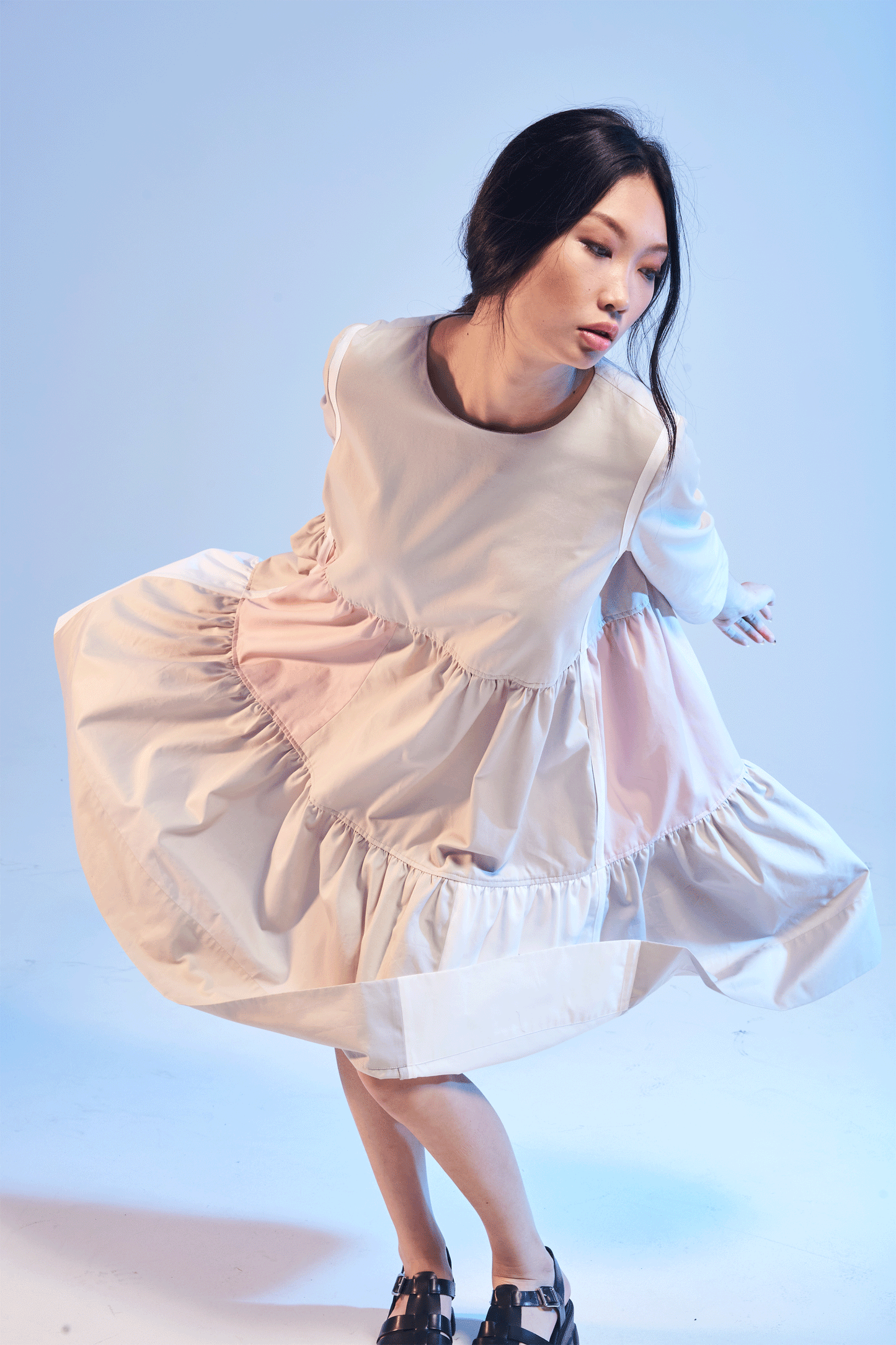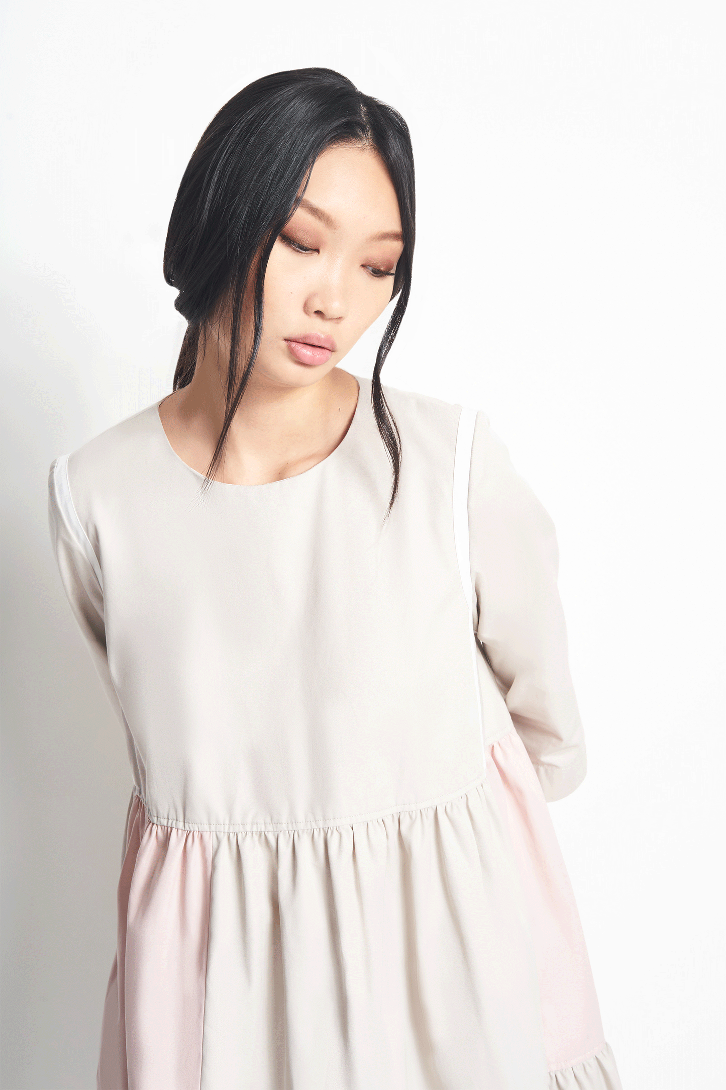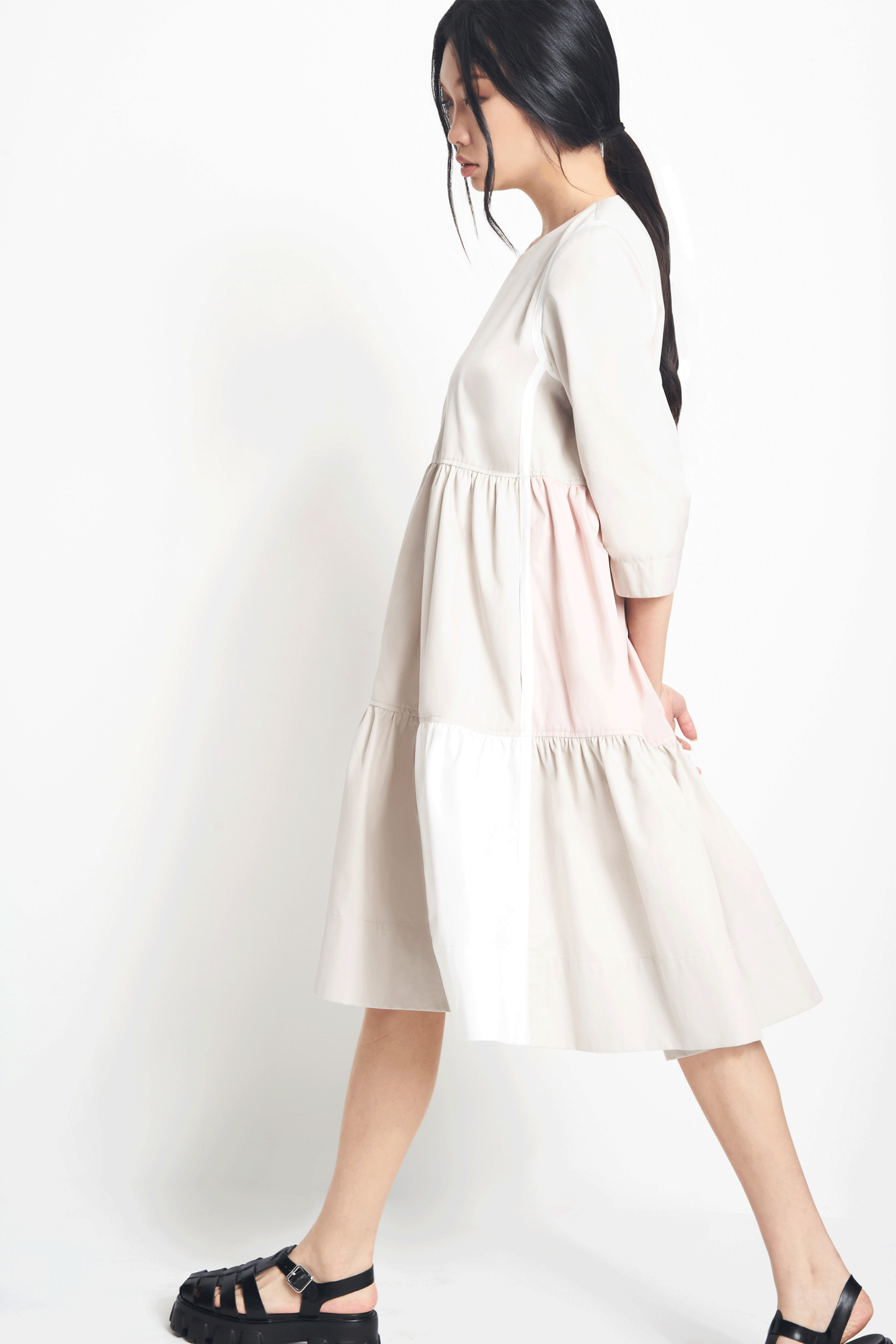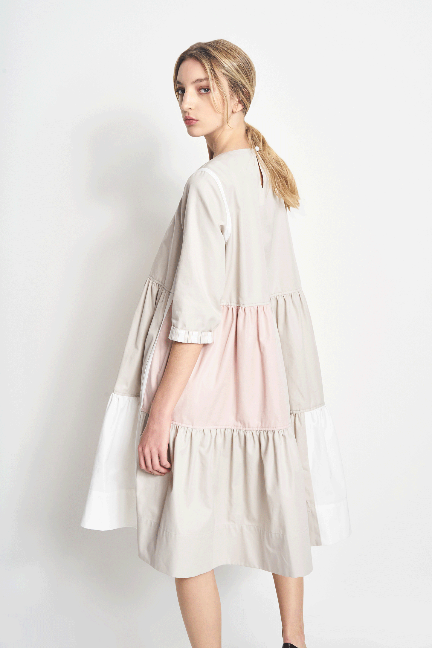Our gorgeous cotton twill dress works any time of the year. We’ve switched up our color palette to a gorgeous taupe, pink and white so the overall effect is neutral with discreet pops of color. The playful, color-blocked, tiered silhouette with contrast pipping in pink is comfortable and relaxed. Striped shirting facings in the cuffs and neck and side seam pockets are customized details that make this a unique dress for all body types. The look is simple and elegant and can be worn casually or dressed up depending on your mood.