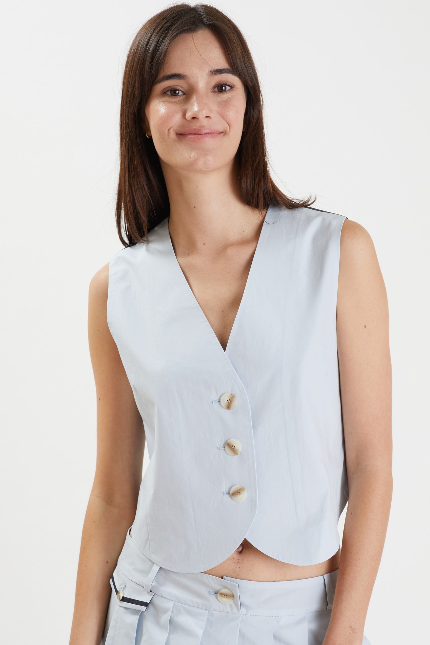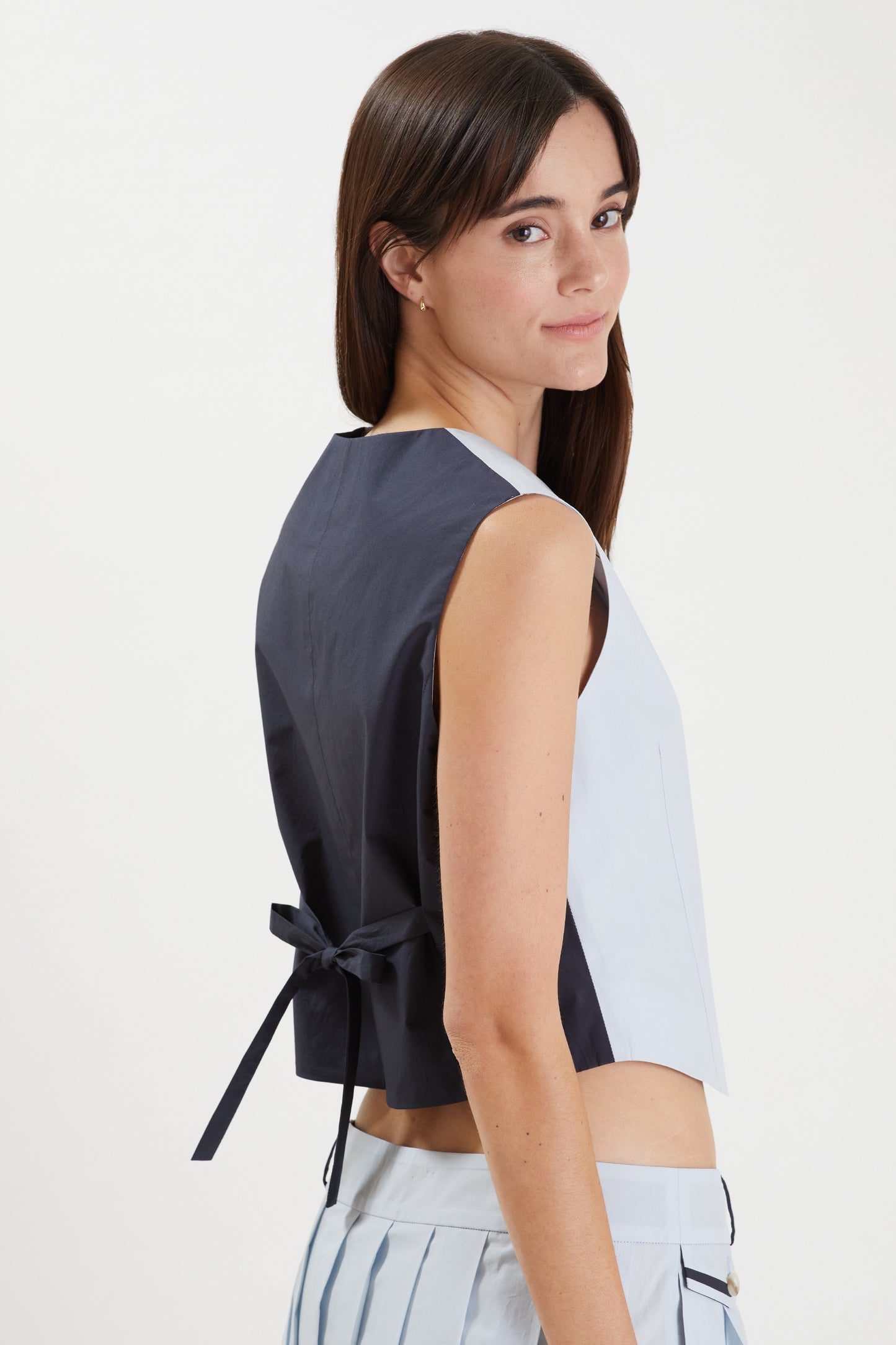 Get your Vest on with our must have piece for your wardrobe this summer. Designed with precision, our vest features a contrast back and intricate detailing including front darts and back princess seams for a tailored fit. Three horn buttons at the center front are subtle yet exude sophistication. The waist strap at the back allows for adjustable shaping. This vest is waiting for you to style it - a ruffled blouse, a tank - let your imagination go!