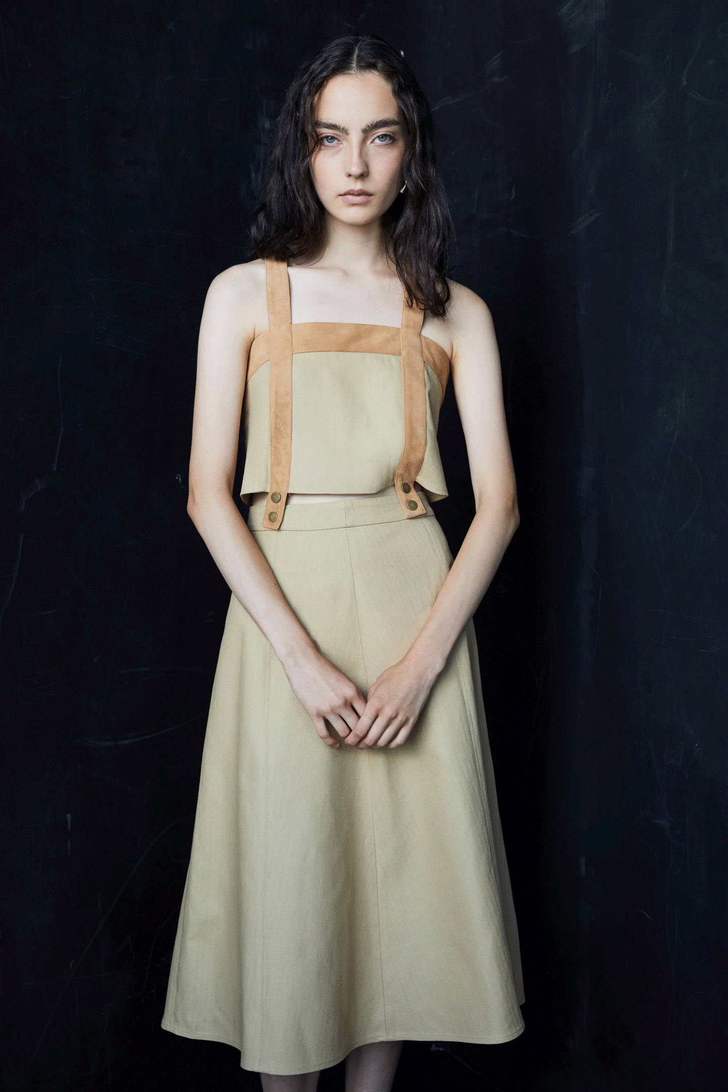 This signature look for the collection is a stunner. The delicately constructed two-piece ensemble embodies the brand’s philosophy of playful yet thoughtful design. The sharp, geometric cut of the top features a signature square neckline with baby lambskin suede straps. The top’s suede straps have two metal snaps in the front and the back which fasten at the skirt’s waistband, allowing you to choose the length you prefer The straps at the back of the top criss-cross adding another surprise design detail. The accompanying A-line skirt boasts a flared hem created by vertical panels for a flattering and elongated silhouette; and, the irresistible herringbone texture of the fabric adds a touch of richness and invites a closer look, proving that simple forms and rich textures are the perfect combination. This versatile set can be worn together or separately, always with intention, reflecting Nish Niche’s commitment to creating sophisticated, timeless and unique pieces.