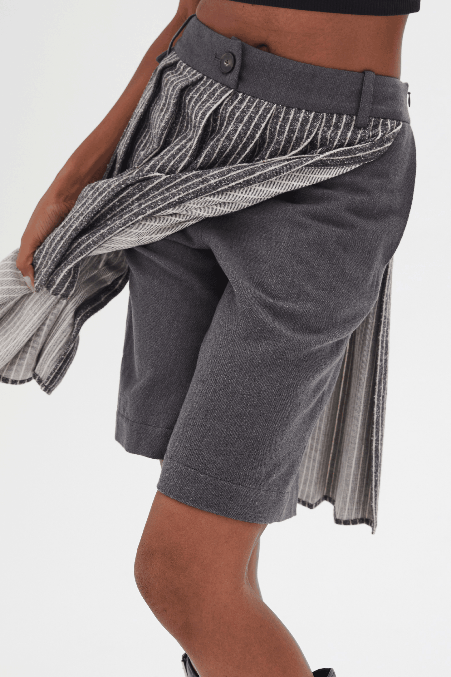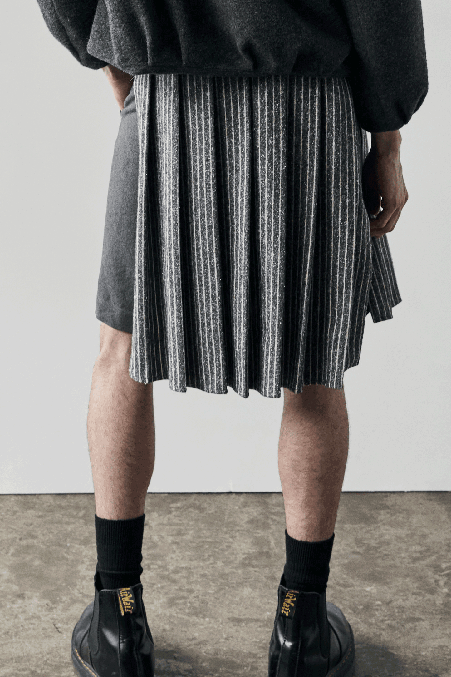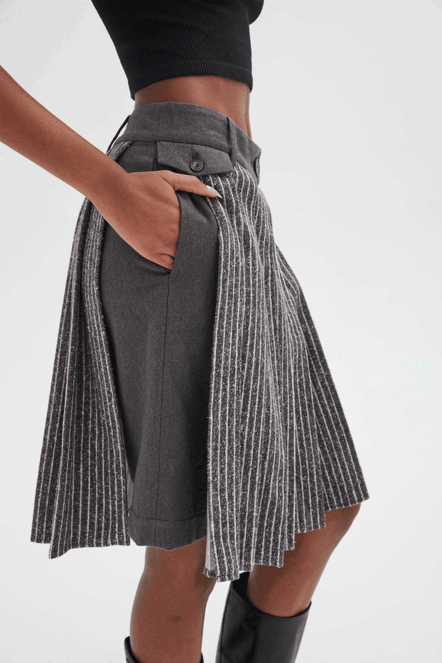 This unique, knee-length silhouette combines pinstriped, pleated panels on top of gray shorts and may evoke memories from your school days. It’s suitable for all body types and anyone who wants to twin with a friend or just have fun! The two pleated panels are made from a soft, hand-feel blended fabric which have been inserted into the waist band cover in the front and back sections of the shorts. Other design elements include a side flap pocket with a small horn button below the waist band and a side zipper. From afar it looks like a kilt, but give it a twirl, and the shorts stand out - you are ready for any kind of action! Break through the crowds with this thoroughly modern look that can be worn by anyone if you dare!