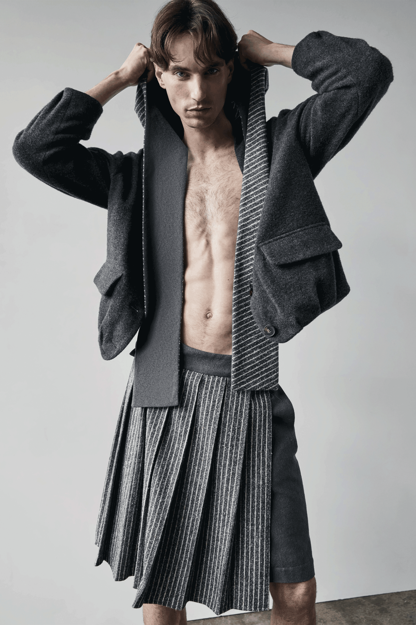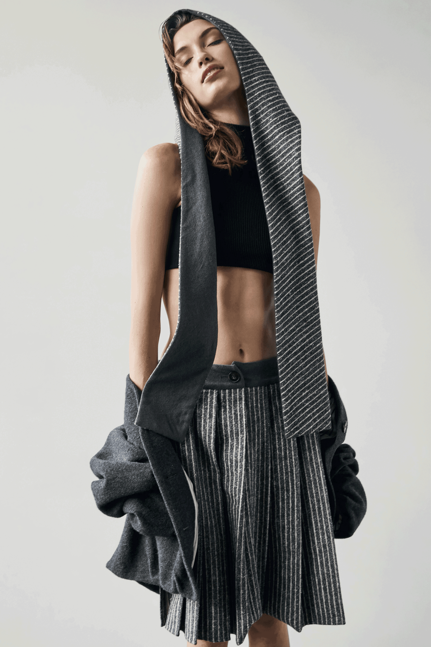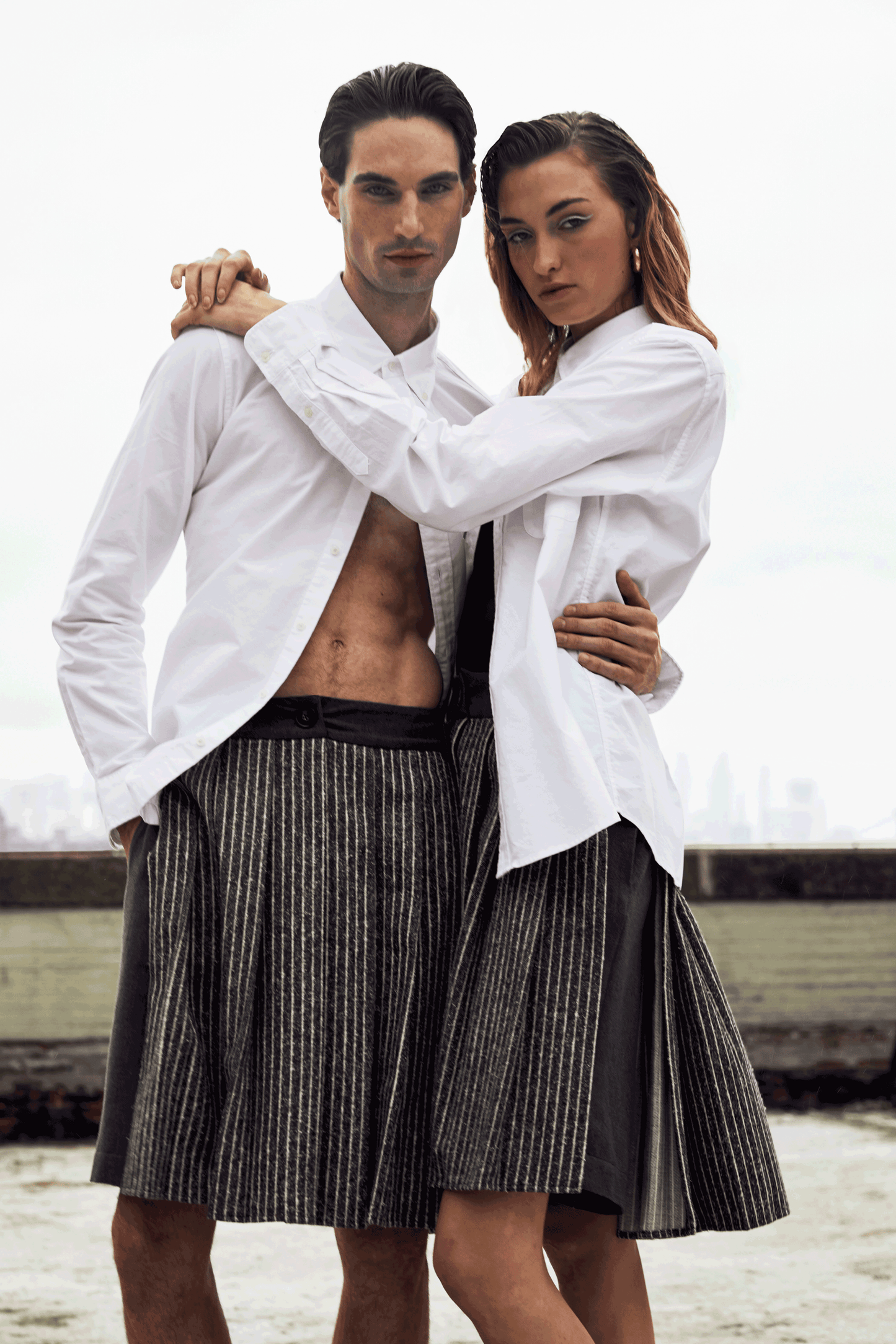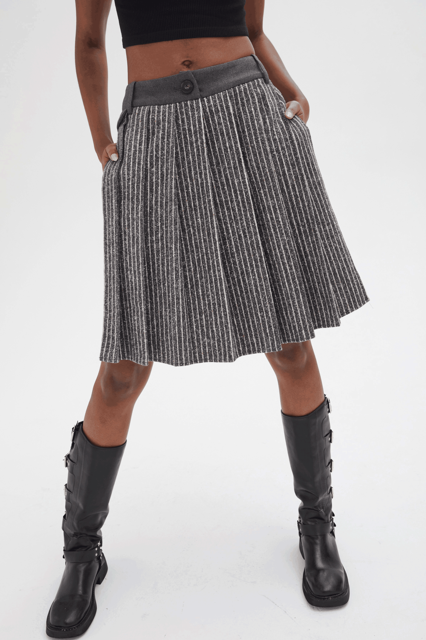 This unique, knee-length silhouette combines pinstriped, pleated panels on top of gray shorts and may evoke memories from your school days. It’s suitable for all body types and anyone who wants to twin with a friend or just have fun! The two pleated panels are made from a soft, hand-feel blended fabric which have been inserted into the waist band cover in the front and back sections of the shorts. Other design elements include a side flap pocket with a small horn button below the waist band and a side zipper. From afar it looks like a kilt, but give it a twirl, and the shorts stand out - you are ready for any kind of action! Break through the crowds with this thoroughly modern look that can be worn by anyone if you dare!