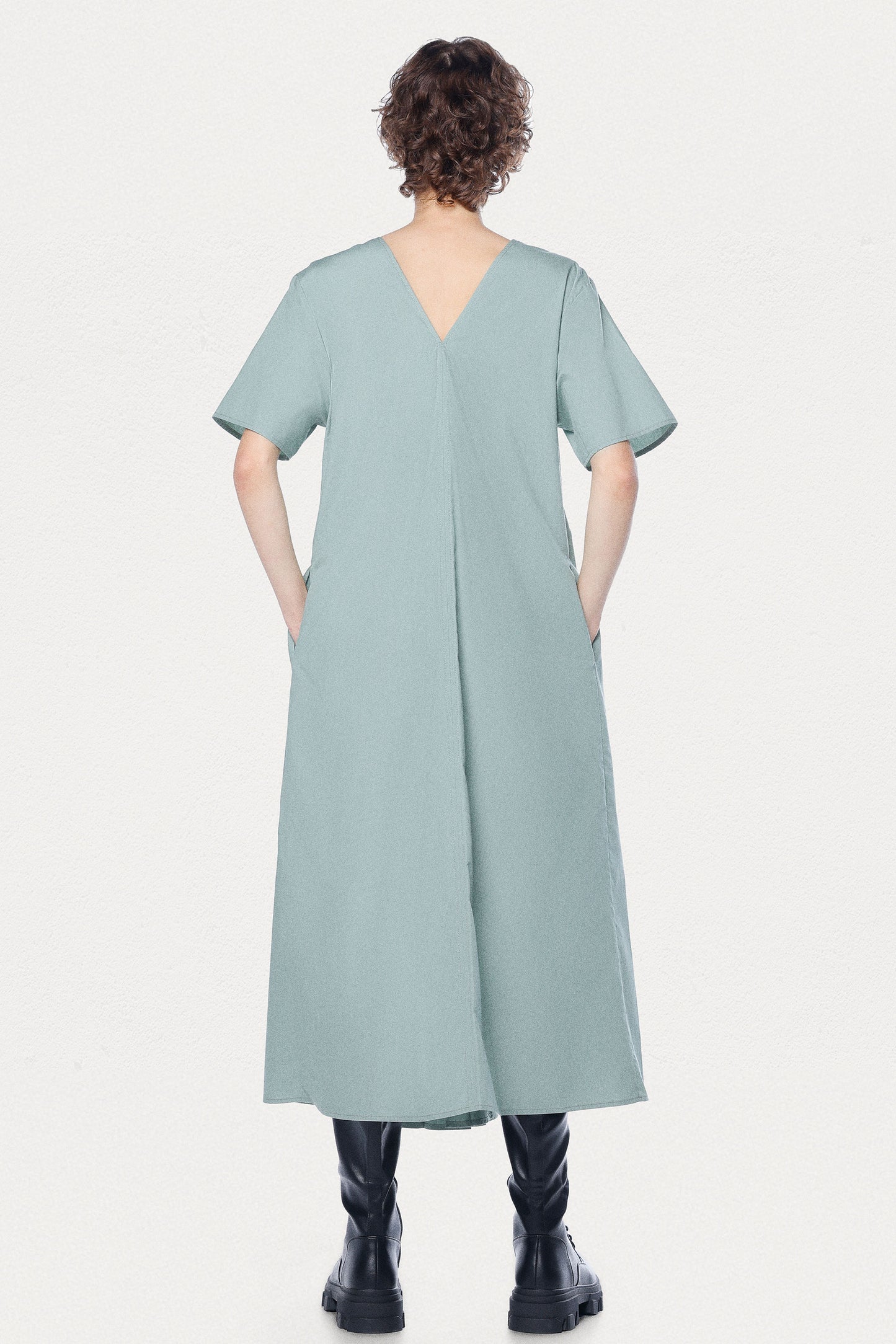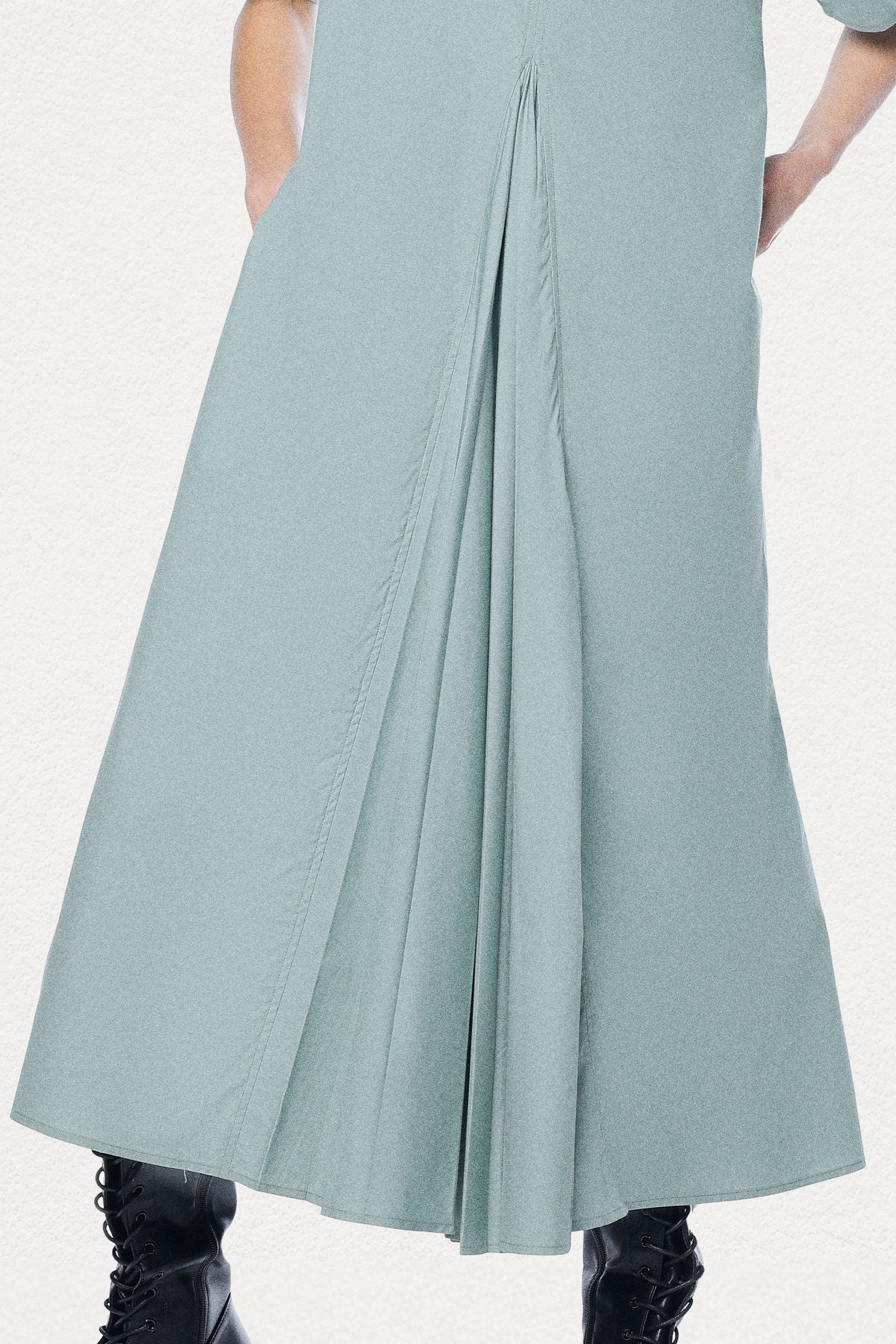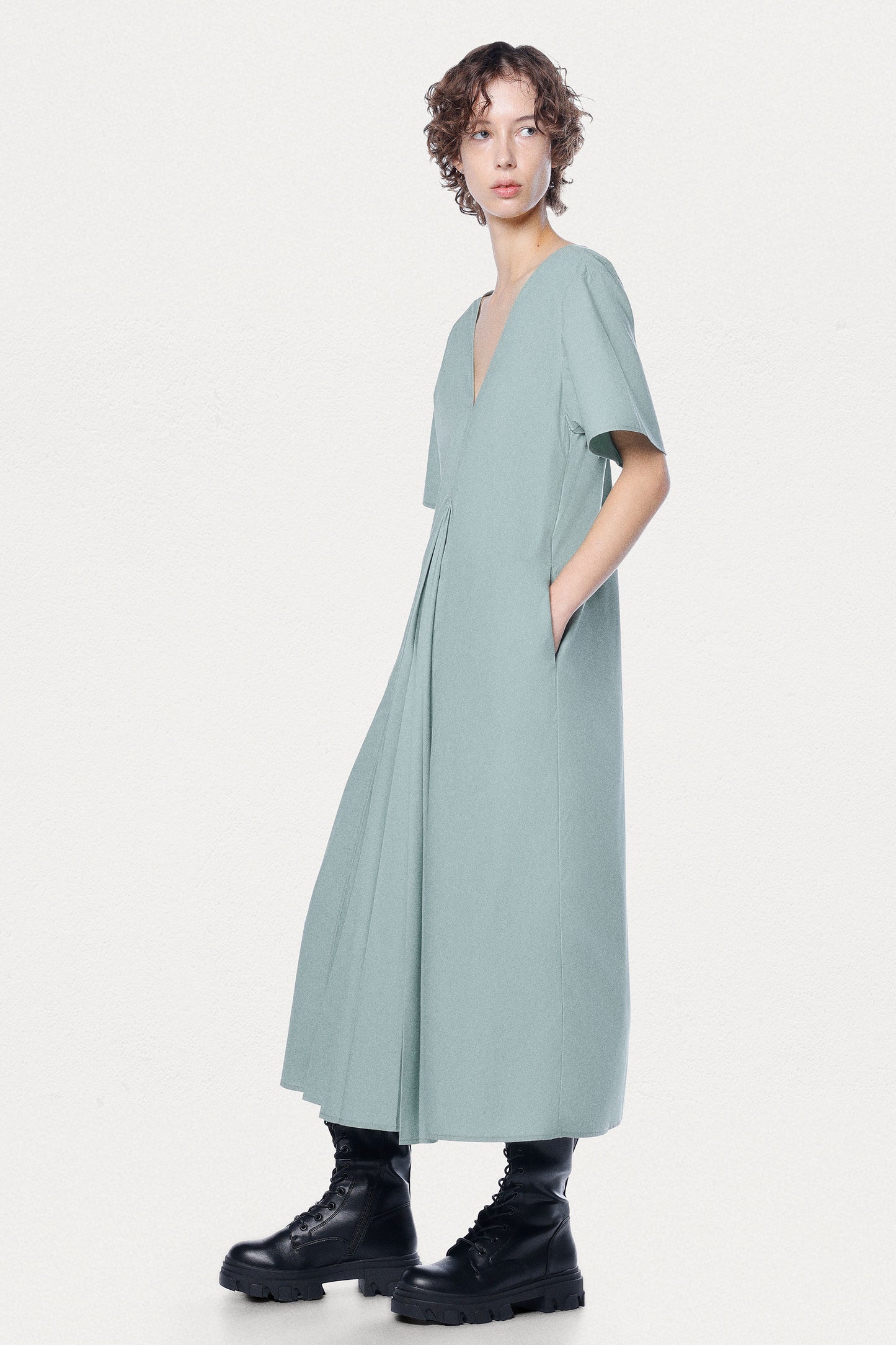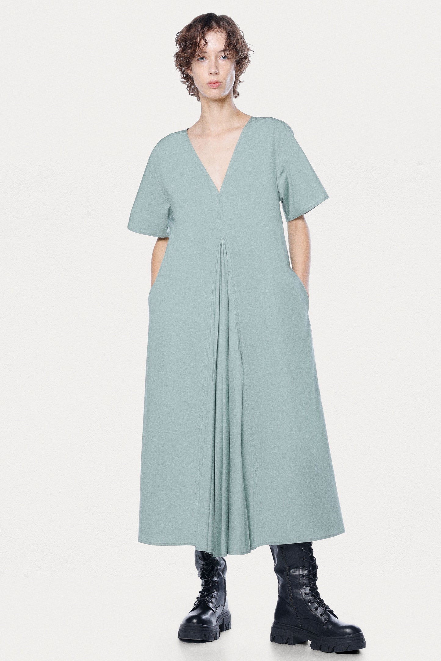 Our mid-length Flight Dress, in a beautiful sage green cotton fabric combines effortless style with unmatched comfort, making it a must-have for your wardrobe. Featuring a loose, voluminous shape, square sleeves, and a sophisticated V-neckline, this dress seamlessly transitions from day to night. The delicately crafted front pleats add a graceful unexpected flow, ensuring a relaxed and elegant fit. Whether you’re exploring the city or dancing the night away, this dress offers versatility and ease.