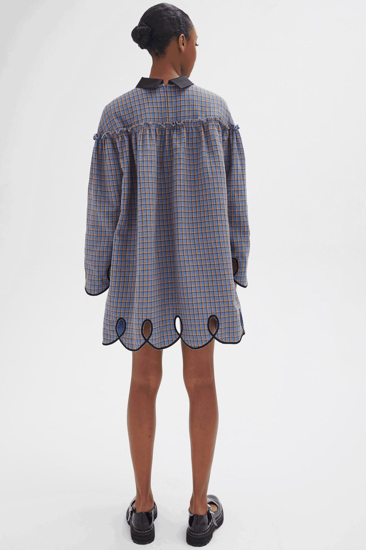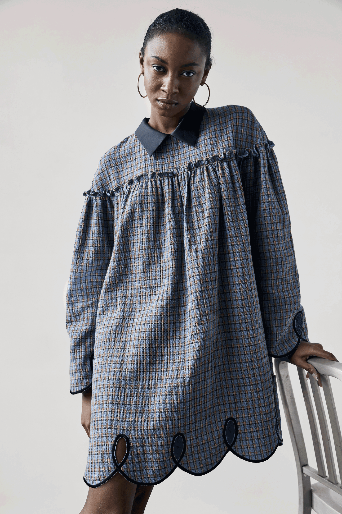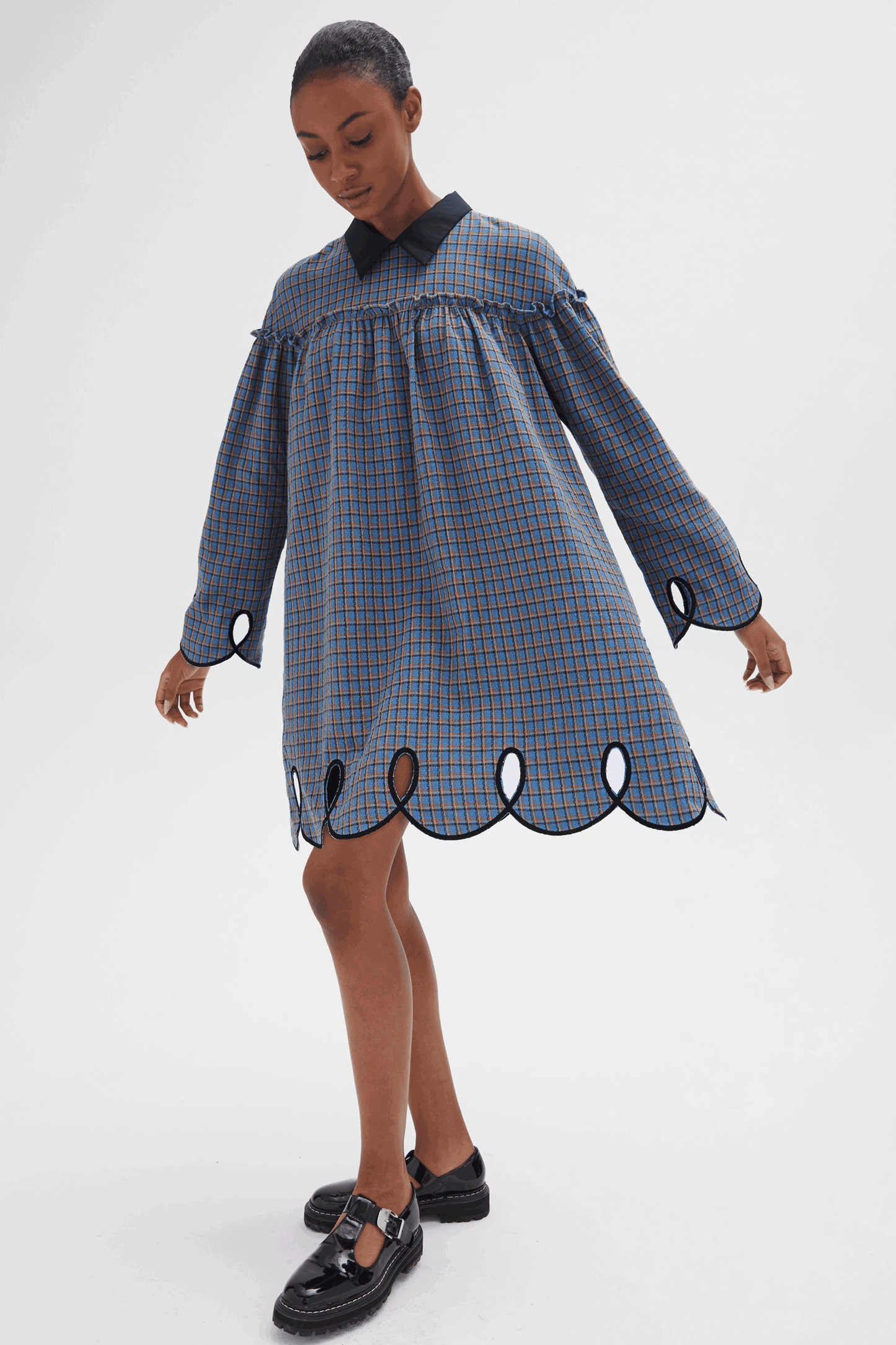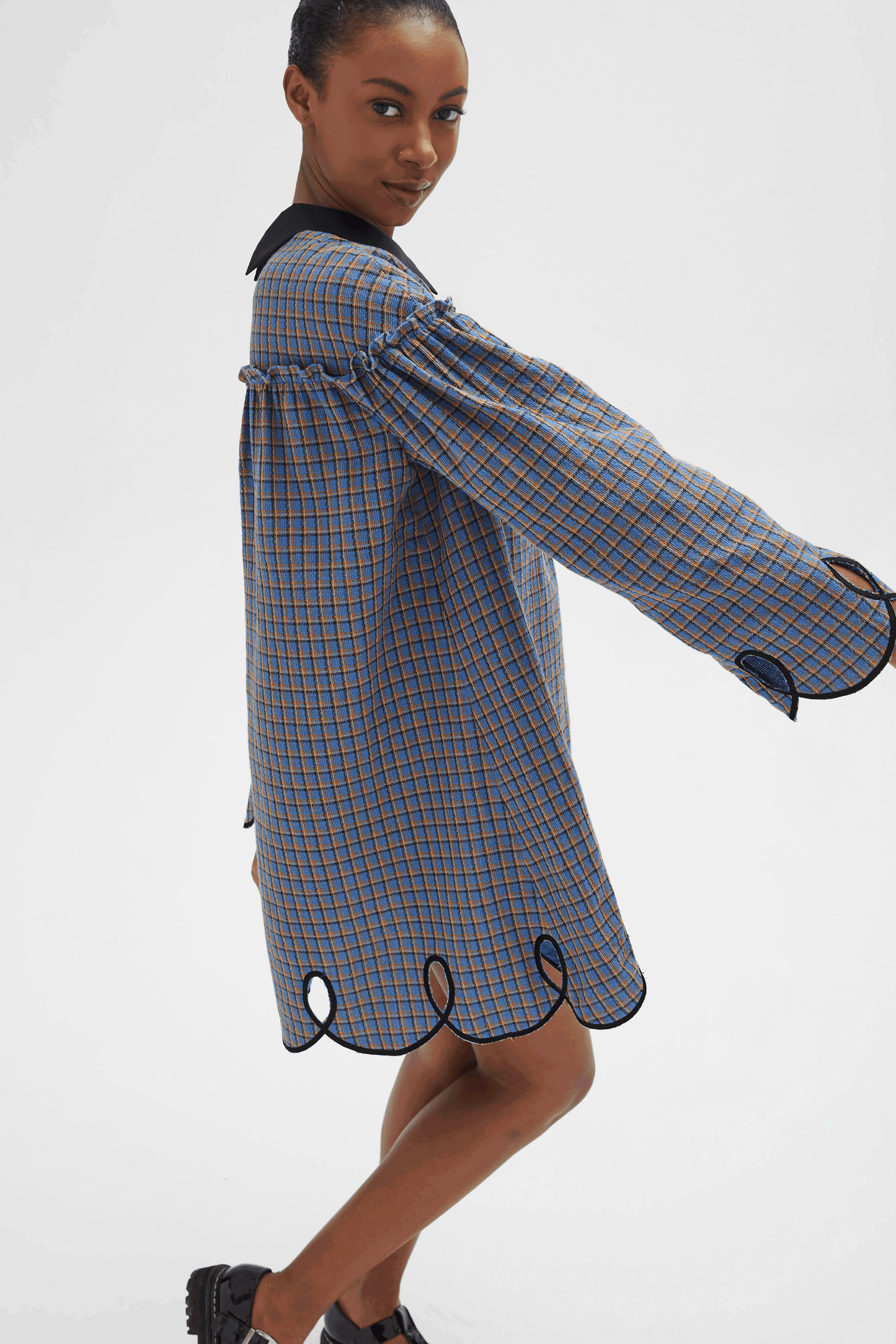 Flirtatious and feminine, this oversized blue-checked, A line dress is perfect for work, lunch with friends or a night out on the town. The elasticized bell sleeve opening provides slip-on comfort while the contrast black collar and scallop-embroidered hemline and cuffs create a unique and impactful contrast pop of color. Ruching at the chest yoke provides another distinctive design element. This knee length dress is guaranteed to show all sides of your personality.