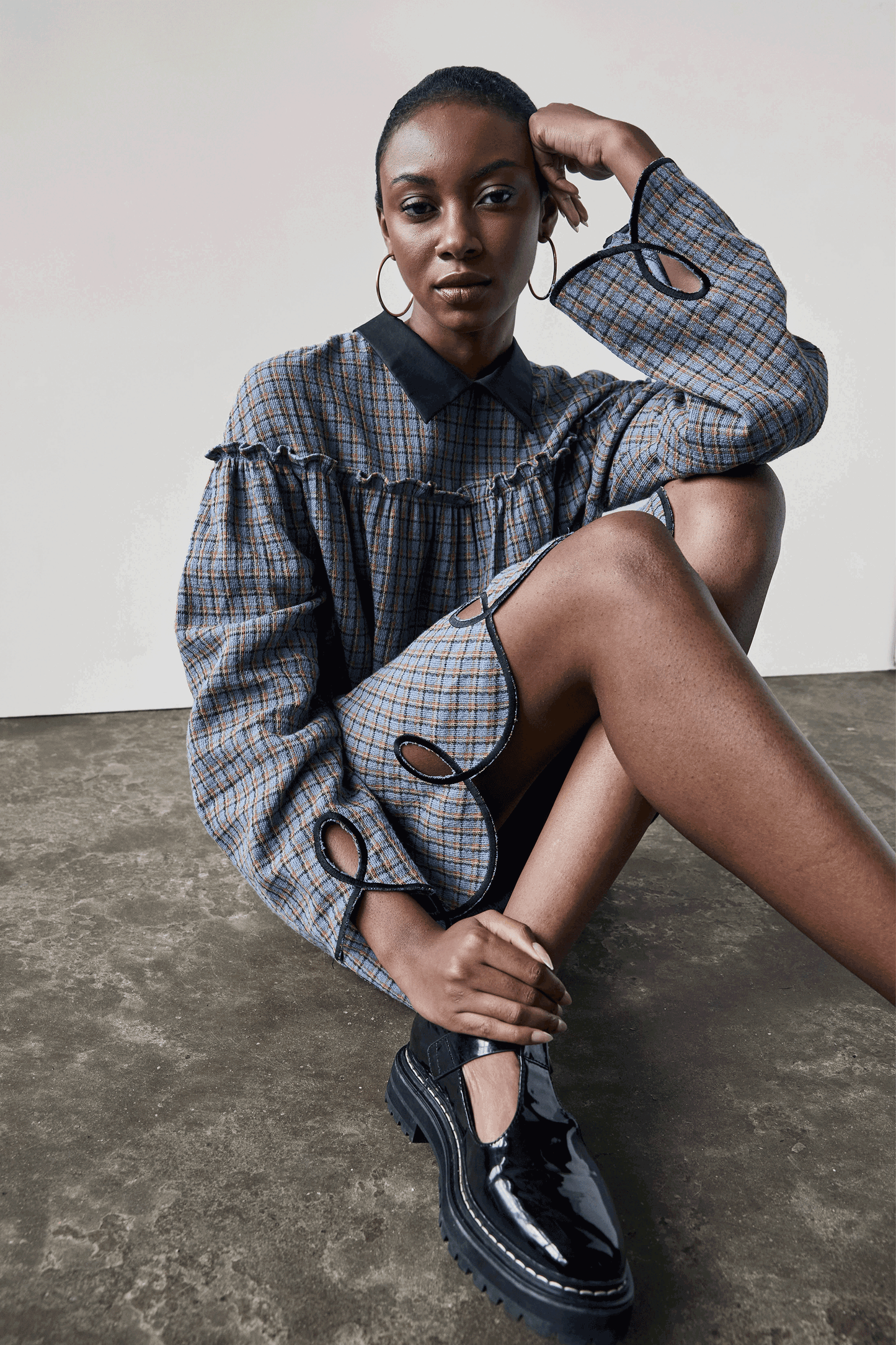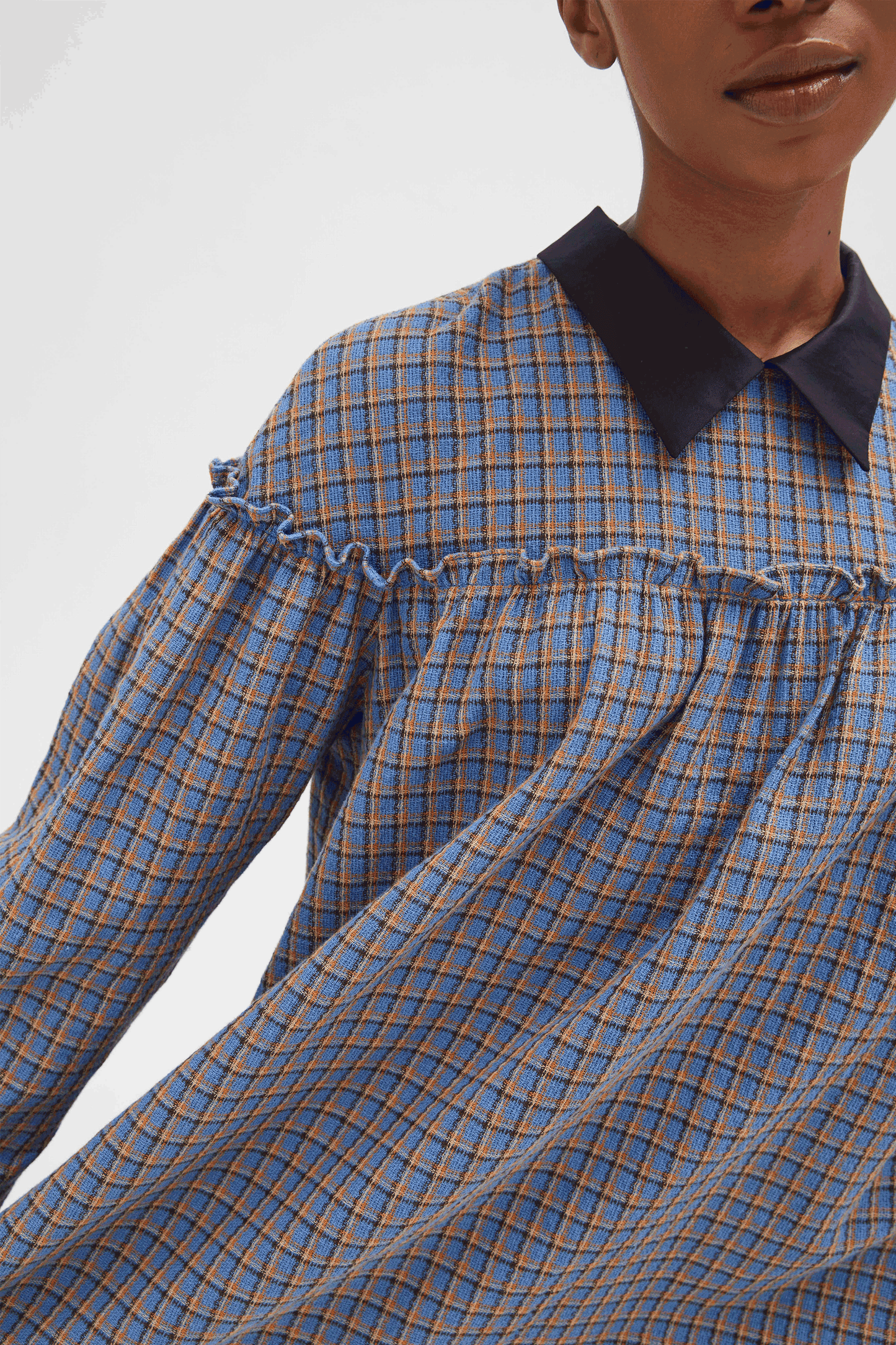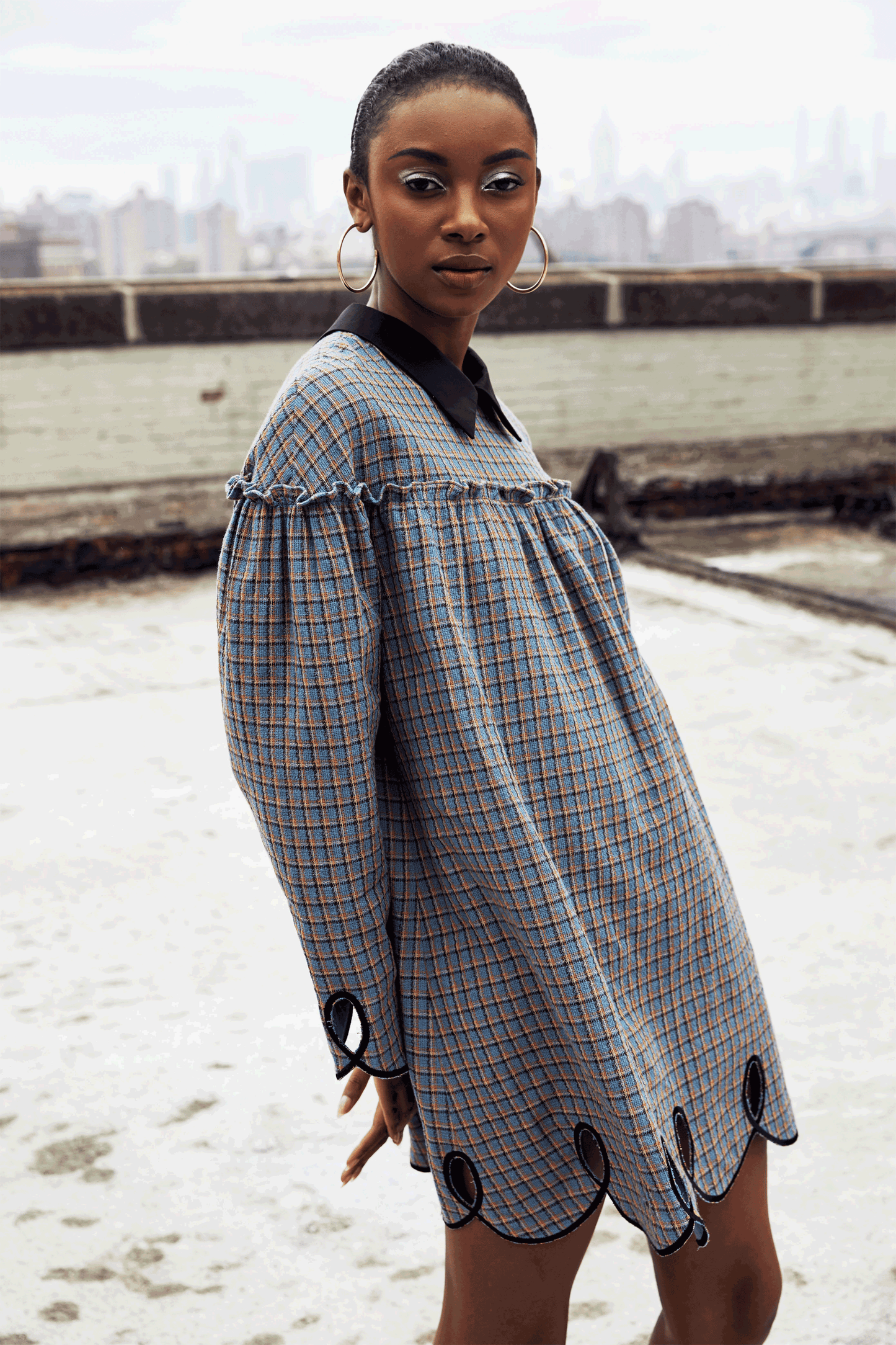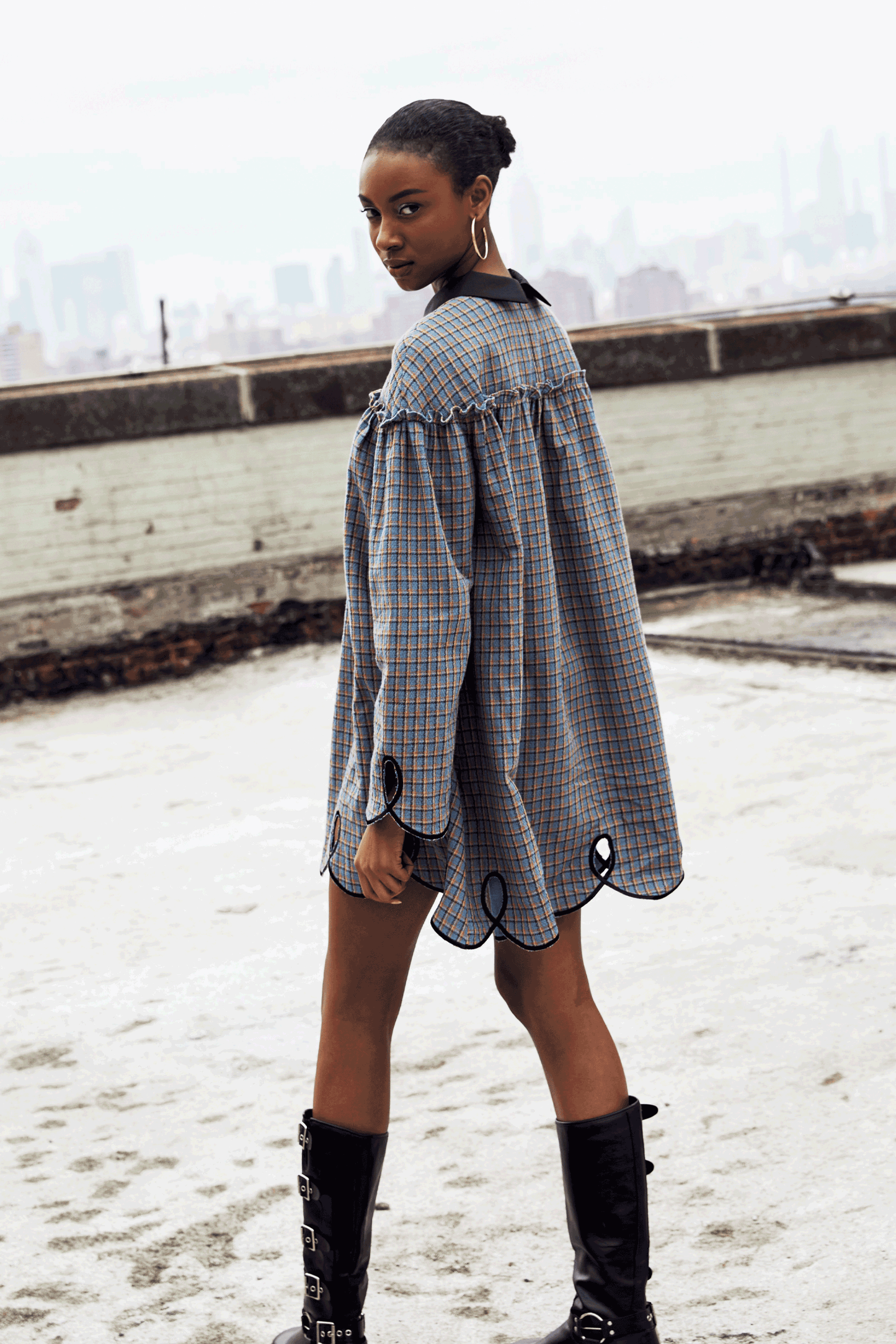 Flirtatious and feminine, this oversized blue-checked, A line dress is perfect for work, lunch with friends or a night out on the town. The elasticized bell sleeve opening provides slip-on comfort while the contrast black collar and scallop-embroidered hemline and cuffs create a unique and impactful contrast pop of color. Ruching at the chest yoke provides another distinctive design element. This knee length dress is guaranteed to show all sides of your personality.